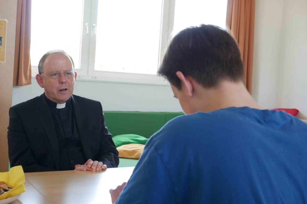 In der Teestube wartet danach mit Damian Arnold ein Teil der Chefredaktion der Schülerzeitung Espresso für ein längeres Interview. Damian erkundigte sich über die Einstellung des Bischofs zu aktuellen kirchenpolitischen Themen und nahm dabei insbesondere die Jugendlichen in den Fokus. Bischof Ulrich Neymeyr antwortete offen und bereitwillig, bezog Stellung und begründete seine Positionen ausführlich. In der nächsten Ausgabe der Espresso wird davon ausführlich zu lesen sein, versprach Damian.