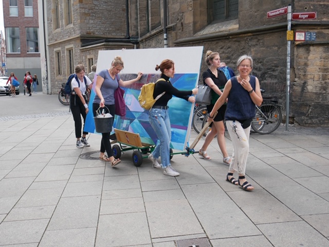 Die Projektgruppe URBAN ART unter der künstlerischen Leitung von Sabine Heinrich hatte sich zu den Projekttagen einer speziellen Herausforderung gestellt. In Absprache mit der Stadt gestalteten sie ein Wandbild mit dem Motiv der Zweiten Erfurter Synagoge. Das Bild lehnt sich an eine kleine Strichzeichnung der Zweiten Erfurter Synagoge an, welche im späten Mittelalter etwa 100 Jahre wahrscheinlich südlich der Kleinen Synagoge stand. Dort ist heute eine Garage des Fuhrparks der Stadt, die durch dieses Bild eine angemessenere Gestaltung erfahren hat. Stilistisch orientiert sich die Gestaltung deutlich an der Formensprache Feinigers an und versteckt in diesen kristallinen Formen auch einen Davidstern als Hinweis auf das zerstörte jüdische Gotteshaus. Das erfolgreiche Ergebnis der Projektarbeit der Schüler kann nunmehr vor Ort betrachtet werden und soll Passanten an einen weiteren historischen Ort in der Stadt erinnern.