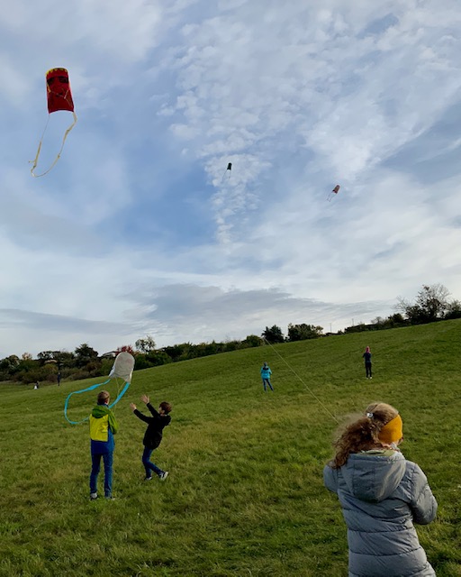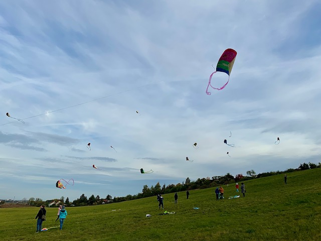 Auch dieses Jahr haben wir wieder Drachen gebaut: einen Tag gemeinsam mit Mathe- und KunstlehrerIn. Die Achsenspiegelung haben die Kinder zuerst im Kleinen geübt und dann im Großen am Drachen erprobt. Die Klasse 5d hat im Matheunterricht nicht nur eine Drachenform, sondern gleich ein ganzes „Haus der Vierecke“ gestaltet. Am Projekttag konnten die Kinder sofort erkennen, dass hier Drachenviereck und Rechteck gemeinsam am Start sind. Dann musste der Drachen symmetrisch und möglichst leicht gebaut und bemalt werden, damit er fliegen kann. Das ist den Kindern der Klassen 5 a und 5d auch sehr gut gelungen. Für die Klasse 5a hat sich sogar die Möglichkeit ergeben, die selbst gebauten Drachen gemeinsam steigen zu lassen. Wetter, Windstärke, Gesundheit und die Zeiten von Kunstlehrerin und Mathelehrer passten zusammen. Es könnte die beste Mathestunde des Lebens gewesen sein. Am Galgenberg tummelten sich abwechselnd 24 Drachen am Himmel.