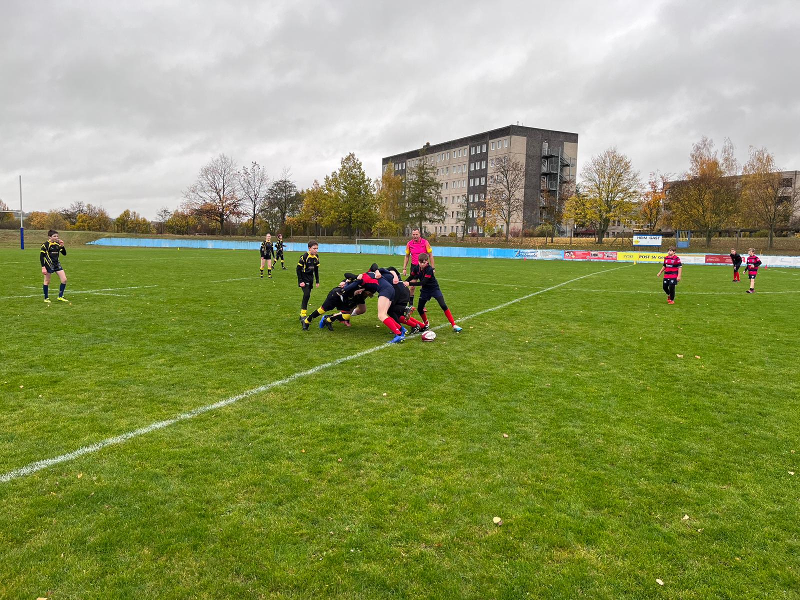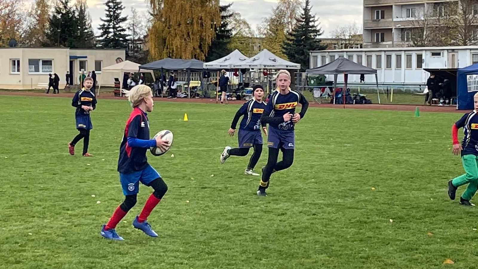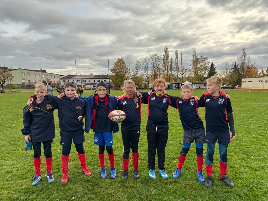 Die U12 sah sich in einem 5er Teilnehmerfeld weitaus größeren Aufgaben gegenüber. Gegen den RC Dresden und die Berliner Gäste des SC Siemensstadt gab es trotz großen Kampfes nicht viel zu holen und beide Spiele wurden klar verloren. Ganz anders sah es gegen die Spielgemeinschaften Halle/Jena sowie Leipzig/Gera aus. Hier stand es bis zum Schluss auf Messers Schneide, doch wie auch zuletzt beim Heimturnier fehlte noch ein Quäntchen Abgezocktheit, um die Spiele für sich zu entscheiden. Beide wurden mit jeweils einem Versuch aus der Hand gegeben. Dennoch war sowohl im Team als auch beim Trainergespann die Stimmung bestens, ließen sich trotz der Niederlagen doch tolle Entwicklungen innerhalb der noch jungen Mannschaft ausmachen, was auch die Spieler*innen spürten.