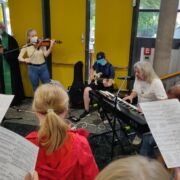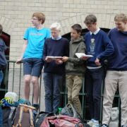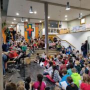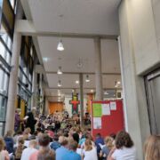 Weniger Glück hatten die 7. und 8. Klassen, denn direkt im Anschluss an den ersten Gottesdienst regnete es sich richtig ein. Also wurde der zweite Gottesdienst spontan in das Foyer der Schule verlegt. Dort durften sich aufgrund der Abstände aber nun nur die 5. Klassen und zwei 6. Klassen einfinden. (Für die 7. und 8. Klasse wird schnellstmöglich der Gottesdienst geplant und stattfinden.)