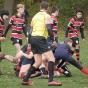 Nach vielen Erfolgen im 7er Rugby mischt der Edith-Stein-Schulsportverein gemeinsam mit dem RC Leipzig nun auch auf der großen Bühne des Sports mit. Zum Auftakt in die Premierensaison der Deutschen U16 Jugendliga/Staffel Ost wartete in der Berliner Jungfernheide mit dem Berliner Rugby Club gleich der dickste Brocken der Liga. Der BRC ist zahlenmäßig einer der größten Rugbyvereine Deutschlands und konnte in seiner Vereinsgeschichte bereits 35 Deutsche Meistertitel im Nachwuchsbereich verbuchen. Von allzu großem Respekt war dennoch seitens der Spielgemeinschaft nicht viel zu spüren. Direkt nach Anpfiff startete die starke Vordermannschaft eine furiose Angriffswelle und setzte sich mehrere Minuten in der gegnerischen 22m Zone fest, leider letztlich ohne Punkte mitzunehmen, da auch ein Straftritt aus der Distanz nicht sein Ziel zwischen den Goalstangen fand. Nachdem die Berliner kurz durchgeatmet hatten, gingen sie ihrerseits in den Angriffmodus über und konnten sich mit zwei Versuchen und einer Erhöhung etwas Luft verschaffen. Doch lange blieb die Null auf der Seite der Gäste nicht stehen. Einen schönen Durchbruch des Sturms vollendet Samu Zeh mit einem tollen Lauf und dem historisch ersten Versuch der sächsisch-thüringischen Spielgemeinschaft in der Deutschen Jugendliga. Auch wenn beim Stande von 12:5 in der Mitte der ersten Halbzeit noch einmal Hoffnung aufkeimte, ließen die Hausherren bald keinen Zweifel mehr daran, wer hier als Sieger vom Platz gehen würde. Den Sturmläufen der Spielgemeinschaft setzten sie ihre eigene Physis entgegen, waren in den Rucks in dieser Phase oft einen Tick schneller am Ball und konterten im Gegenzug die Erfurter und Leipziger über ihre schnelle Außen eiskalt aus. Nach zwei weiteren erhöhten Versuchen ging es mit 26:5 in die Halbzeitpause.