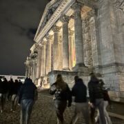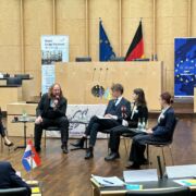 Die Plenardebatte wurde dann pünktlich am Mittwoch vom Präsidium im Bundesrat eröffnet. Die irische Delegation durfte hier nun ganz stolz auf den Plätzen der Thüringer Politiker Platz nehmen. Nach einer Fishbowl-Diskussion mit Anton Hofreiter, begannen dann die Plenardebatten. Zur Stärkung ging es zum Mittagessen im Bundesfinanzministerium. Ein besonderes Highlight ist hier jedes Jahr der Paternoster. Nachdem drei Resolutionen angenommen und nur eine abgelehnt wurde, verließen wir dann den Bundesrat wieder und machten uns auf zum gemeinsamen Abendessen. Der Delegationsabend führte uns erst in ein asiatisches Restaurant und später in die Kuppel des Reichstagsgebäudes. Von dort oben konnten wir mit einem angenehmen Blick über Berlin den Abend ausklingen lassen. Der letzte Tag der Sitzungswoche ist angebrochen. Die Delegierten haben noch einmal all ihren Ehrgeiz zusammengenommen und argumentieren stark für und gegen die Resolutionen. Es wurden nachhallende Reden gehalten und abgestimmt.