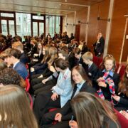 MEP – auf den ersten Blick eine etwas seltsame Abkürzung. Doch hinter diesen drei Buchstaben verbergen sich Emotionen, schlaflose Nächte und hitzige Debatten. Warten Sie, bis der MEPFunke auch auf Sie überspringt! Gerade in den letzten Jahren ist es immer wichtiger geworden, junge Menschen frühzeitig an weltpolitische Themen heranzuführen. Sei es der Russland-Ukraine-Konflikt oder der NahostKonflikt – wegschauen bringt nichts! Themen wie künstliche Intelligenz, inklusive Gesellschaft oder eben der Nahostkonflikt sind aktueller denn je. Das Planspiel bietet hier eine Plattform für junge Menschen, sich intensiv darüber auszutauschen und die eigene Meinungsbildung zu fördern. Jedes Jahr im März kommen deshalb Schüler aus ganz Deutschland (in diesem Jahr auch aus Luxemburg, Tschechien, Österreich und Belgien) in Berlin zusammen, um gemeinsam das Planspiel zu spielen. Die Sitzungswoche ist in 8 Ausschüsse organisiert, die an den ersten beiden Tagen der Woche zunächst eine Resolution erarbeiten. Am Mittwoch und Donnerstag werden diese dann im großen Plenum diskutiert und abgestimmt. Vor den Osterferien war es für die irische Delegation soweit. Acht Delegierte, Leonor als Ausschussvorsitzende, Charlotte als Präsidentin und Herr Burckhardt, reisten am Sonntag gemeinsam in die Hauptstadt. Nach der Ankunft und dem Mittagessen begann die Ausschussarbeit. Es wurden Sketche und kleine Präsentationen vorbereitet, um den übrigen Teilnehmern das jeweilige Ausschussthema vorzustellen. Am Abend fand die Jubiläumsfeier des Vereins statt, denn das MEP besteht seit 25 Jahren. Wir hörten verschiedene Redner, darunter auch Emily Fonts, die jüngste Bundestagsabgeordnete, die ihre Karriere beim MEP begann. Nach einem unterhaltsamen Abendprogramm des Alumni-Teams fielen wir schließlich alle müde in unsere Betten.