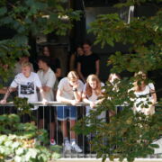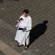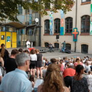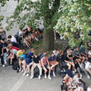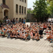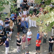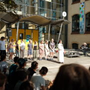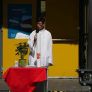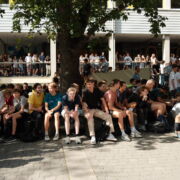 Bei hochsommerlichsten Wetter war das Fest Mariä Himmelfahrt ein guter Aufhänger zur Begrüßung des neuen Schuljahres. Die Schülerschaft hatte sich weitestgehend in den Schatten der Kastanien zurückgezogen oder lauschte vom überdachten Pausenhof den Worten der Schulseelsorgerin, des Schulleiters oder der beteiligten Oberstufenschüler*innen. Vor allem die neuen 5. Klassen ließen es sich jedoch nicht nehmen, dem Geschehen unmittelbar beizuwohnen und sich auf den Plätzen vor dem provisorischen Altarraum zu tummeln. Dort stimmten sie auch als erste in den Gesang ein und so dürften während des Gottesdienstes ungewohnt melodische Geräusche auch dank der technischen Verstärkung vom Schulhof in die Nachbarbarschaft gedrungen sein.