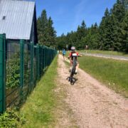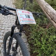 Letzte Etappe vom Rennsteig hinab nach Hörschel. Margarete passiert die kleine Siedlung Kießling. Tour de France Stimmung bei den Einwohnern. Girlanden, Luftballons, Biertische, Wasserschläuche zur Kühlung und Rufe der Motivation und Begeisterung, wie schön ist das denn. Das Highlight: es werden liebevoll gestaltete, selbstgebastelte Holzmedaillien verteilt. Herzlichen Dank an alle Kießlinger!
