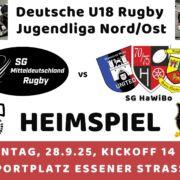 Die U18 hat zwar teilweise in den letzten beiden Jahren schon Erfahrung auf dem höchsten Niveau sammeln können, mit jedoch nur einem gemeinsamen Vorbereitungstraining und Spielern aus fünf Vereinen standen die Vorzeichen nicht besonders gut. Schließlich erwartete man mit der Spielgemeinschaft aus Bonn, Wiedenbrück und Hannover ein Mannschaft, die mit den Hannoveranern aus Vereinen einer der Deutschten Rugby Hochburgen aufwarten konnten. So waren die Thüringer und Sachsen in ersten zwanzig Minuten auch primär damit beschäftigt sich selbst zu sortieren und ihren Rhythmus zu finden. Die SG HaWiBo nutzte dieses Abwarten eiskalt aus und ging nach Ballverlusten und verpassten Tacklings mit vier Versuchen in Führung. Dann schien der Kampfgeist endlich erweckt zu sein. Bis zur Halbzeit und in den 15 Minuten danach gelang es kein weiteres Mal, die Defensive der SG Mitteldeutschland zu durchbrechen. Die Gedränge wurden zwischenzeitlich dominiert und auch in den Gassen kehrte etwas Sicherheit ein. Der Gast wurde in seiner eigenen Hälfte festgemacht und nach intensivem Anrennen, schnellen Transfers und einem starken Offload konnte Alexis aus Roßleben spektakulär in der Ecke eintauchen und noch vor der Halbzeit einen vielumjubelten Anschlussversuch legen. Leider belohnte sich die heimische SG in dieser dominierenden Phase nicht weiter und gab dann in der letzten Viertelstunde wieder das Heft aus der Hand. Das Endergebnis von 5:45 spiegelt demnach nur bedingt die Leistung der großen Jungs wieder, zeigt aber auch das Niveau, auf das sich die U18er in der Liga einstellen können. Das Team und die Trainer waren mit ihrer Leistung dennoch weitestgehend zufrieden und auch die zuschauende Männermannschaft zollte Respekt für die Leistung. Kapitän Tim, der schon mehrere Spiele bei den Männern absolviert hat konstatierte nach dem Spiel, dass der Gegner es unheimlich schwer gemacht hat, eine Lücke zu finden, was ihm bei den Erwachsenen durchaus immer wieder gelingt. Durch ein Spieltausch wartet am 2.11.25 schon wieder die SG HaWiBo als nächster Gegner und das Ziel kann hier nur sein, an die Leistung anzuknüpfen und den ebenbürtigen Kampf über die gesamte Spielzeit abzuliefern.
