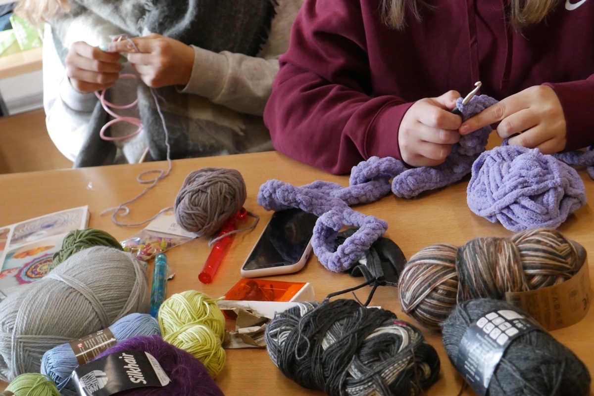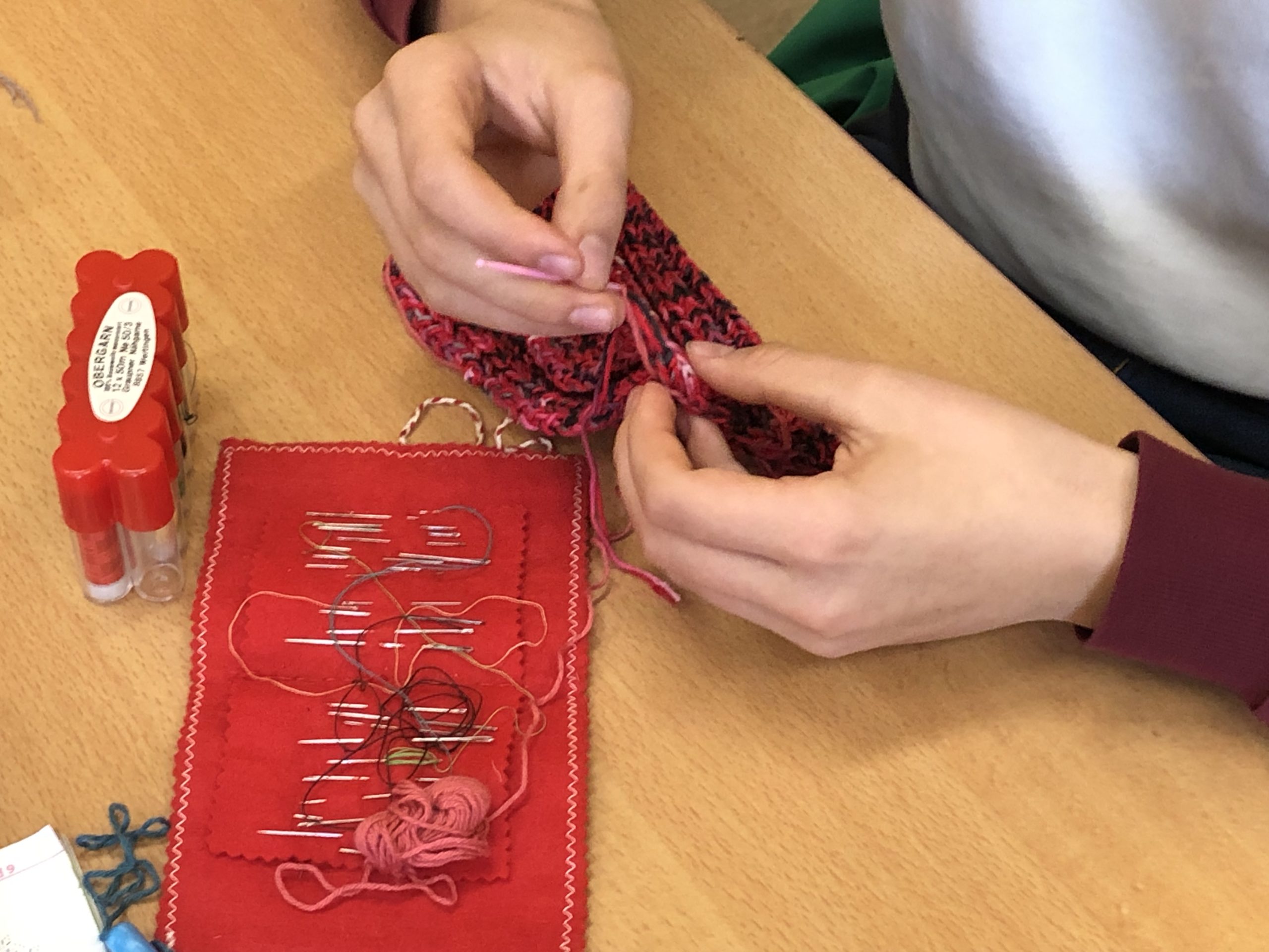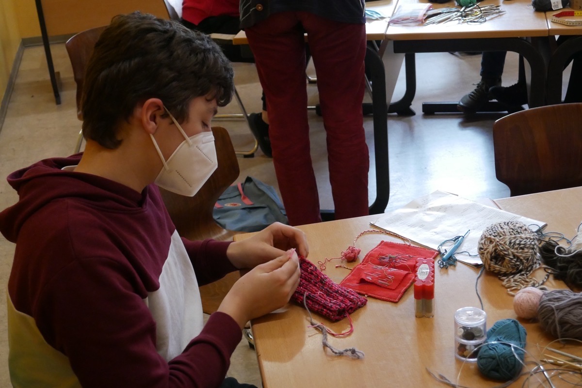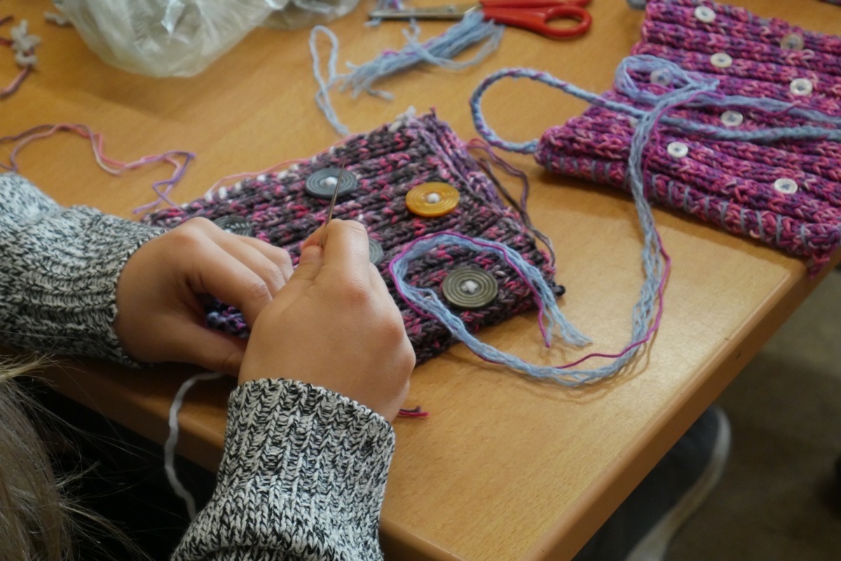 So gab es Möglichkeiten, sich entweder über Graffiti und Maskenbildnerei künstlerisch zu betätigen oder beim Darstellen und Gestalten Workshop verschiedene Sinne zu erfahren. Auch das Angebot, handarbeitlich aktiv zu werden, nutzten einige, um zu stricken und Taschen zu besticken.