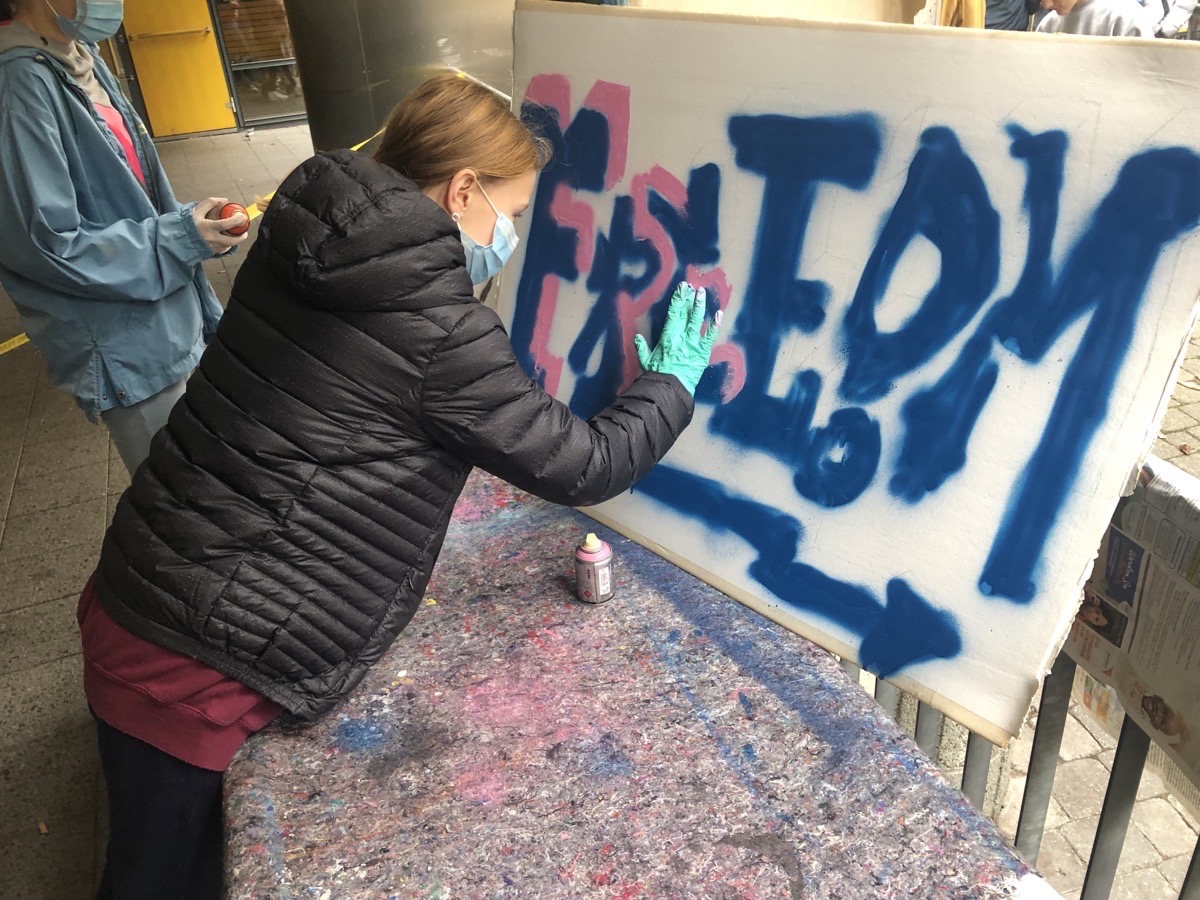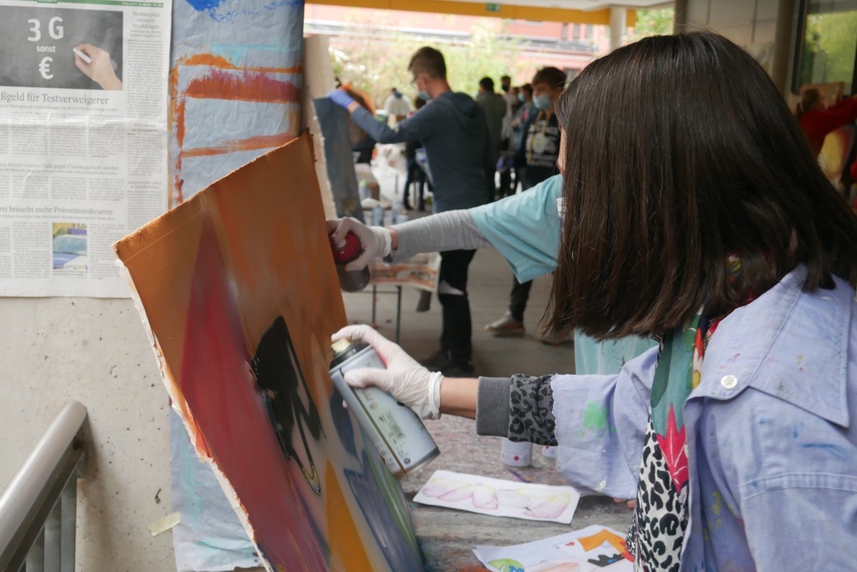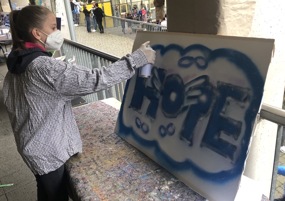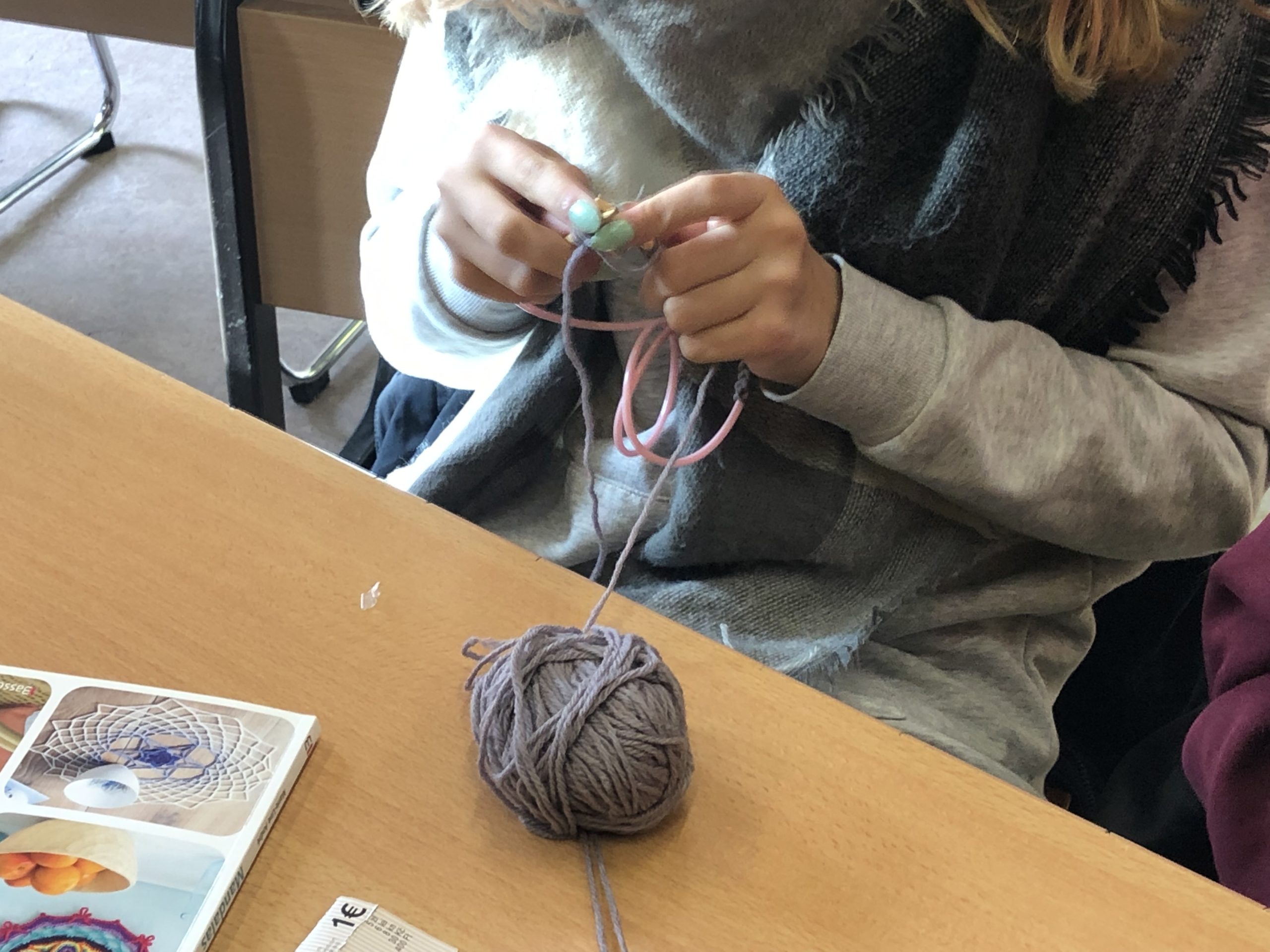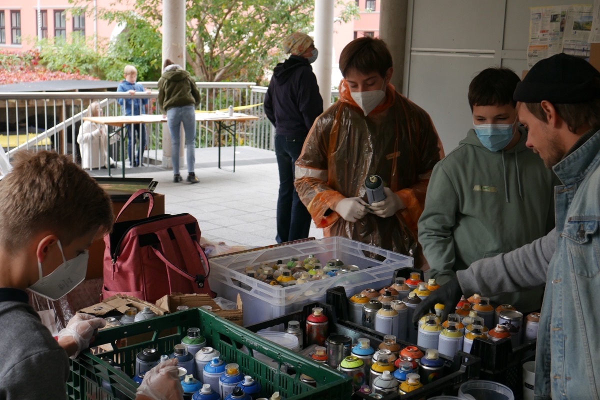 So gab es Möglichkeiten, sich entweder über Graffiti und Maskenbildnerei künstlerisch zu betätigen oder beim Darstellen und Gestalten Workshop verschiedene Sinne zu erfahren. Auch das Angebot, handarbeitlich aktiv zu werden, nutzten einige, um zu stricken und Taschen zu besticken.