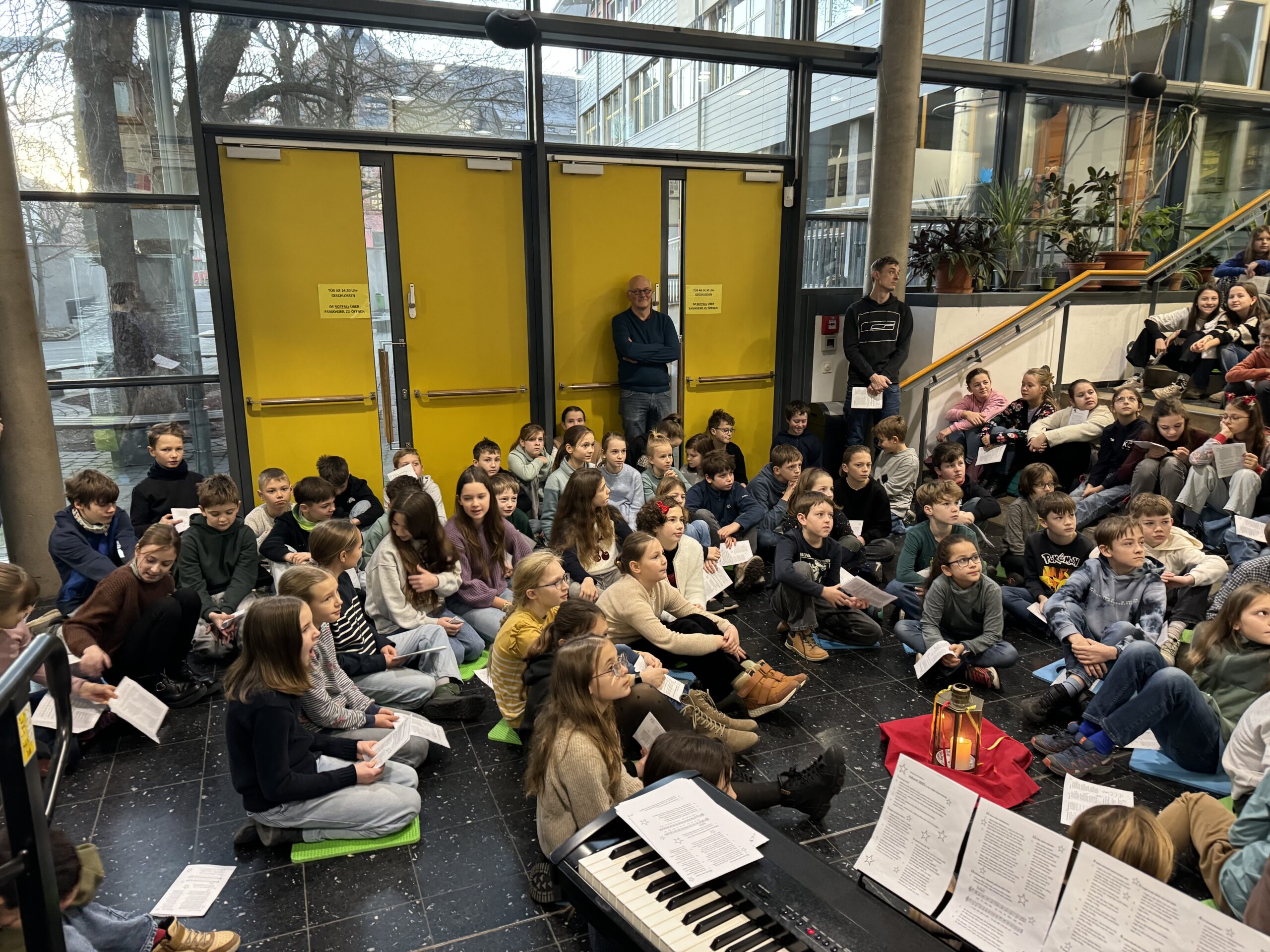 „Mache dich auf und werde licht …“, schallte es froh durch die frühen Morgenstunden der Edith-Stein-Schule. An jedem Montag im Advent kamen die Schülerinnen und Schüler der 5. und 6. Klassen im Foyer zum Adventsliedersingen zusammen.