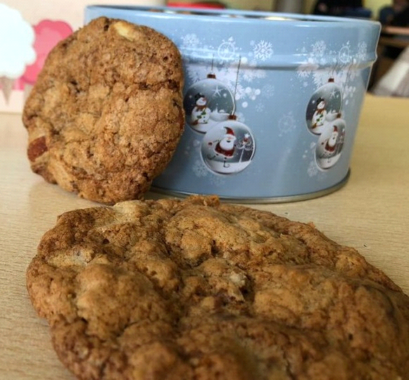 1) Speisestärke, Mehl, Natron, Zimt und Salz in einer Schüssel vermengen, Haferflocken hinzufügen. In einer zweiten Schüssel Schokolade und Mandeln mischen. 2) Die weiche Butter mit beiden Zuckersorten in einer Schüssel cremig aufschlagen, Eier nacheinander hinzugeben und unterrühren. Zuletzt Vanilleextrakt hinzufügen. 5) Cookies 10-13 Minuten backen (je nach Größe) und dann 10 Minuten abkühlen lassen. |