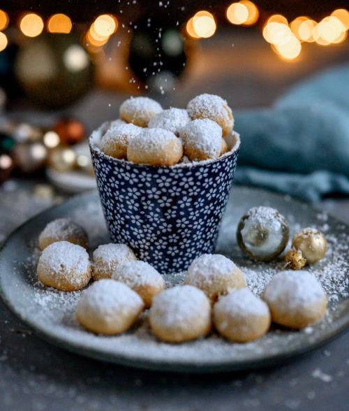 Teig in zum Beispiel Frischhaltefolie wickeln und im Kühlschrank zwei Stunden kühl stellen. Daumengroße Kugeln aus dem Teig formen und auf das Blech legen. Im vorgeheizten Ofen (170° Umluft) 5-8 Minuten backen. Auskühlen lassen und mit Puderzucker bestreuen. Luftdicht verpackt halten sie sich mehrere Wochen.