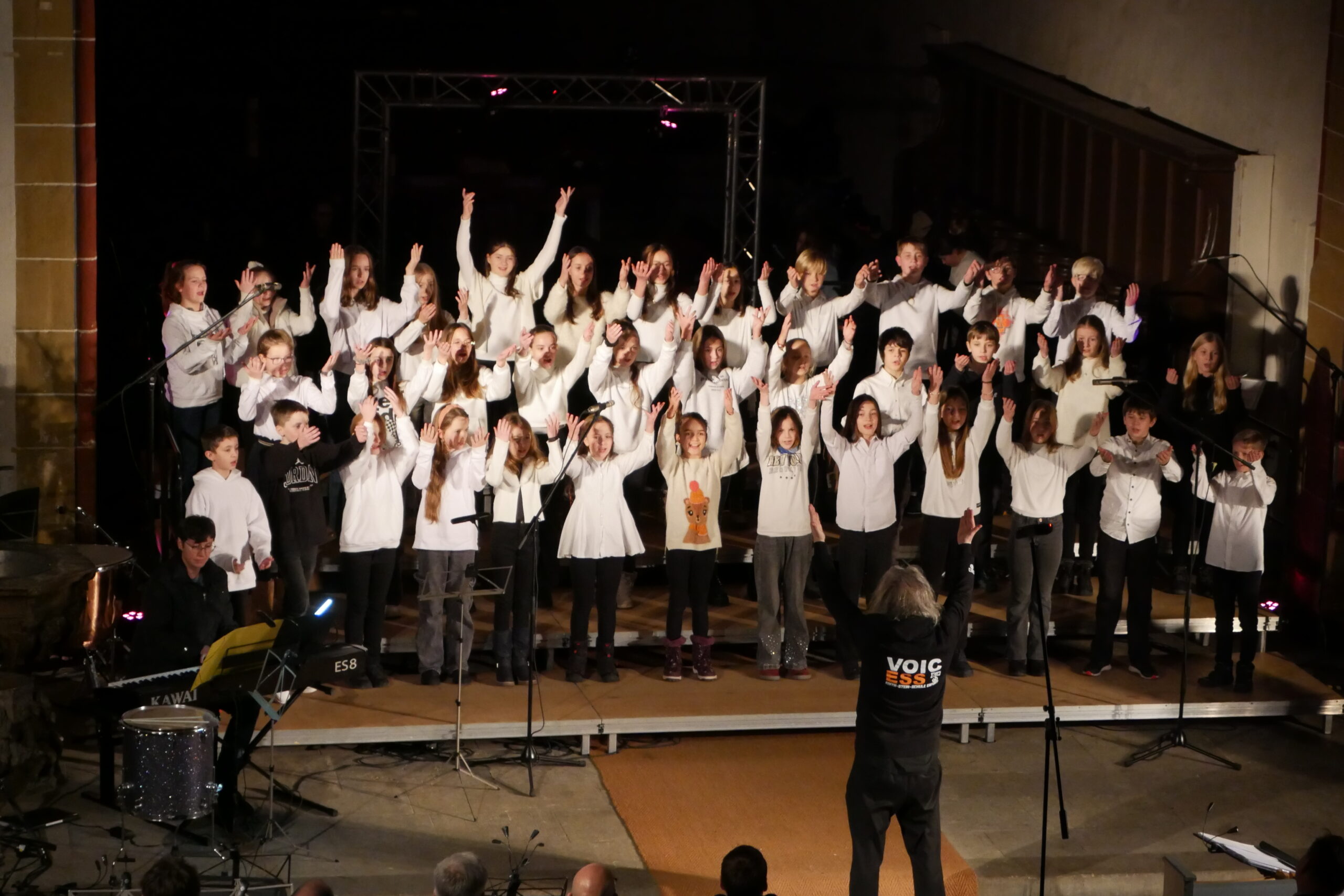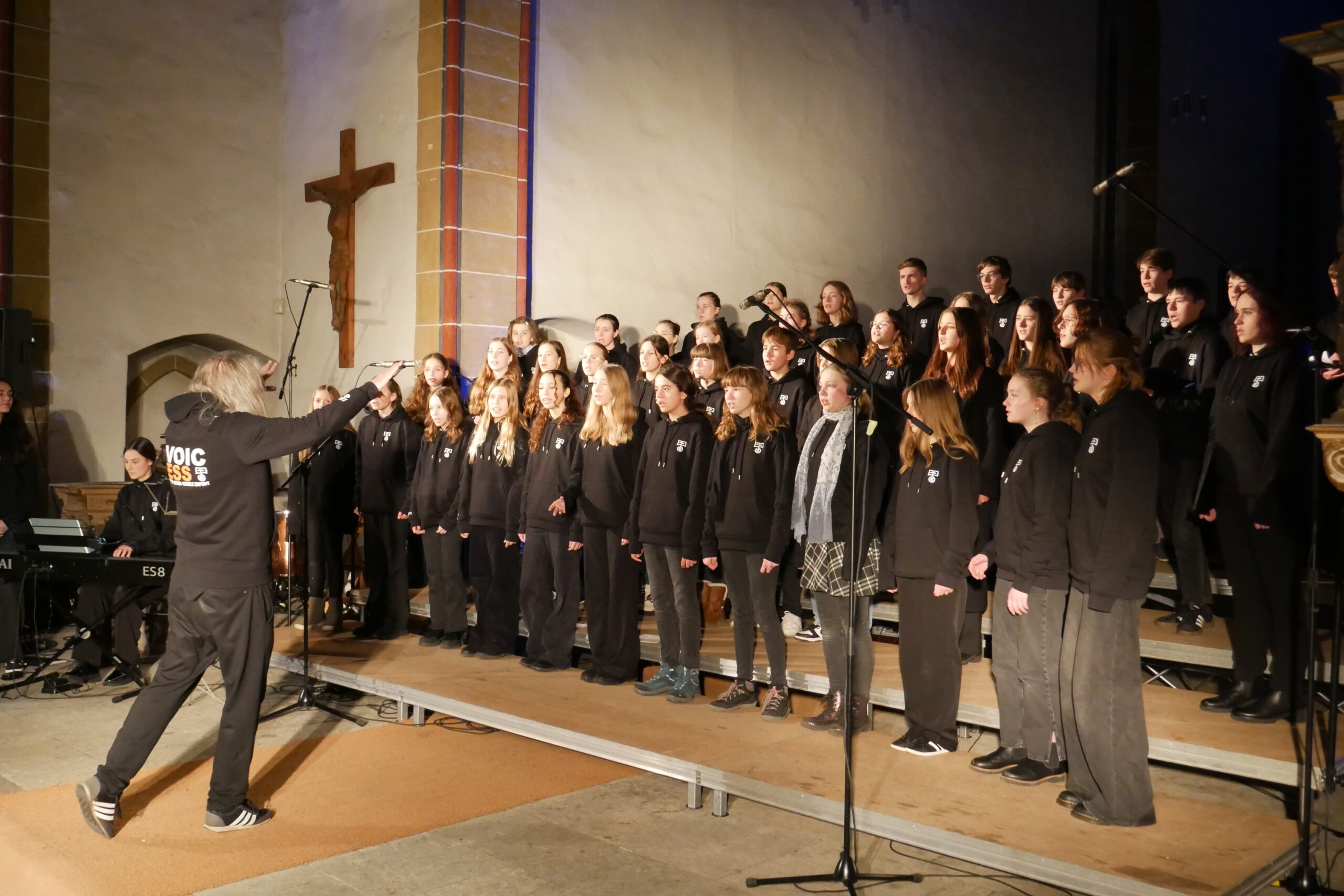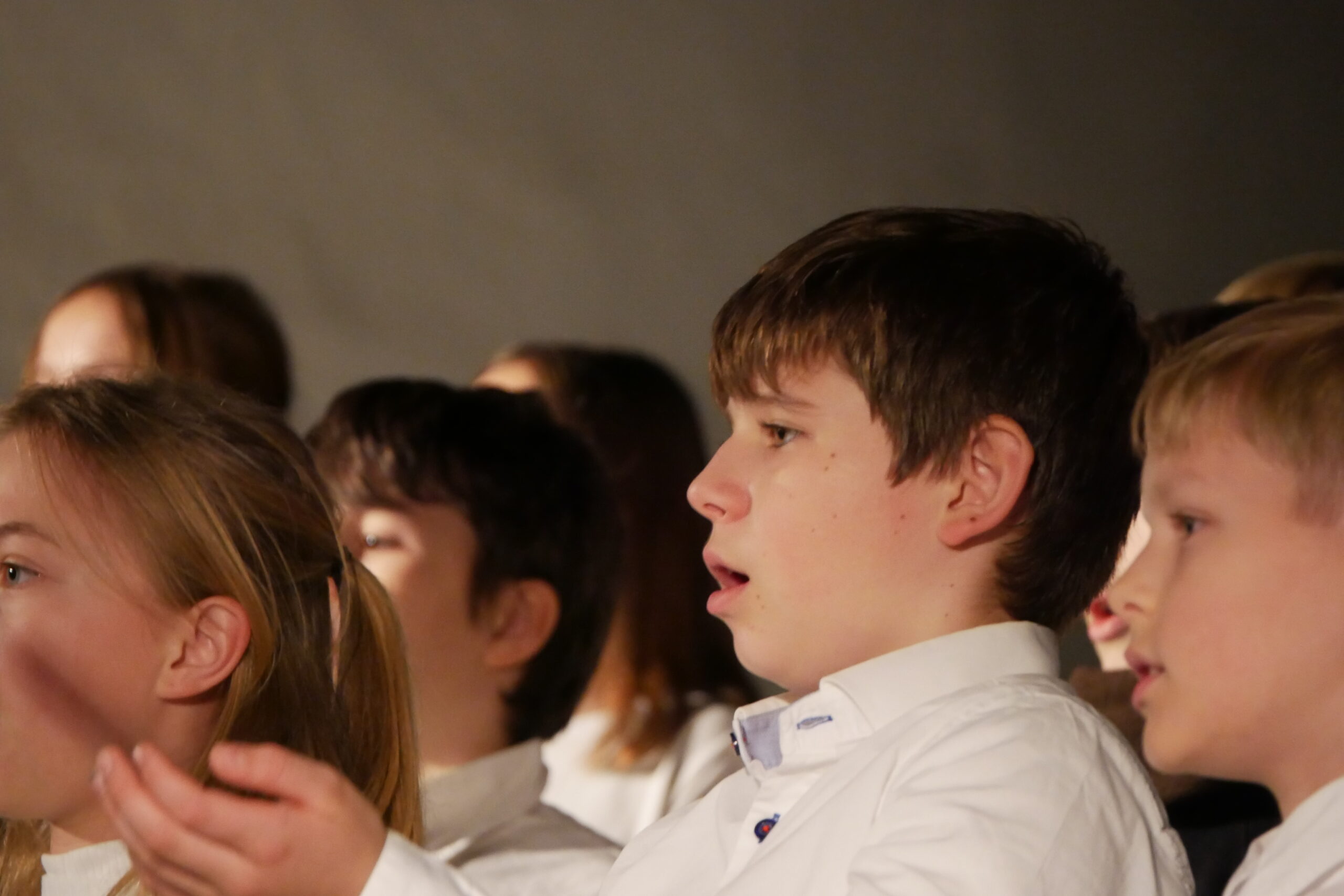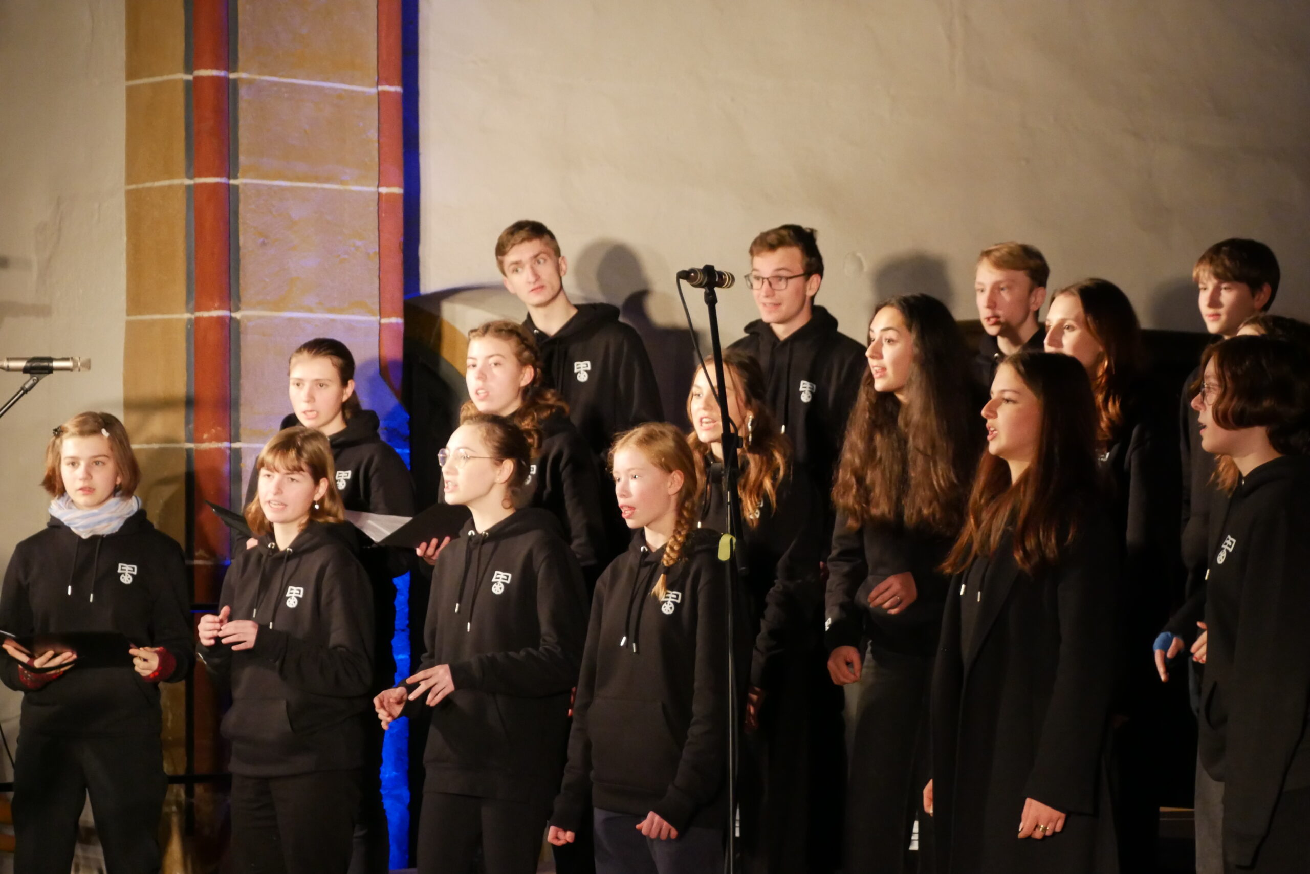 Nachdem der Oberstufenchor unter der Leitung von Herrn Fellner den Abend eröffnete, erklangen im Anschluss die Stimmen der ESS-Kids, die ihren Gesang mit einer Bewegungschoreographie untermalten. Während einer Durchschnaufpause des Kinderchors, bei welchem einige 5. Klässler gerade ihren ersten großen Auftritt hatten, brachten zwei mutige Solisten des Vororchesters mit Unterstützung von Frau Hörning ihre Instrumente zum Klingen. Kurz darauf stand wieder der Oberstufenchor im Mittelpunkt, doch folgten bald die Gesangsbeiträge von VoicESS, dem Jugendchor der ESS. Geschickt nutzen dabei die Chöre sowohl den Applaus des Publikums, welches die Reglerkirche bis in die letzte Ecke füllte, als auch die Kanongesänge der pausierenden Gesangsgruppen im Seitenschiff, um die Wechsel zügig und möglichst unauffällig vonstattengehen zu lassen.