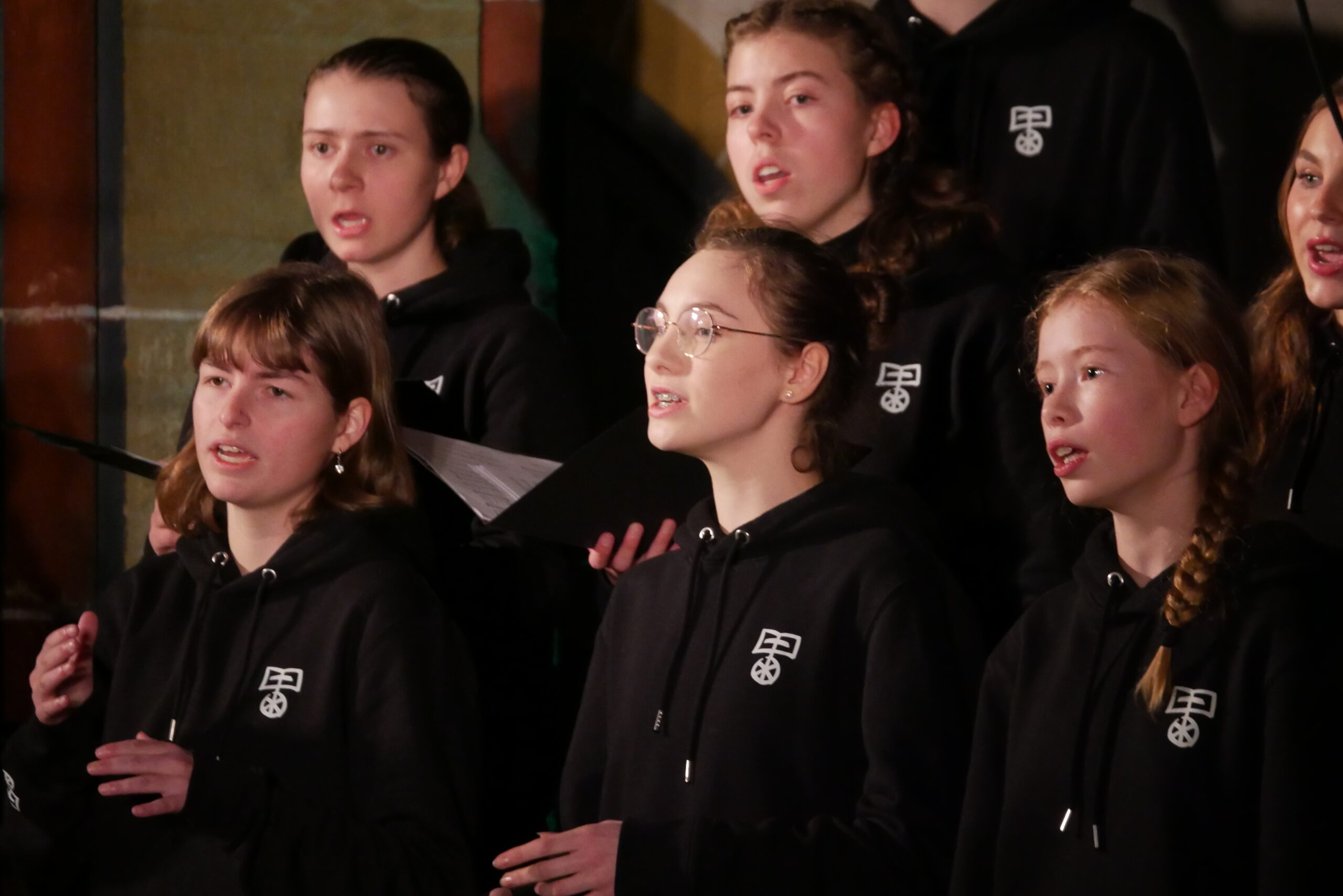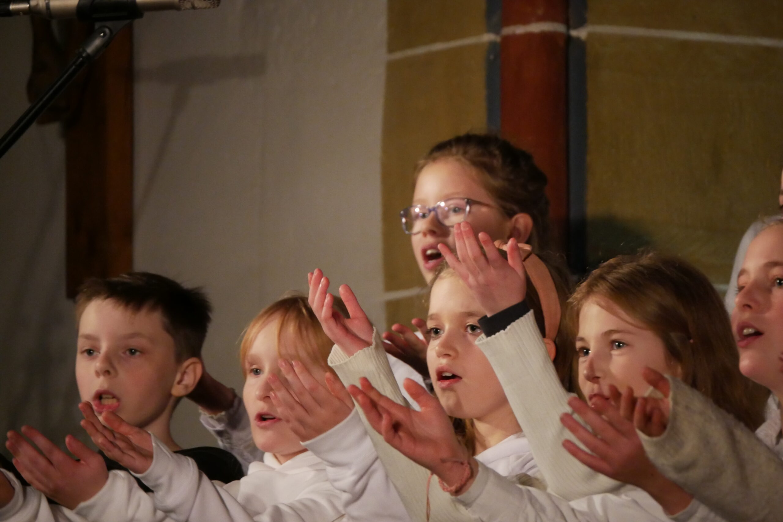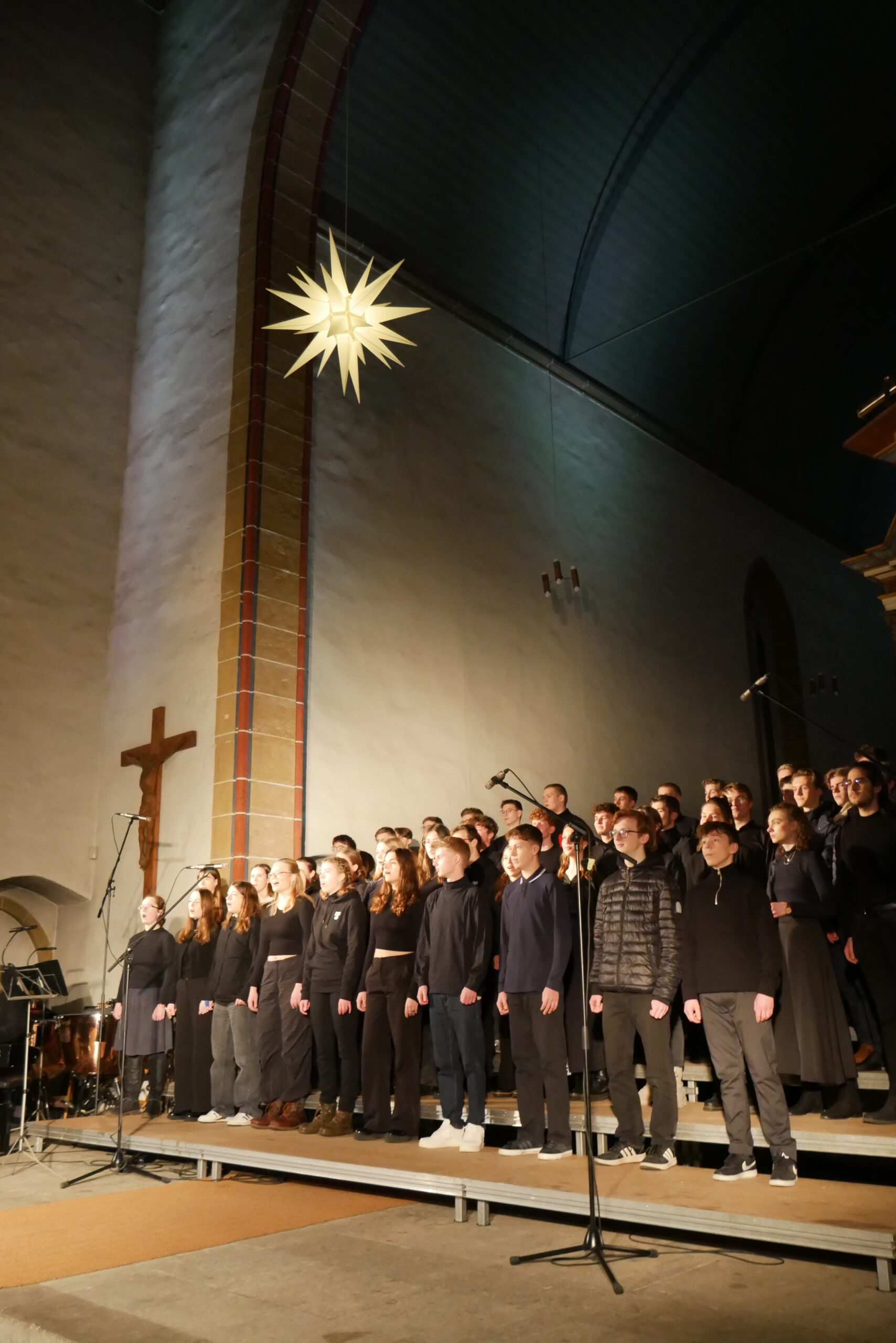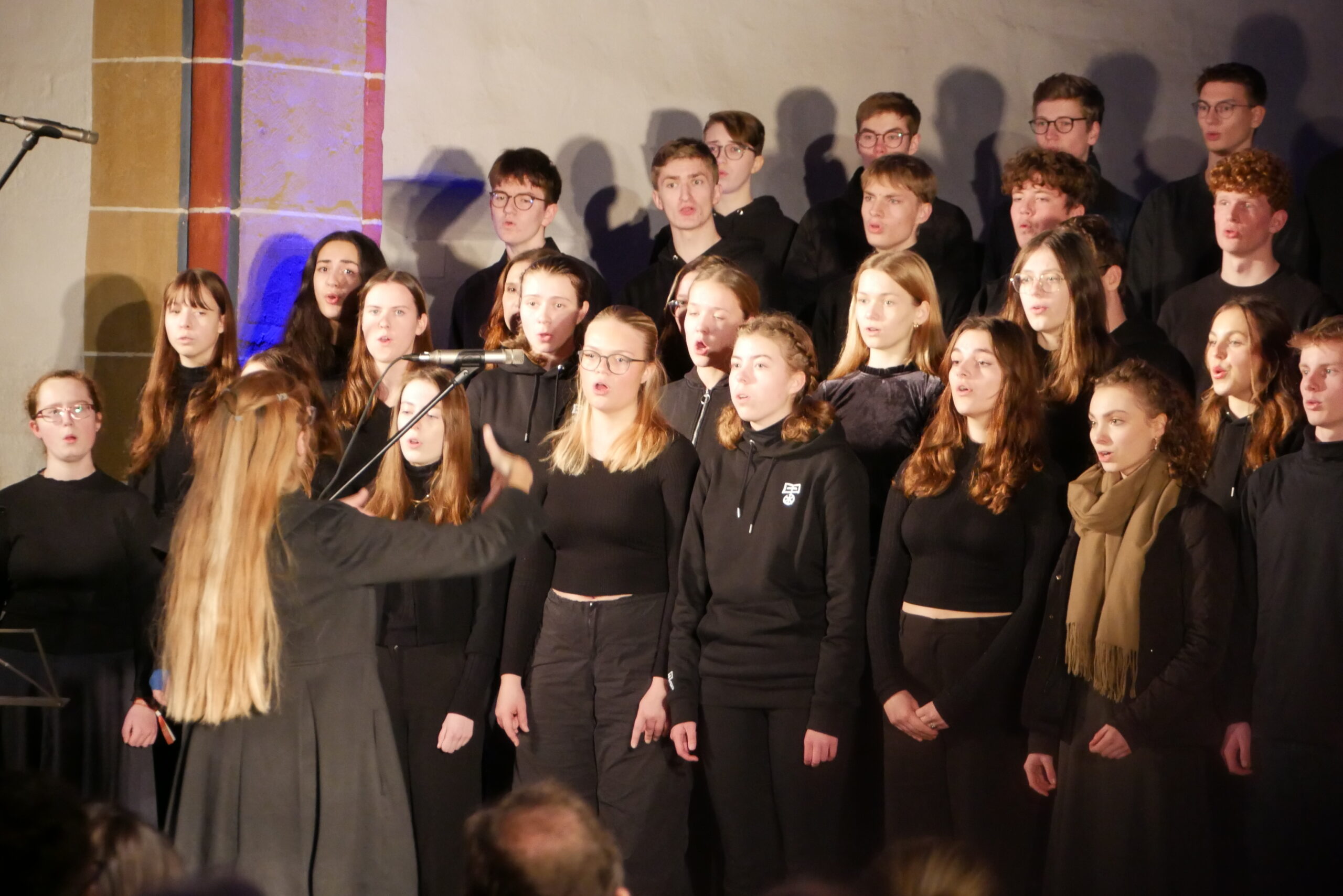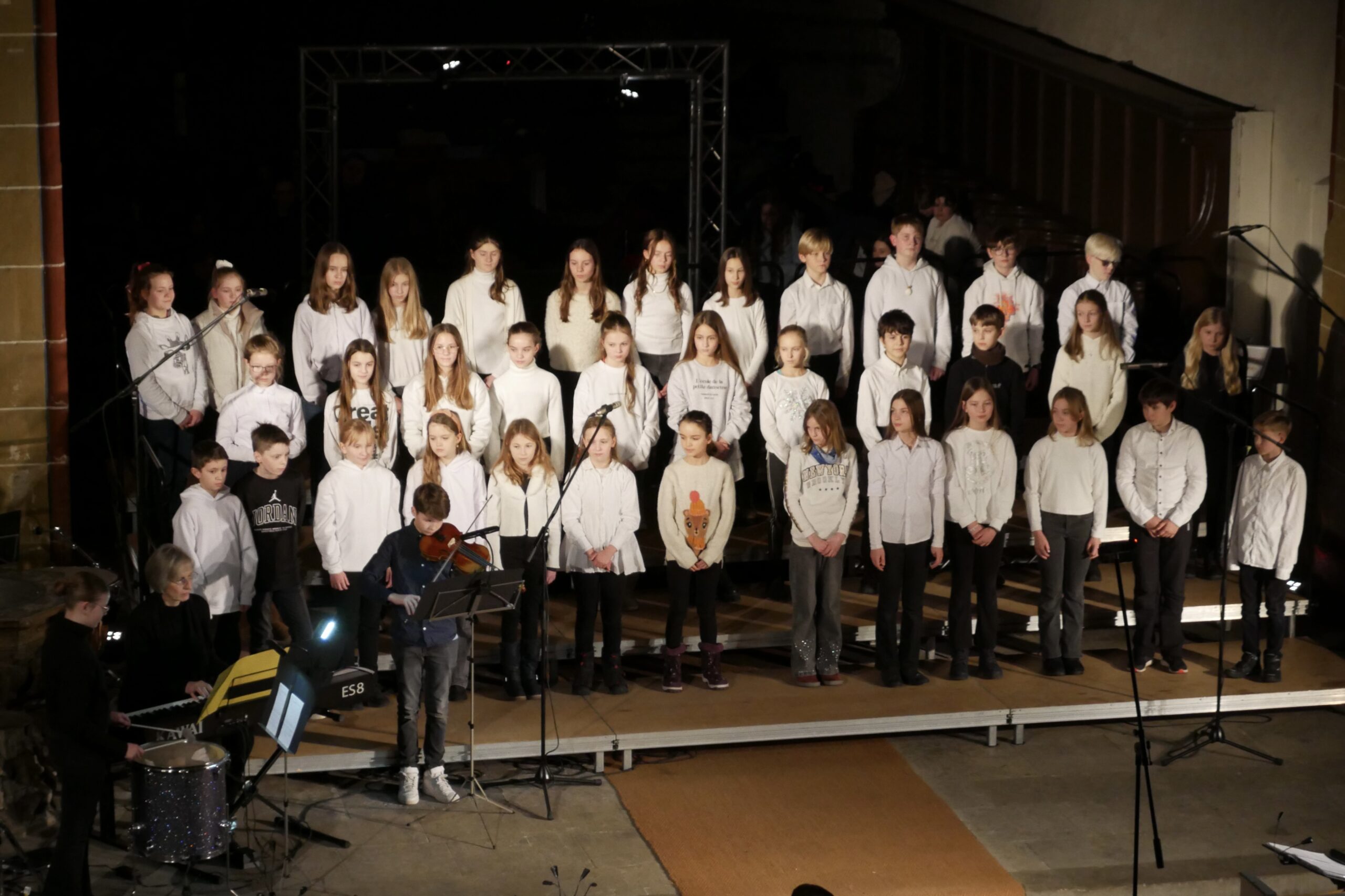 Nachdem der Oberstufenchor unter der Leitung von Herrn Fellner den Abend eröffnete, erklangen im Anschluss die Stimmen der ESS-Kids, die ihren Gesang mit einer Bewegungschoreographie untermalten. Während einer Durchschnaufpause des Kinderchors, bei welchem einige 5. Klässler gerade ihren ersten großen Auftritt hatten, brachten zwei mutige Solisten des Vororchesters mit Unterstützung von Frau Hörning ihre Instrumente zum Klingen. Kurz darauf stand wieder der Oberstufenchor im Mittelpunkt, doch folgten bald die Gesangsbeiträge von VoicESS, dem Jugendchor der ESS. Geschickt nutzen dabei die Chöre sowohl den Applaus des Publikums, welches die Reglerkirche bis in die letzte Ecke füllte, als auch die Kanongesänge der pausierenden Gesangsgruppen im Seitenschiff, um die Wechsel zügig und möglichst unauffällig vonstattengehen zu lassen.
