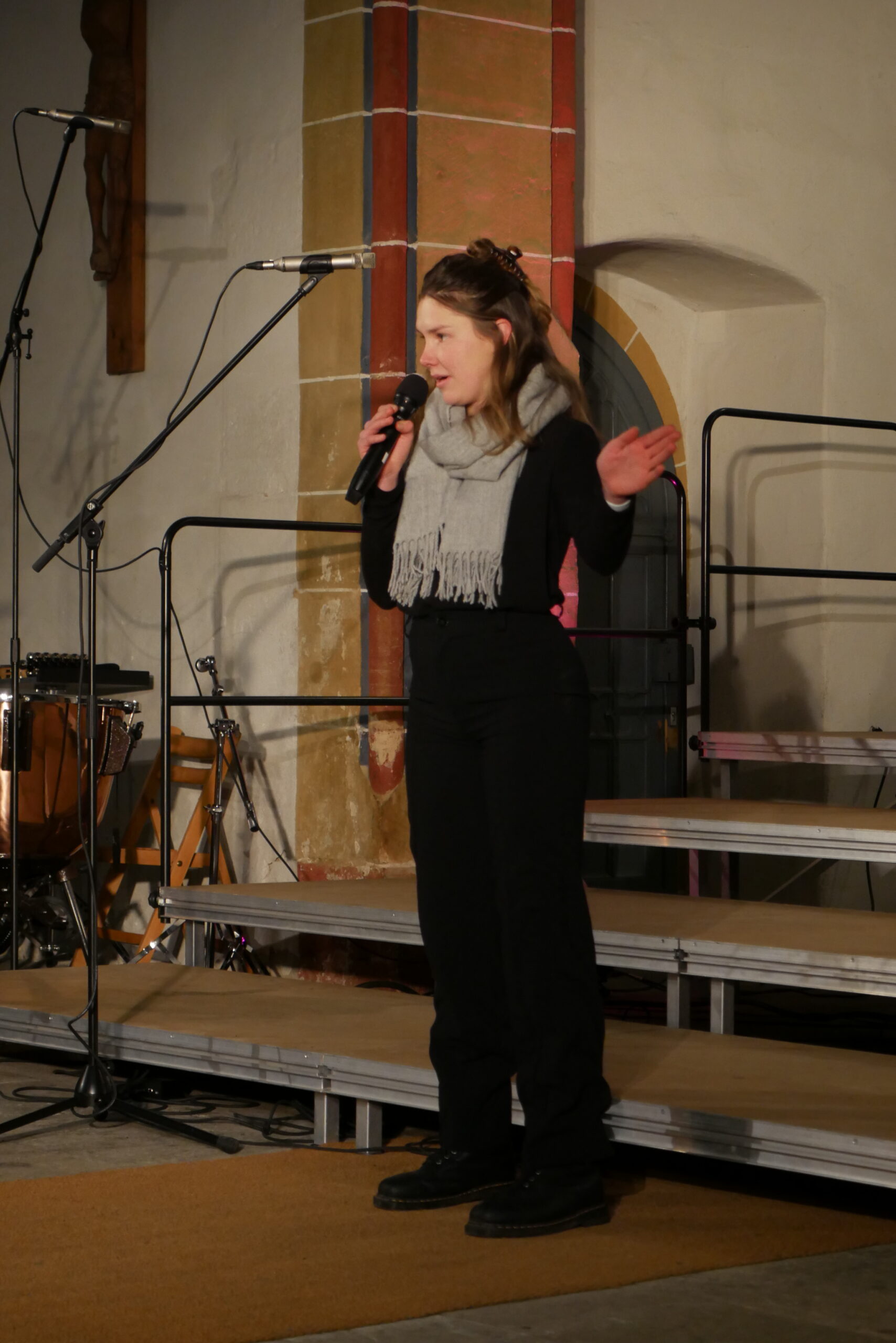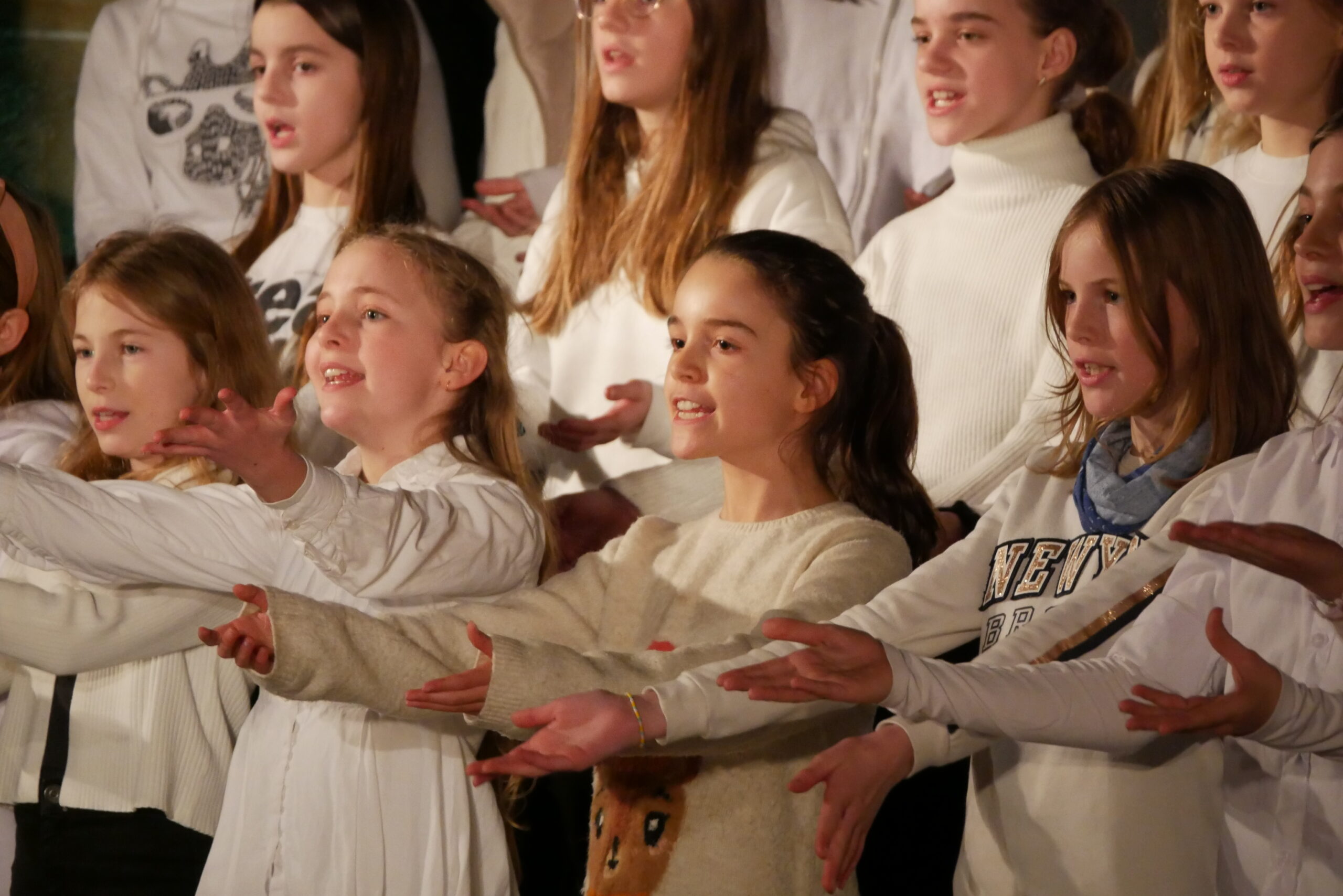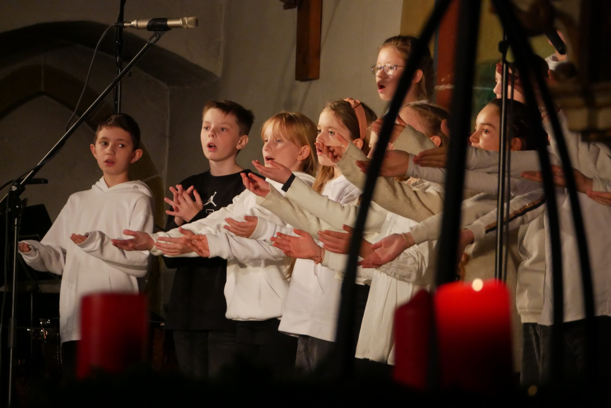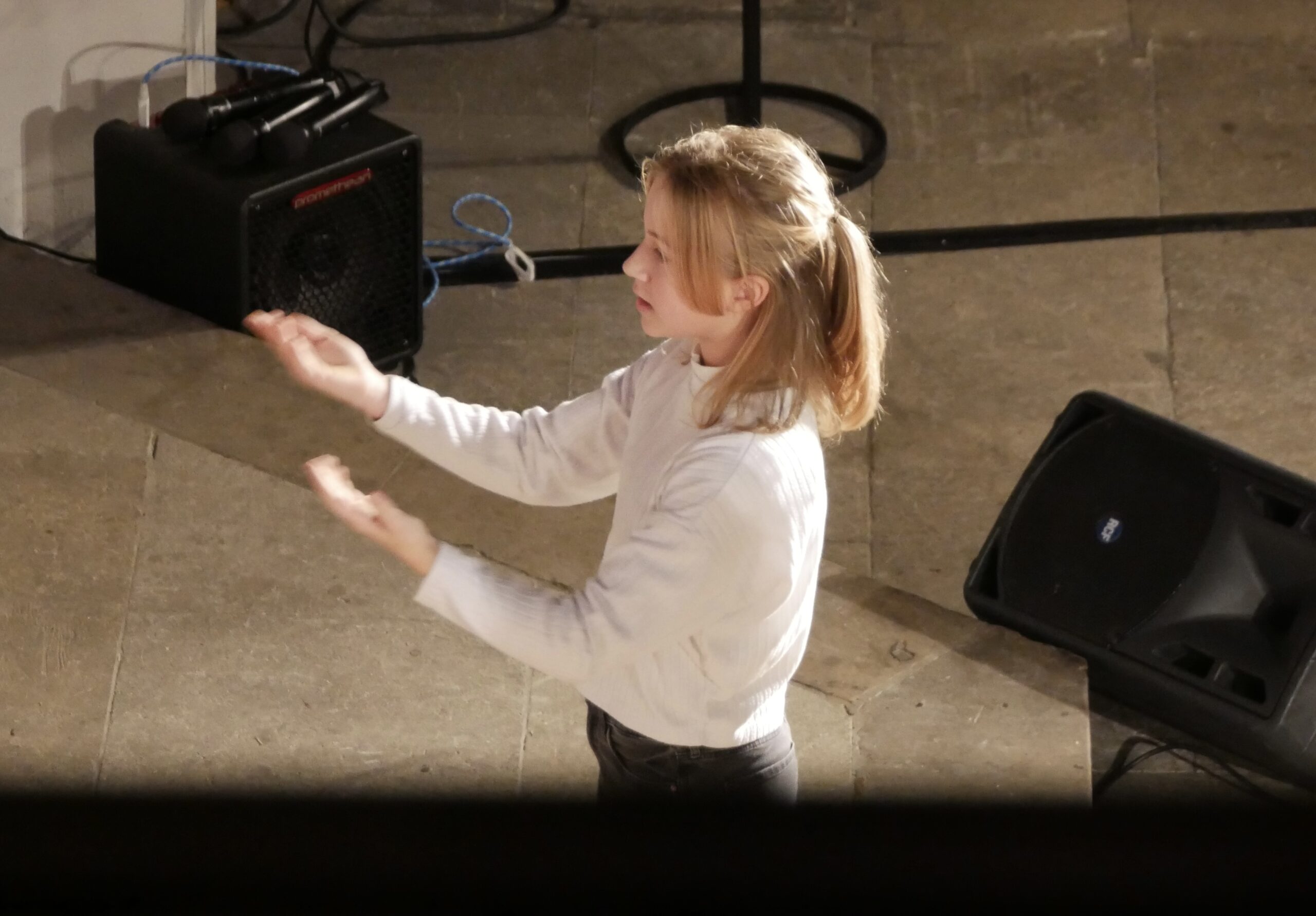 Nachdem der Oberstufenchor unter der Leitung von Herrn Fellner den Abend eröffnete, erklangen im Anschluss die Stimmen der ESS-Kids, die ihren Gesang mit einer Bewegungschoreographie untermalten. Während einer Durchschnaufpause des Kinderchors, bei welchem einige 5. Klässler gerade ihren ersten großen Auftritt hatten, brachten zwei mutige Solisten des Vororchesters mit Unterstützung von Frau Hörning ihre Instrumente zum Klingen. Kurz darauf stand wieder der Oberstufenchor im Mittelpunkt, doch folgten bald die Gesangsbeiträge von VoicESS, dem Jugendchor der ESS. Geschickt nutzen dabei die Chöre sowohl den Applaus des Publikums, welches die Reglerkirche bis in die letzte Ecke füllte, als auch die Kanongesänge der pausierenden Gesangsgruppen im Seitenschiff, um die Wechsel zügig und möglichst unauffällig vonstattengehen zu lassen.