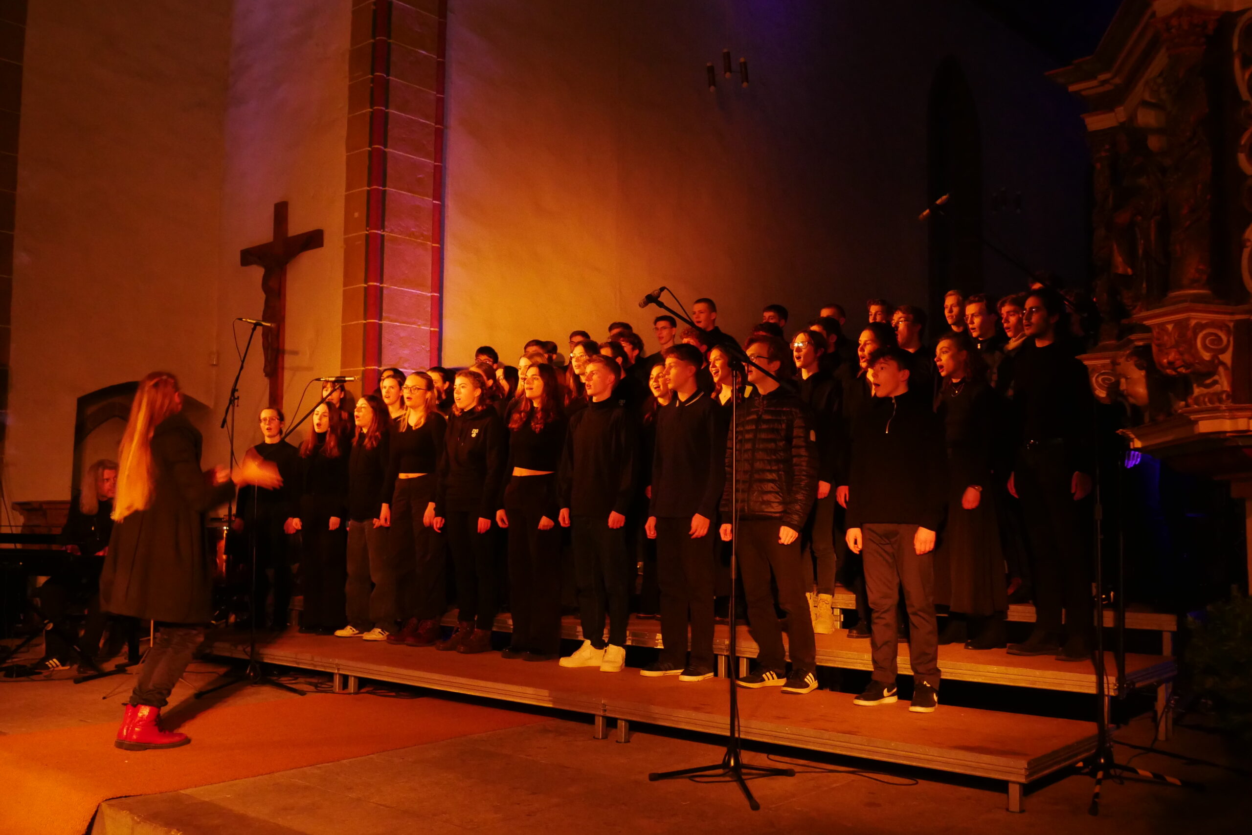 Beim Anblick der Schlange, die sich trotz Regen vom Eingang der Reglerkirche bis weit in die Fußgängerpassage hinein in Richtung Anger gezogen hat, haben sich viele Passanten in der Bahnhofstraße am Mittwochabend gefragt, welches Spektakel denn hier stattfindet. Wer dann noch ohne Vorwissen dem musikalischen Programm, unterstützt von einer professionellen Beleuchtung und Lichtshow, beiwohnte, mag das musikalische Feuerwerk für ein Festival verschiedenster Chöre und Instrumentenensembles gehalten haben. Doch die 160 Beteiligten gehörten allesamt zur Schulgemeinschaft der Edith-Stein-Schule. Sage und schreibe sechs Chorformationen wechselten sich in einem knapp zweistündigen Programm ab und auch das Vororchester und das orch.ESS.ta hatten ihre umjubelten Auftritte.