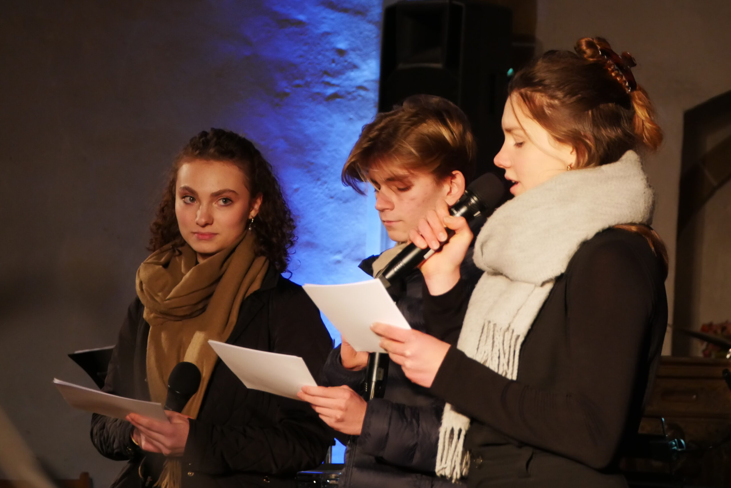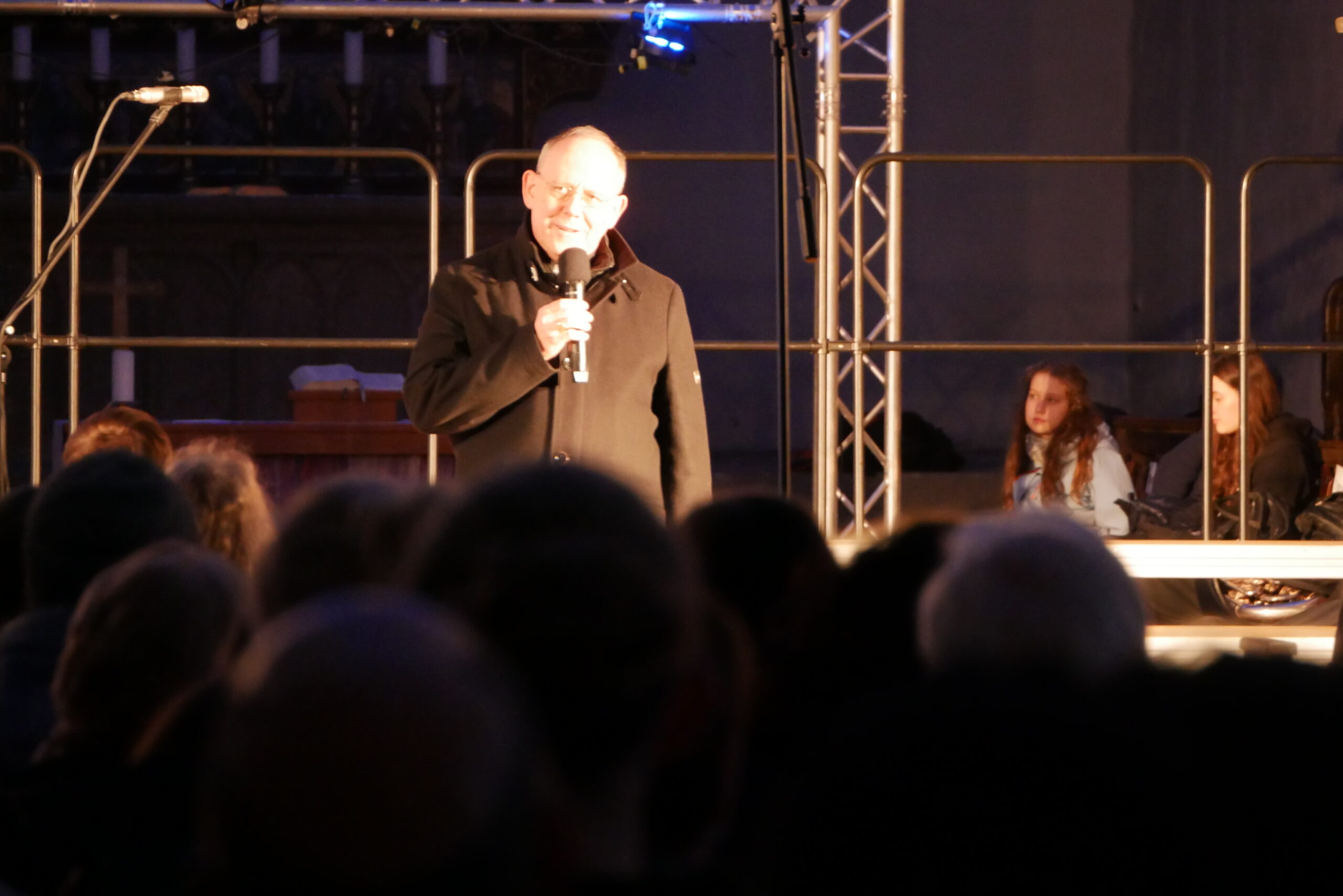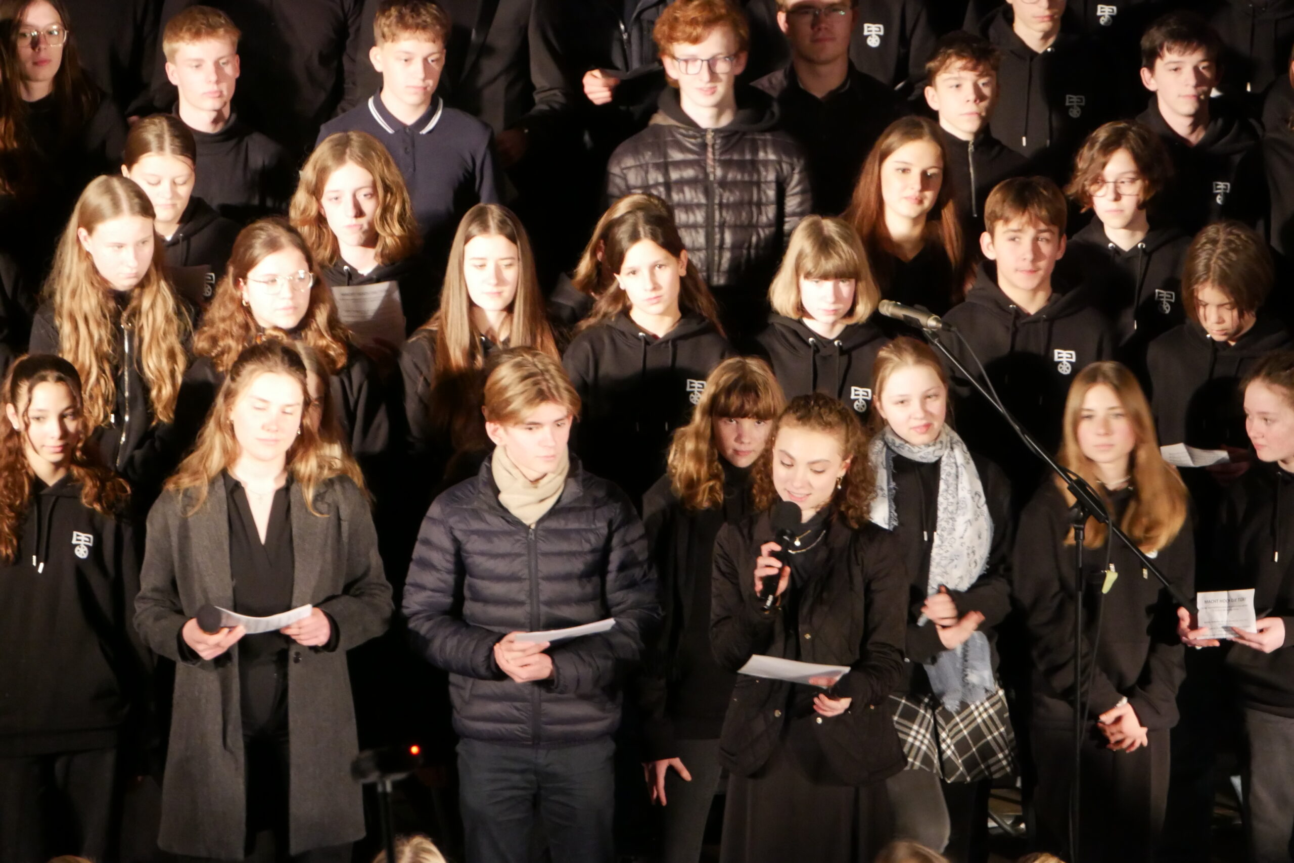 Nach kurzer Einweisung und Einführung durch die drei Moderator*innen aus der Oberstufe begrüßte Dr. Voigt als Schulleiter das Publikum und Bischof Neymeyr, der sich auch dieses Jahr das Adventskonzert nicht entgehen ließ, regte mit ein paar mahnenden Worten über das Zeitgeschehen zum Nachdenken an.