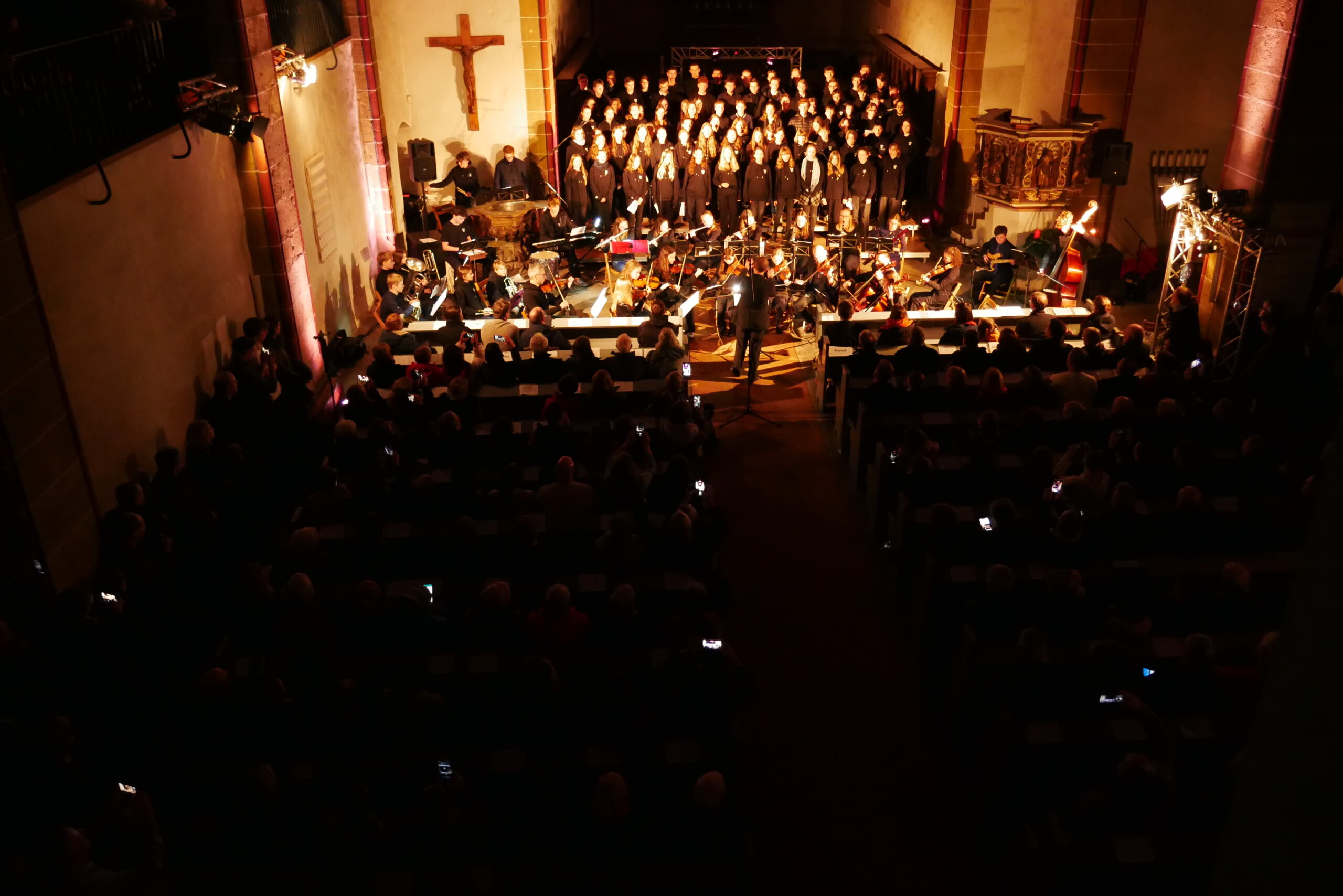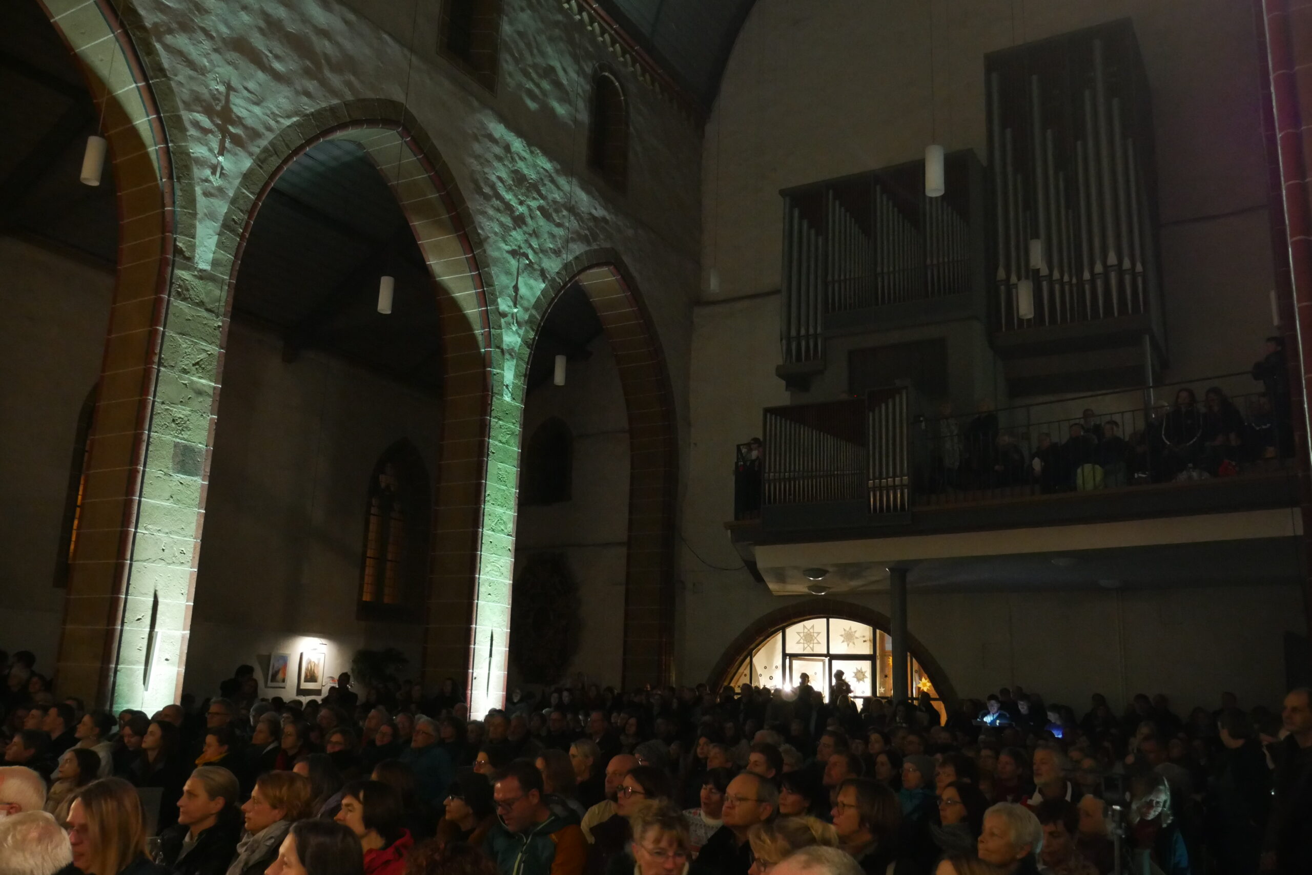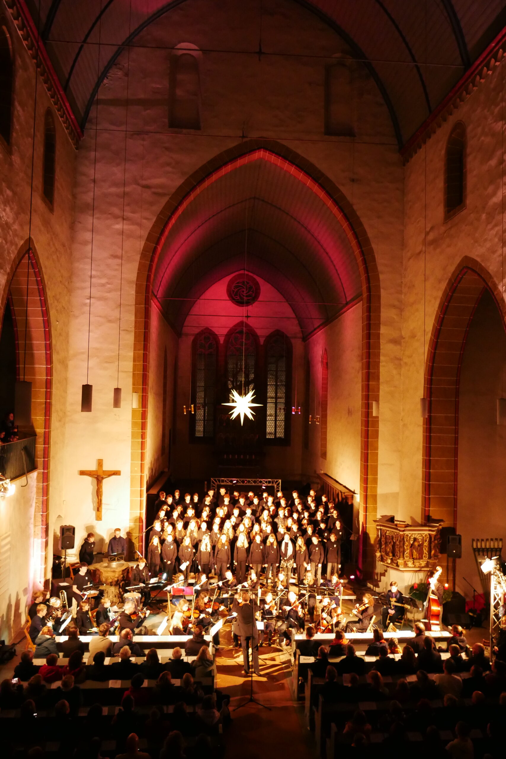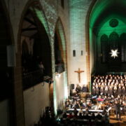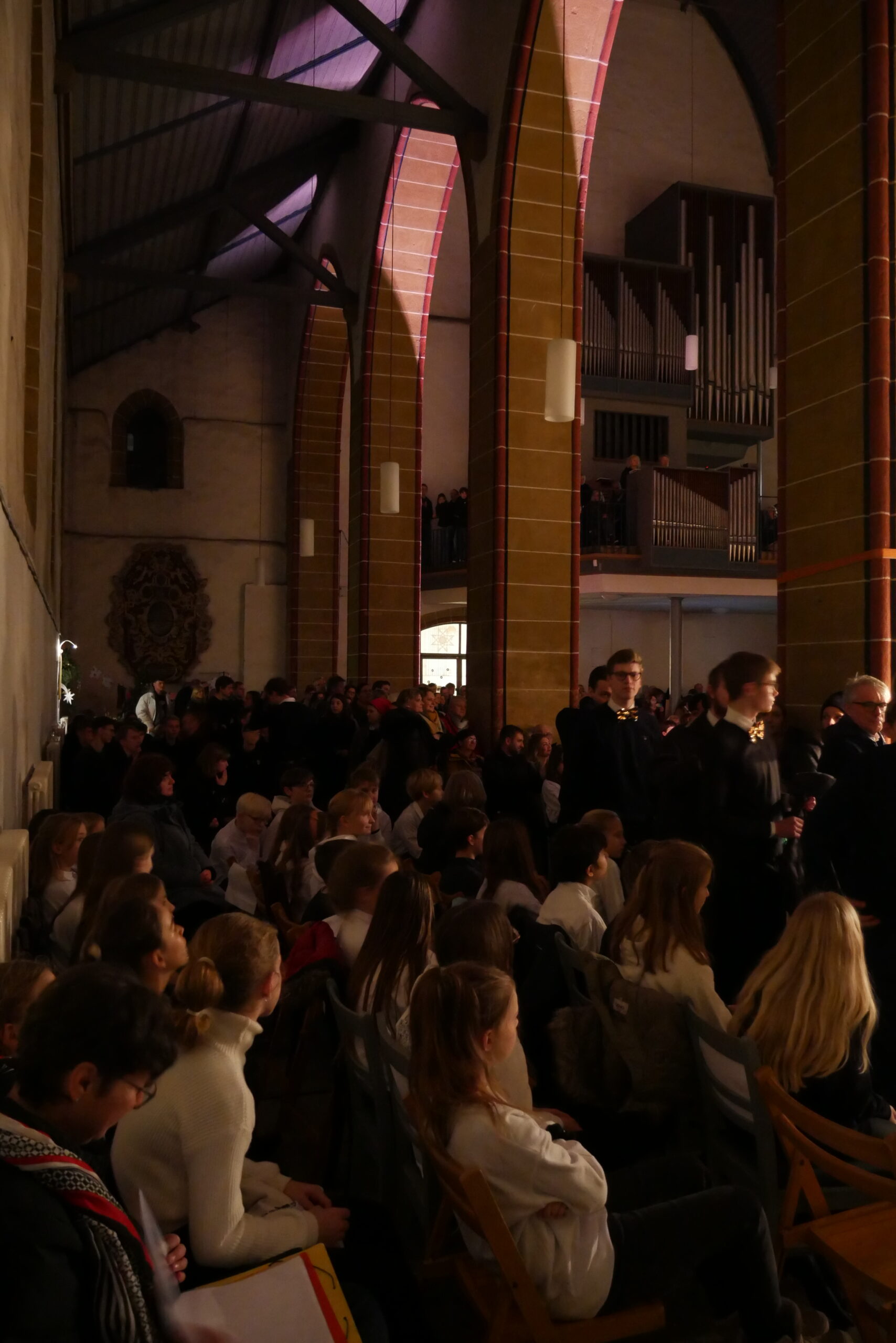 Zum Ende des Konzerts versammelten sich dann alle Musiker*innen und Chöre auf dem Bühnenpodest. Zunächst stimmte der Kinderchor mit „Macht hoch die Tür“ die Gemeinde ein und dann erklang ein stimmgewaltiges und orchestral unterstütztes „Verkündet aller Welt“. Mit diesem würdigen Finale ging ein Konzertabend zu Ende, der sowohl bei den Musizierenden, als auch beim Publikum einen bleibenden Eindruck hinterlassen hat.