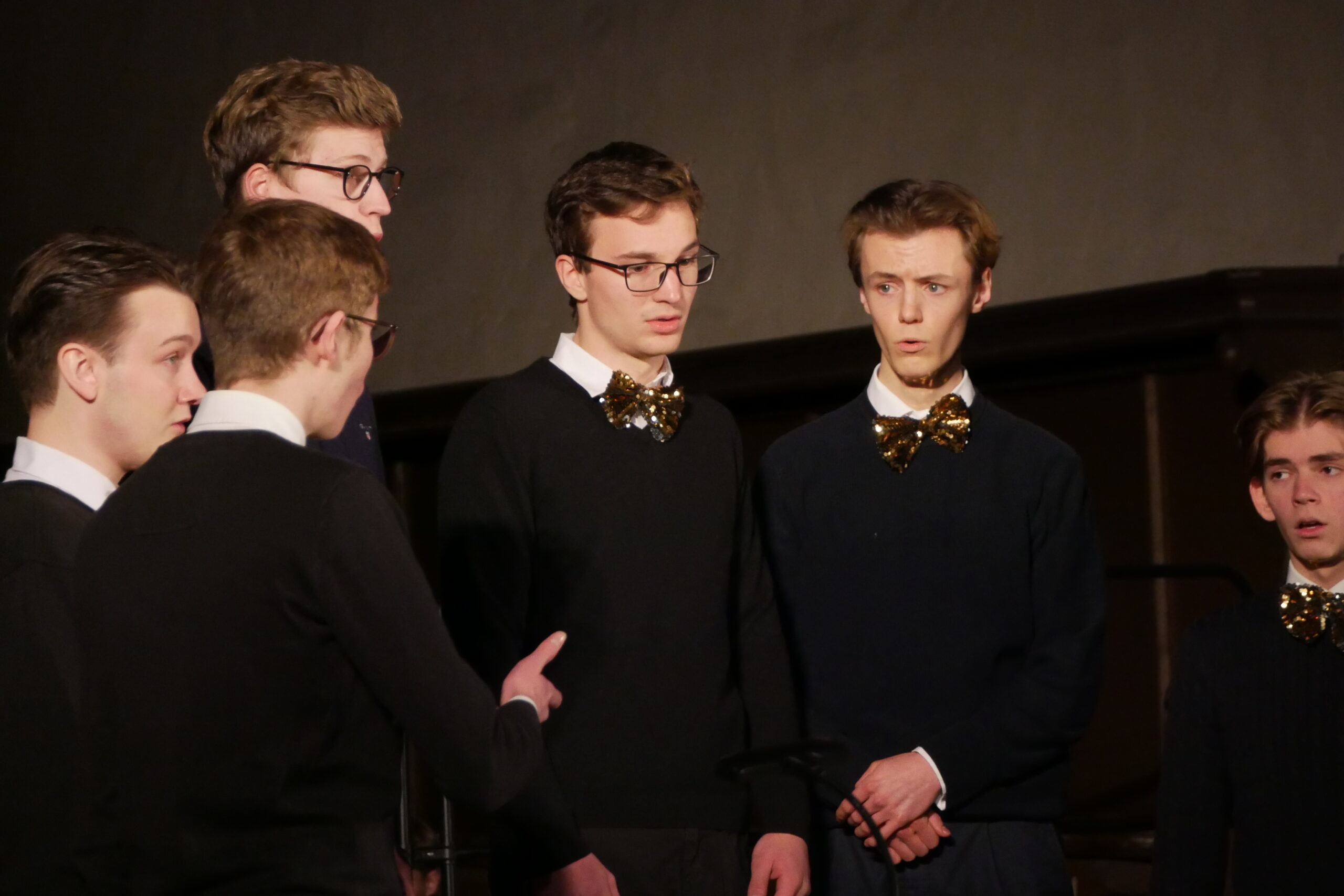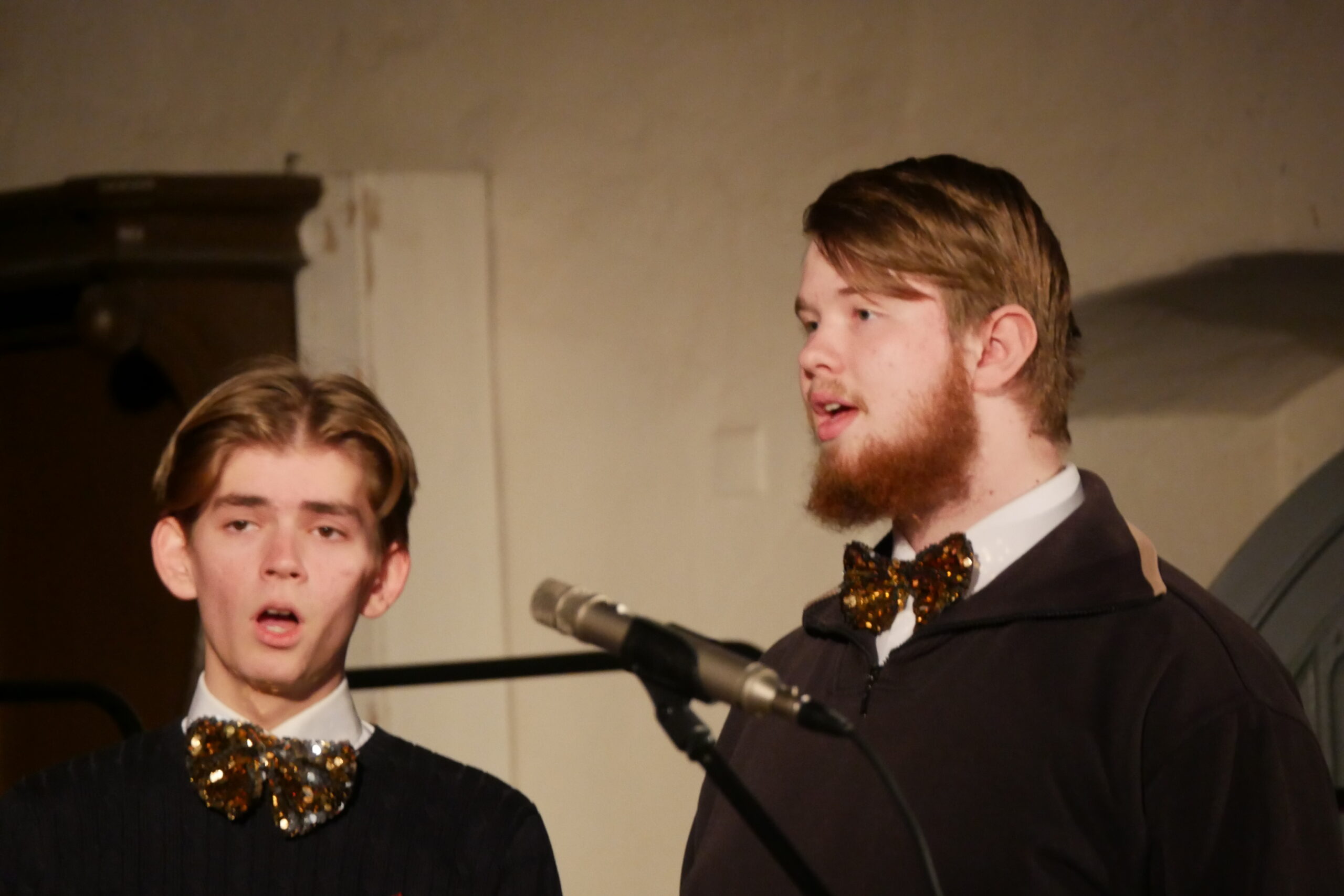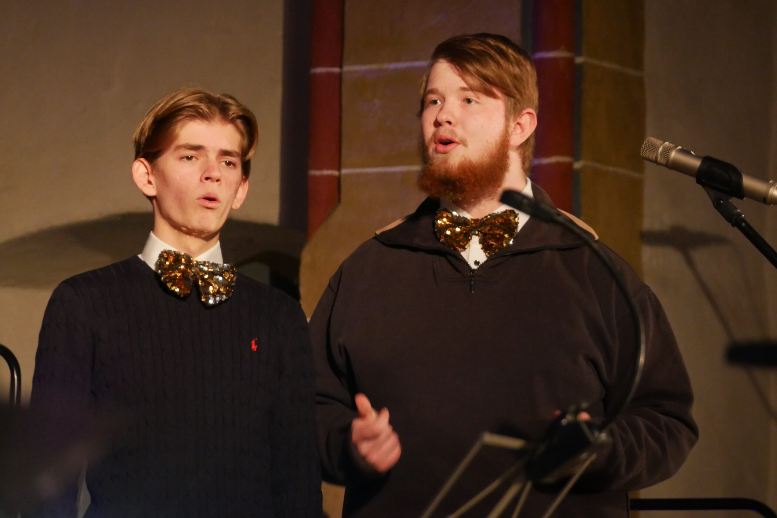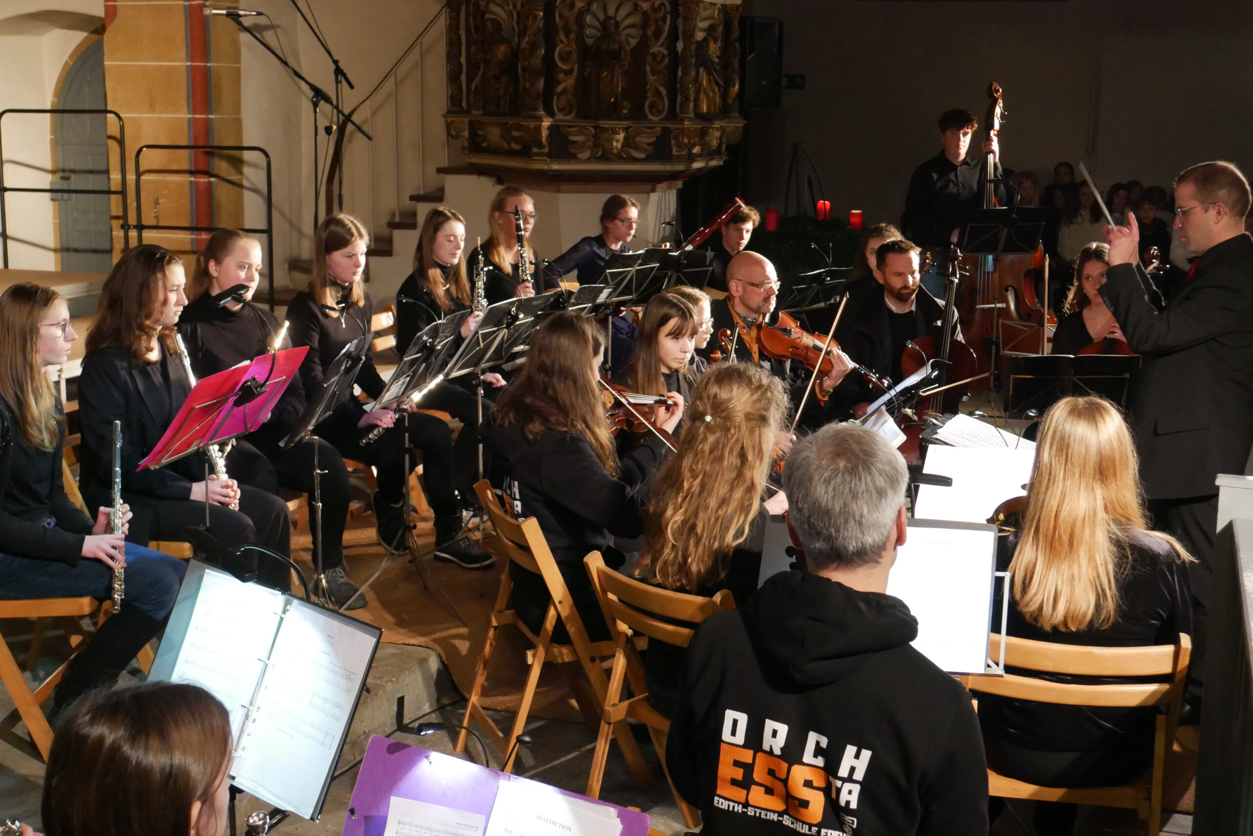 Kaum zu toppen – könnte man meinen, doch auch die 7 jungen und sehr adretten Herren des VoicESS Kammerchors standen den Lehrer*innen in nichts nach und begeisterten mit ihrer Performance das Publikum. Dann wurde es gesanglich erst einmal ruhig, da nach kurzem Umbau endlich das orch.ESS.ta zum Zuge kam. Als Herr Habermann die 27 Instrumente in der kühlen Kirchenluft endlich in Einklang gebracht hatte, verzückten die Musiker zunächst mit drei Instrumentalstücken die Zuhörer. Insbesondere die bekannten Töne aus Harry Potter und dem Polarexpress kamen beim jüngeren Publikum besonders gut an.