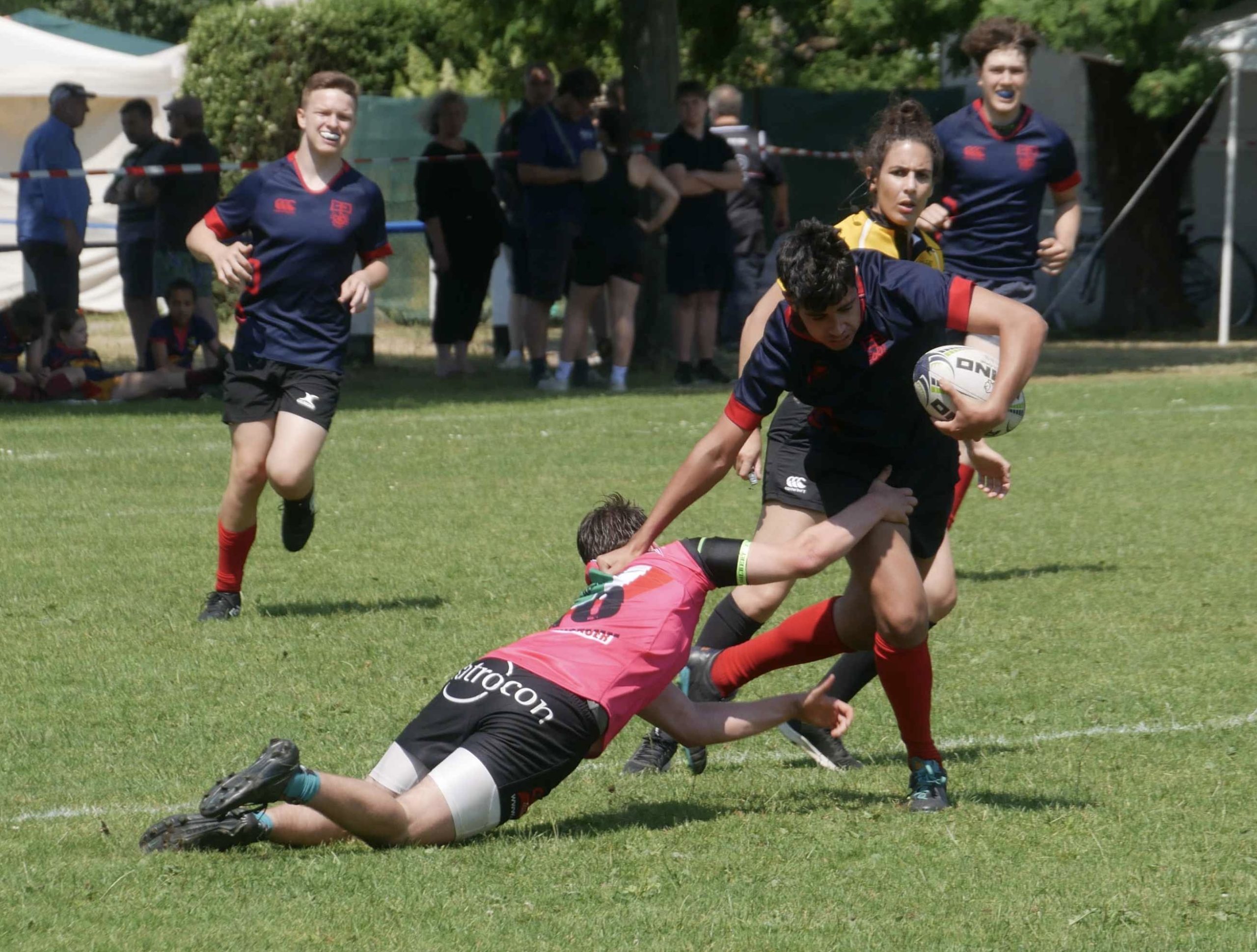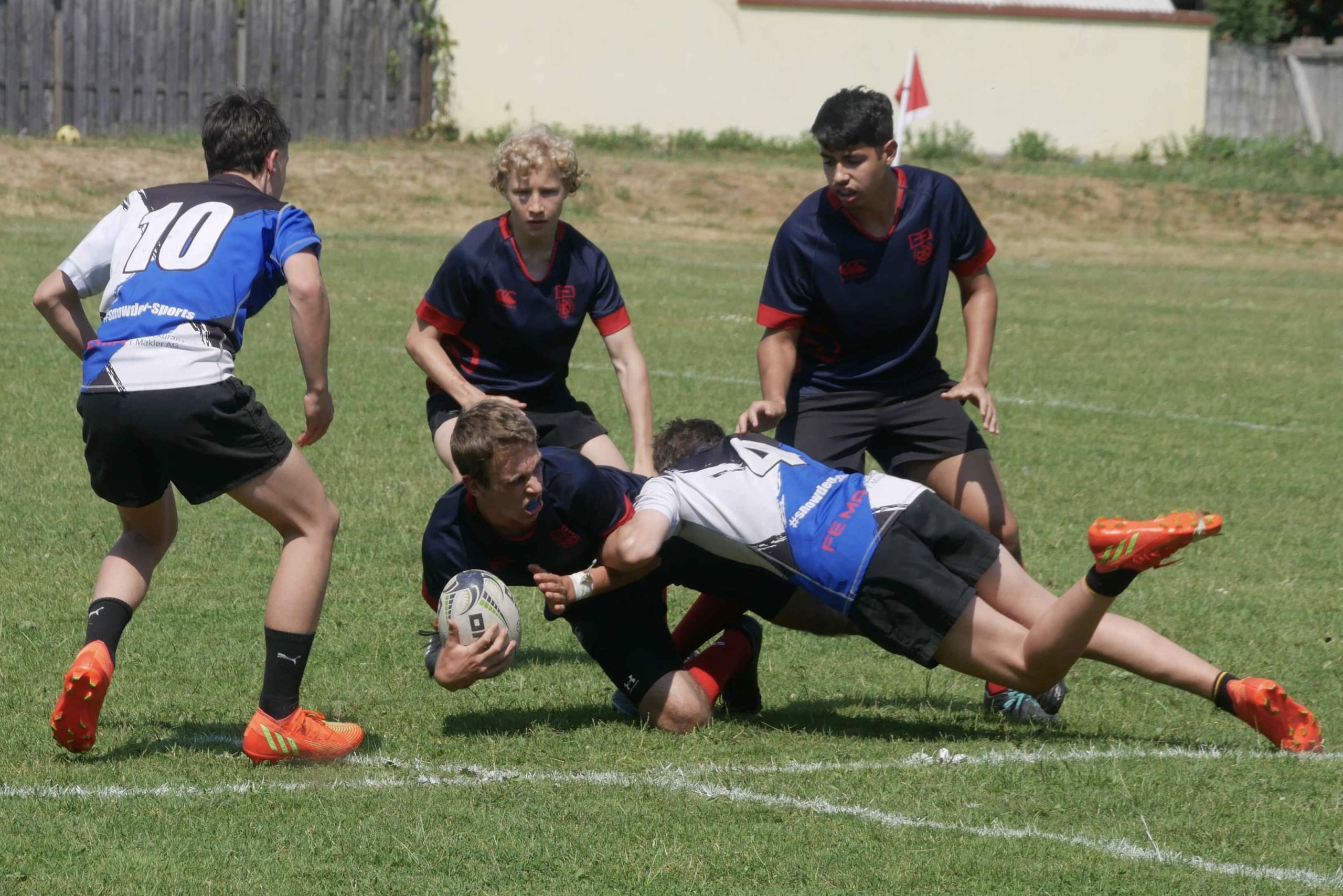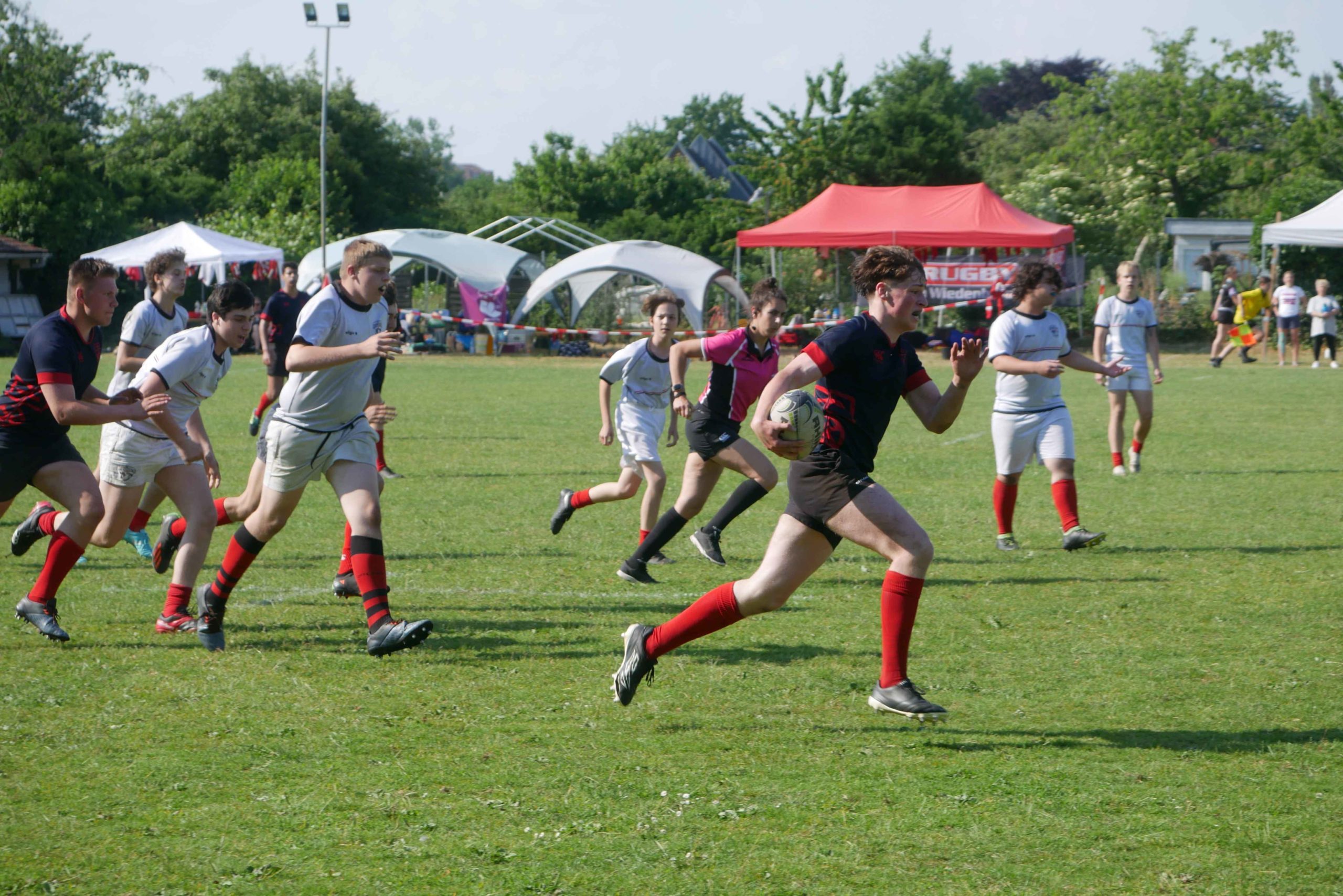 Gleich nach Ankick und der ersten Balleroberung zeigte der Nachwuchs des zweiten Berliner Bundesligavereins, wie man über dominierende Gedränge und souveräne Gassen einen Gegner früh in die Knie zwingen kann. Denn obwohl viele Tacklings der Erfurter und Leipziger saßen, kreierten die Berliner immer wieder aus den Standards heraus erfolgreiche Angriffswellen, die letztlich schon in der ersten Halbzeit zu vier Versuchen führten. In der eigenen Vorwärtsbewegung gelang es Thüringern und Sachsen nicht, die geplante Taktik umzusetzen und nach sicheren Stürmerphasen die eigene starke Hintermannschaft ins Spiel zu bringen. Die aus dem 7er Rugby erfolgsverwöhnte Hinterreihe aus Erfurt kam einfach nicht zum Zug – zu verunsichert waren sie auch aufgrund des Drucks der Berliner.
