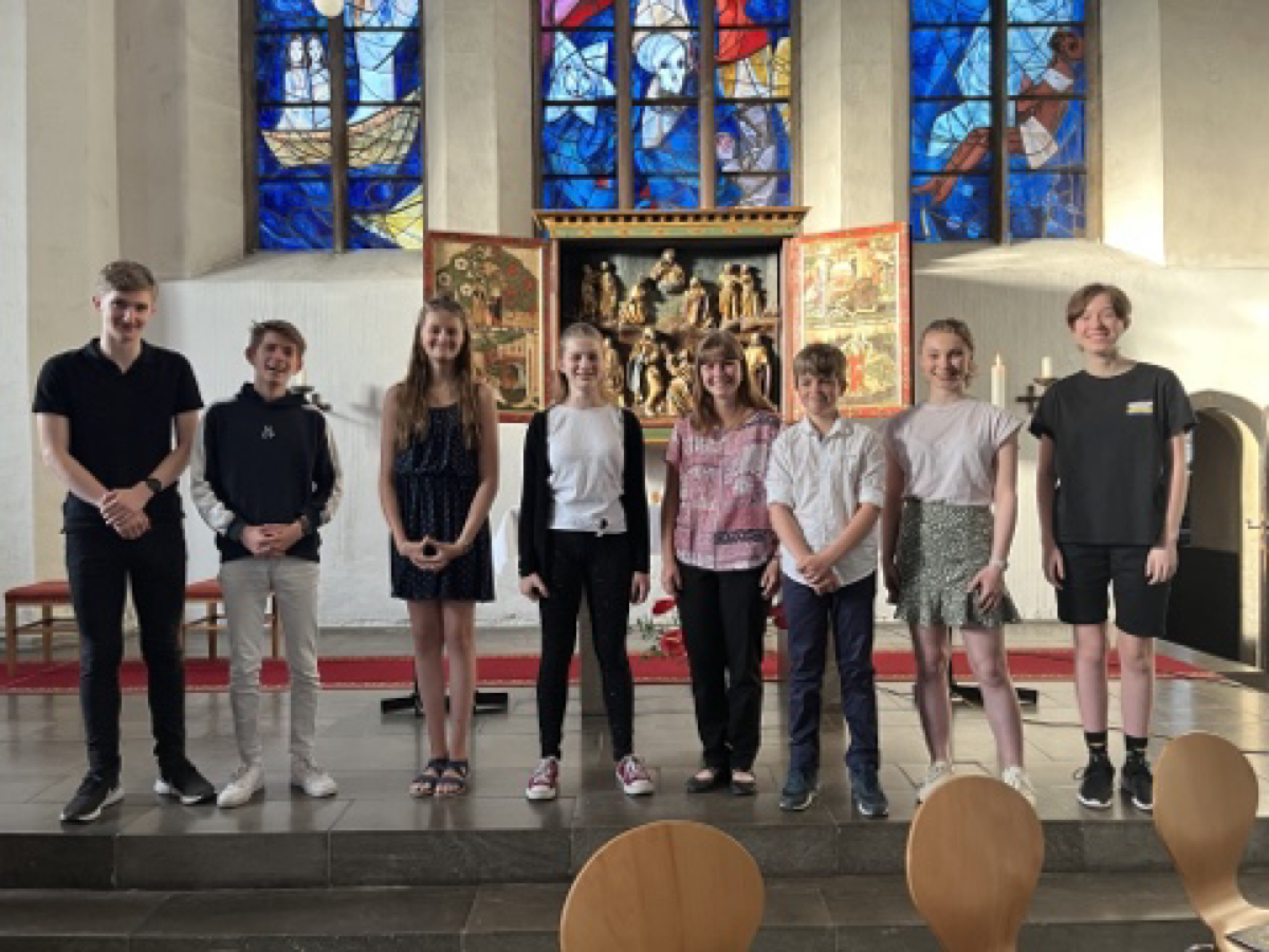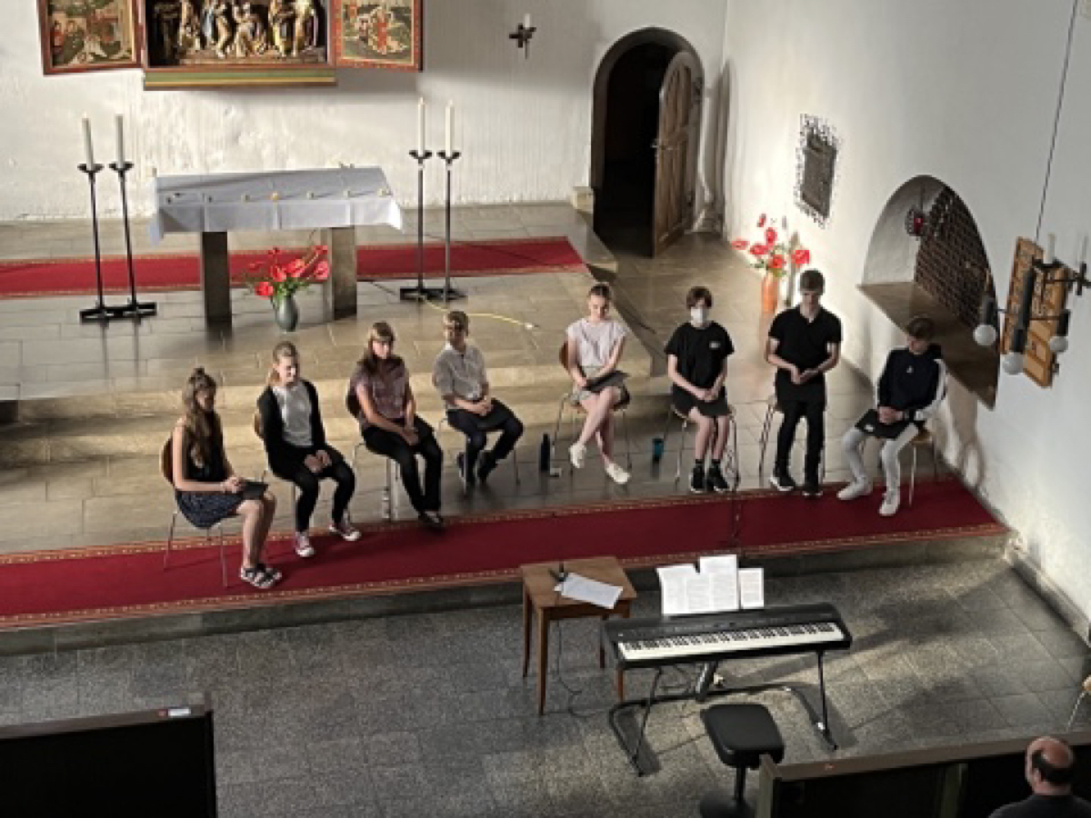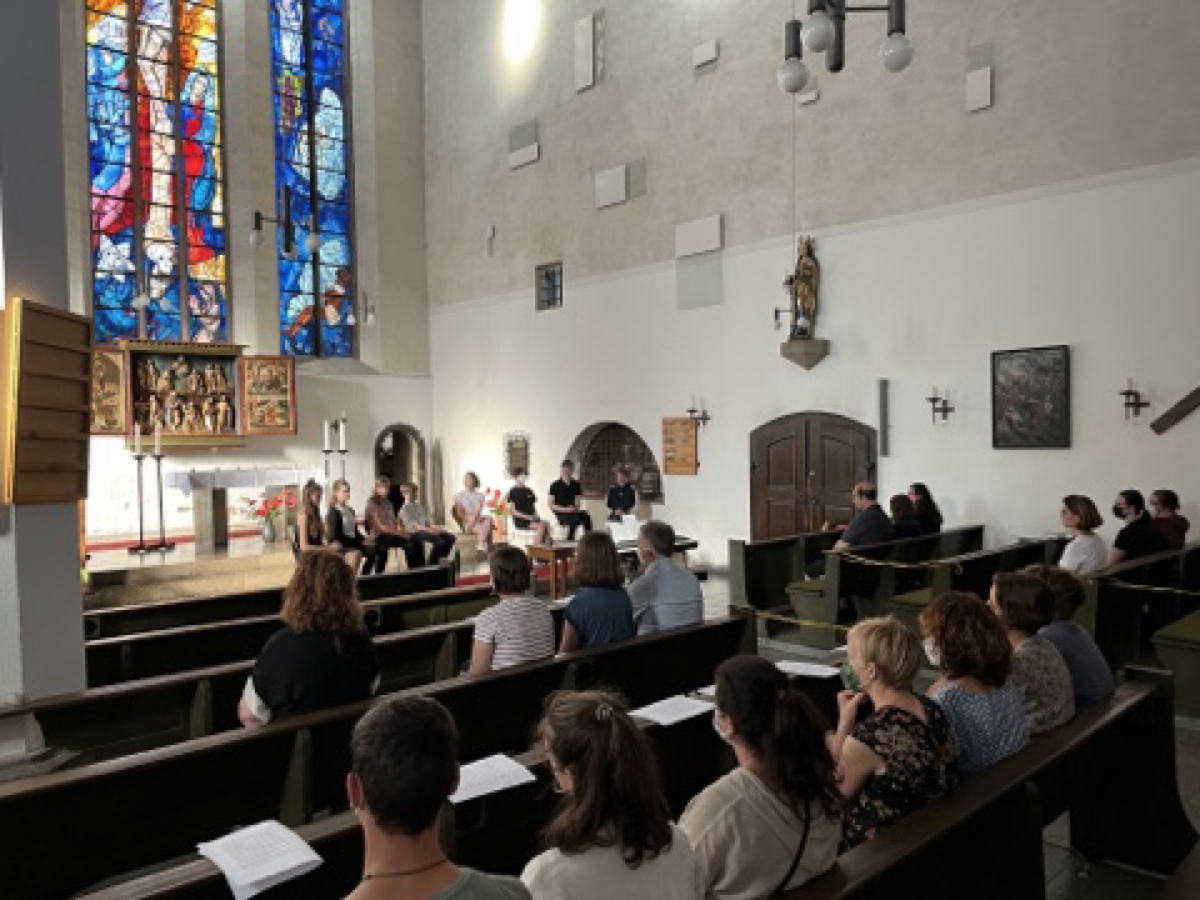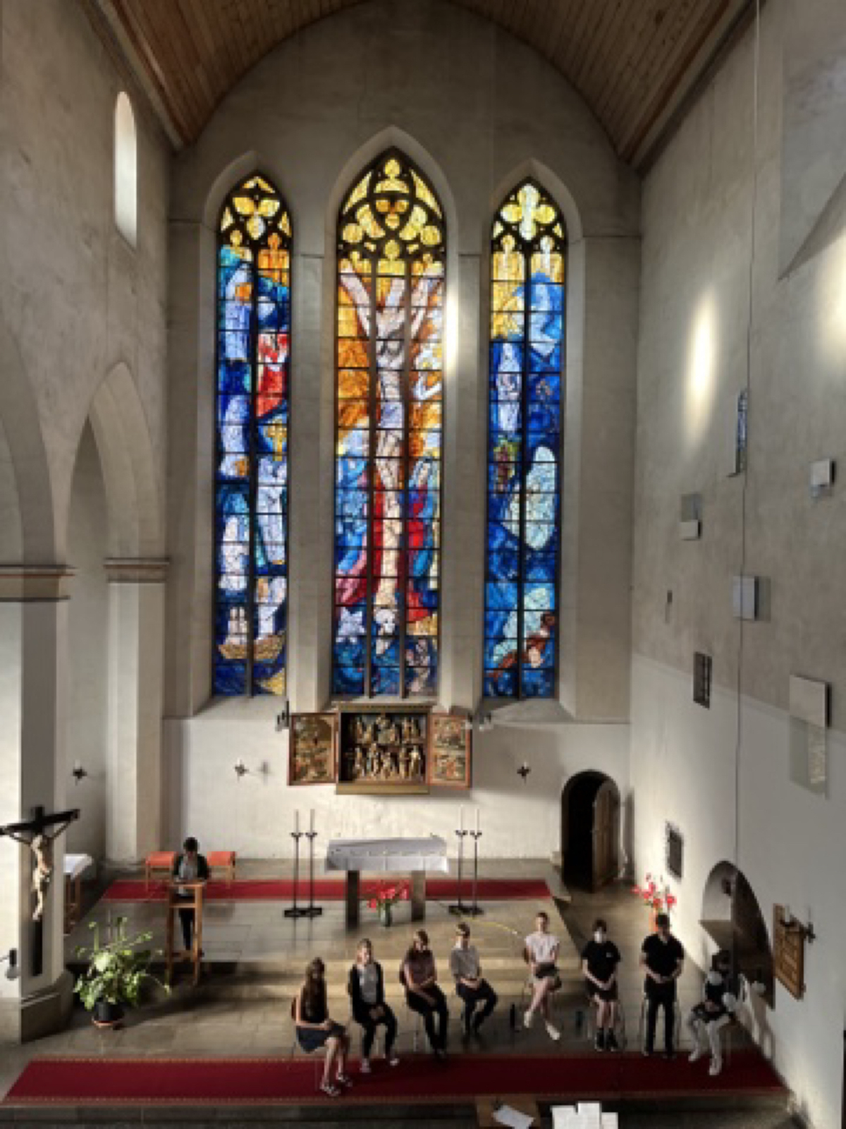 Eingetaucht in stimmungsvolle Farbspiele bot die Ursulinenkirche wieder einen beeindruckenden Rahmen für die Stille, die Texte und die Klänge, denen die Besucher des LichterAusblicks am vergangenen Freitag beiwohnen konnten. Nach der Pandemiepause waren sowohl Beteiligte, als auch Gäste froh, dass diese wichtige Tradition zum Jahresanfang wieder aufgenommen werden konnte. Zur Jahreslosung „Du bist ein Gott, der mich sieht!“ wurden inhaltliche Impulse gegeben und das Vokalensemble sowie Instrumentalisten der Schule setzen sie musikalisch in Szene. Ein großer Dank gilt auch der Technik AG, die Sound und Illumination wieder perfekt abgestimmt hatten.