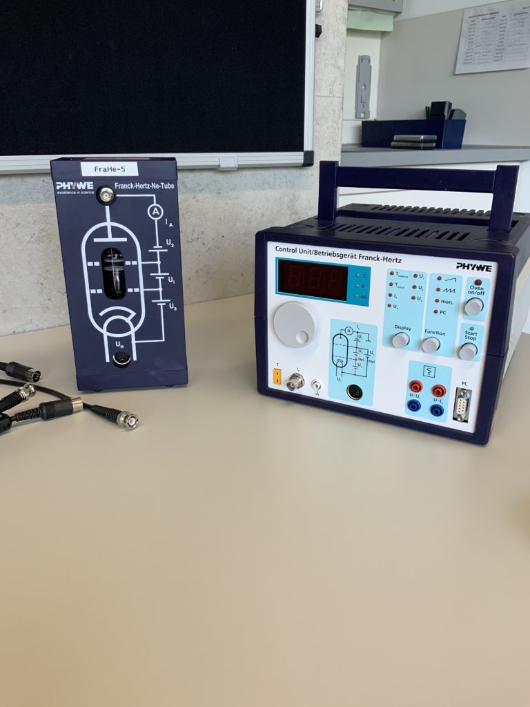 Das erste Experiment zur Quantenmechanik war der Elektronenstoßversuch nach Franck und Hertz -also eines, in Anlehnung an einen historischen Versuch. Hierbei wurde mittels der Franck-Hertz-Neonröhre die Energieaufnahme von Atomen (hier: Neonatome) durch beschleunigte Elektronen untersucht. Der sich aus den Messwerten ergebende Graph zeigte eine quantisierte – man könnte sagen eine stufenweise – Energieaufnahme und verdeutlichte, dass die Gesetze der Mechanik auf dieser mikroskopischen Ebene nicht anwendbar sind.