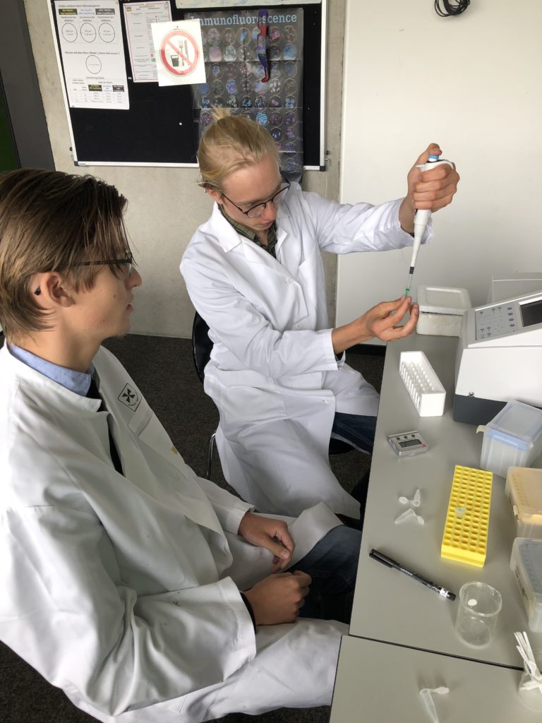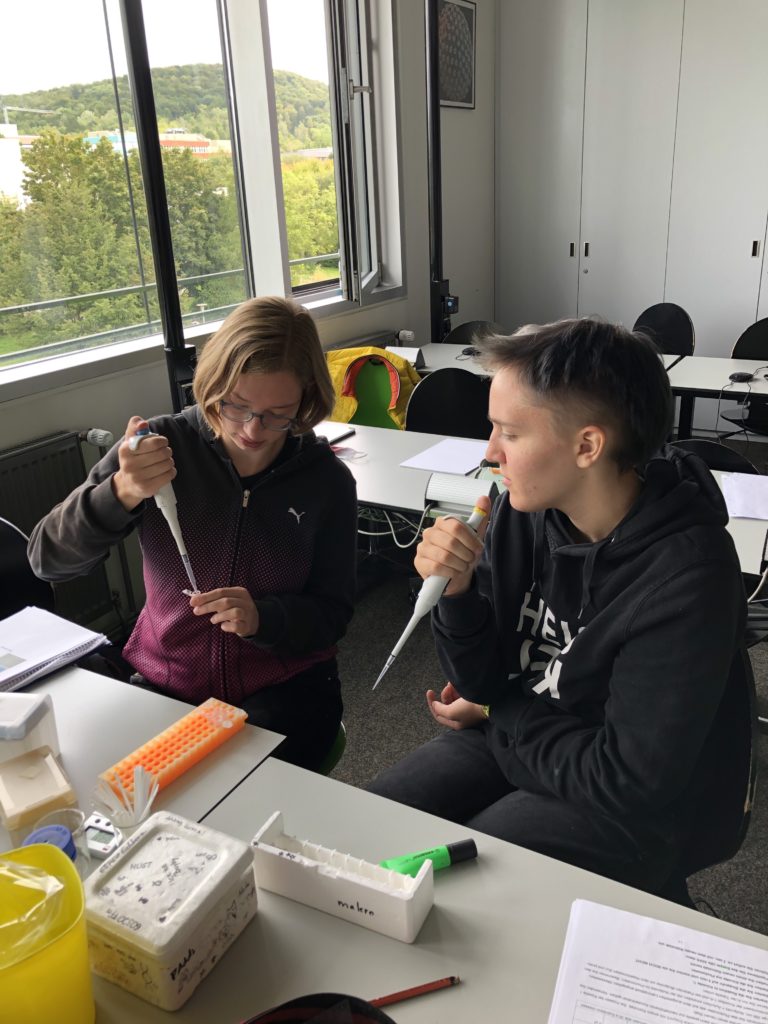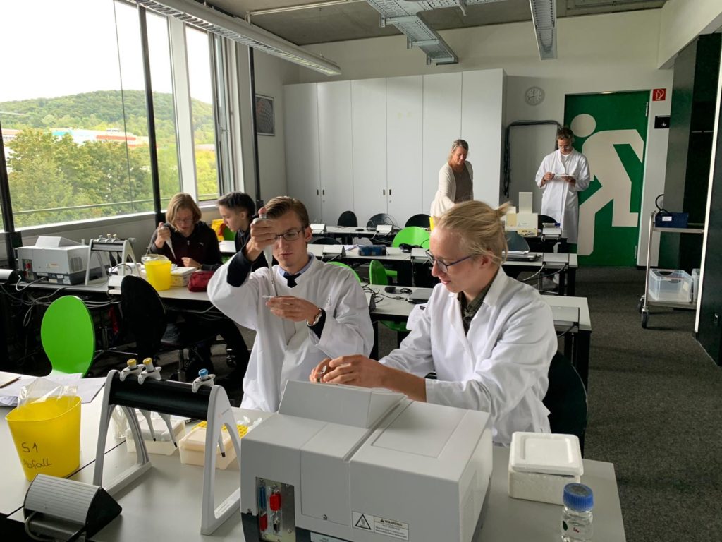 Im Labor angekommen haben wir Experimente zu verschiedenen chemischen beziehungsweise biochemischen Themen durchgeführt, unter anderem zur Enzymkinetik. Nach einer theoretischen Einführung beziehungsweise Wiederholung zu den Enzymen, ihren Funktionen und ihrer Bedeutung durch Herrn Dr. Gries, konnten wir mit dem Experimentieren beginnen. Dabei beschäftigten wir uns mit dem Stoffwechselenzym ADH (Alkohol-Dehydrogenase). Dieses Enzym befindet sich vor allem in der Leber und leitet dort den Alkoholabbau ein. Denn durch das ADH wird Ethanol (Trinkalkohol) zu Acetaldehyd oxidiert und später, durch ein weiteres Enzym namens Aldehyd-Dehydrogenase, zu Essigsäure umgebaut. Die Bildung von Acetaldehyd beim Ethanol-Abbau lässt sich nur indirekt beobachten, da beide Stoffe, Ethanol und Acetaldehyd, farblos sind. Jedoch entsteht bei dieser Reaktion das Coenzym NADH, dessen Absorptionsverhalten man nutzt, um die Veränderungen der Substratkonzentration (hier: Ethanolkonzentration) und damit die Enzymaktivität beobachten und messen zu können. Dazu kommt ein sogenanntes Photometer („Lichtmesser“) zum Einsatz. Mit diesem Gerät lässt sich die Intensität des Lichtes einer bestimmten wählbaren Länge vor und nach dem Durchtritt durch eine wässrige Probelösung messen. Befindet sich zum Beispiel NADH in der zu untersuchenden Lösung, so kann Licht mit einer bestimmten Wellenlänge diese nicht mehr so gut durchstrahlen. Dieses „Verlorengehen“ von Licht bezeichnet man als „Absorption“ (lateinisch: aufsaugen, aufnehmen). Steigt also die Absorption, steigt auch die NADH-Konzentration. Daran lässt sich dann nicht nur die ADH-Aktivität beobachten, sondern auch die Geschwindigkeit der ADH-Reaktion ermitteln. Mithilfe dieses Wissens konnten wir zudem die Ethanolkonzentration einer unbekannten Lösung bestimmen, wie es beispielsweise auch bei einem Blutalkoholtest erfolgt. Es ist doch immer wieder erstaunlich wie komplex alltägliche Prozesse in unserem Körper sind und wie viel Spaß das Arbeiten im Labor macht. Alles in Allem hatte sich das frühe Aufstehen doch gelohnt und wir konnten aus dieser Exkursion sehr viel mitnehmen.