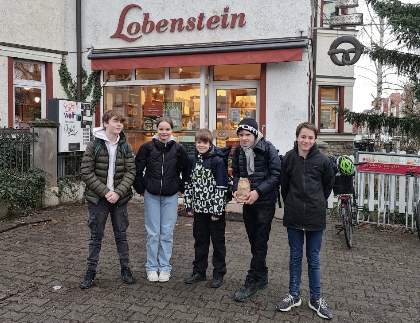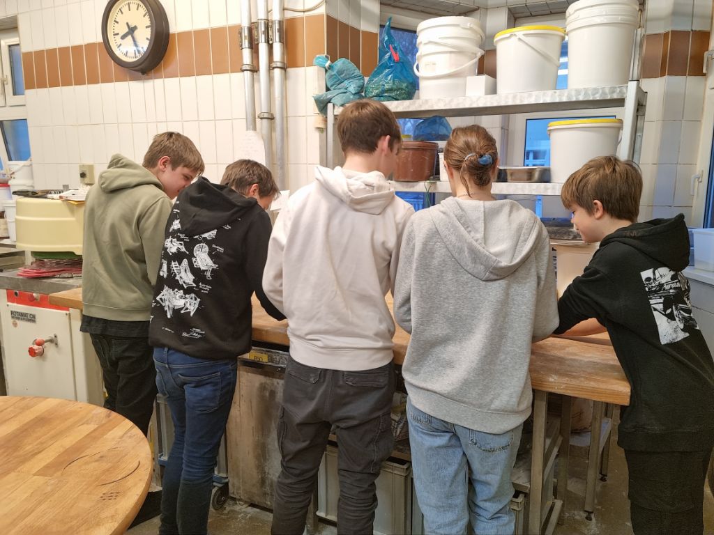 Am Donnerstag, 2.2.23 besuchten fünf Schüler*innen der 8d die Bäckerei Lobenstein. Um 7.45 Uhr ging es direkt in die Backstube. Dort durften die Schüler*innen nach kurzer Einweisung direkt Brezeln backen. Die Bäckerei gab den Schüler*innen anschließend einen spannenden Einblick die Abläufe in der Backstube, die Verwendung verschiedener Zutaten und der Bedeutung von Bioprodukten für die Bäckerei. Zum Abschluss durften die frisch gebackenen Brezeln mitgenommen bzw. verzehrt werden.