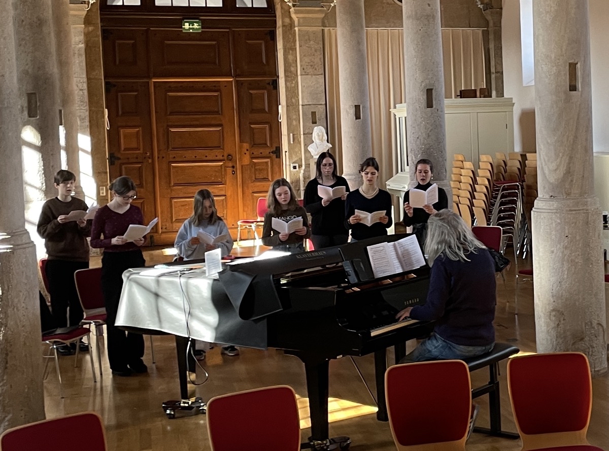 In den zweihundert Jahre alten Gemäuern erschallten von morgens bis abends verschiedenste Klänge. Der Chor nutzte unter anderem die Max-Reger-Halle als Übungsort, während das Orchester in einem der vielen Übungssäle fleißig musizierte. Von Pop-Liedern über Filmmusik bis hin zu geistlicher Musik kam nichts zu kurz. Bekannte Lieder wie Hedwigs Themevon Harry Potter, Shake it offund Viva la vidastanden auf dem Programm. Sogar ein eigenes Stück namens Lentrée dHabermannist dabei entstanden. Der Jugendchor VoicESS reiste mit über 50 Sänger:innen an und erarbeitete unter der Leitung von Ekkehard Fellner fünfzehn Werke, darunter neue Stücke wie zum Beispiel Shallowvon Lady Gaga, Irish Blessingund Bridge over Troubled Water. Doch auch die Wiederholung der Lieder des Grundrepertoire wie Clap Your Hands, African Allelujaund Halleluja, Praise the Lordkamen nicht zu kurz. Der VoicESS-Kammerchor studierte das spanische Cantarund Come with meein. Frau Wollensak unterstützte dabei den Chor mit Gesangsübungen und Stimmbildungsproben innerhalb der Stimmgruppen. Des Weiteren fand sich eine Schülergruppe zusammen, die morgens und abends eine kleine Andacht anbot.