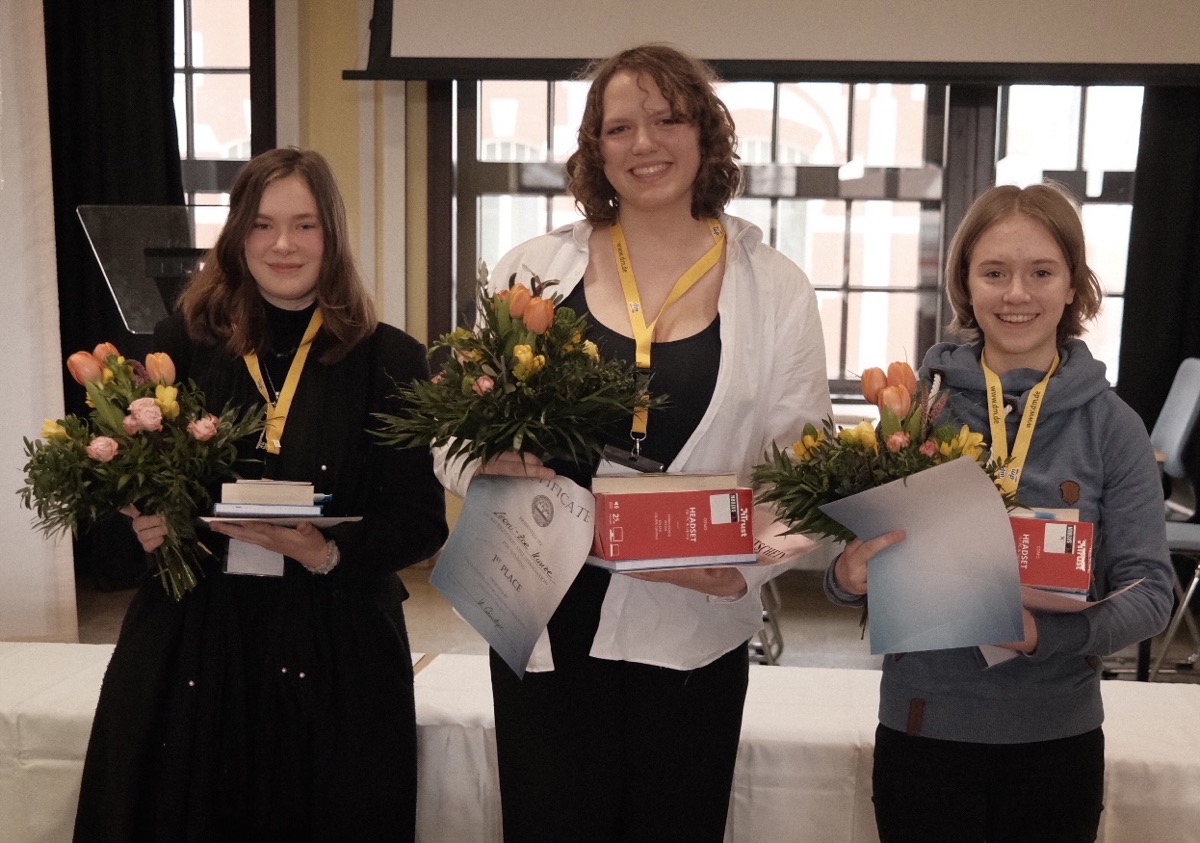 Nach einem musikalischem Auftakt durch das Schulorchester  stellten  die 36 ausgewählten Schüler*innen der 9. Klassen der Erfurter Gymnasien und Gesamtschulen ihre Sprachkompetenzen unter Beweis. Parallel dazu werteten die begleitenden Lehrer*innen die Ergebnisse in den einzelnen Bereichen aus. So konnten bereits am Mittag die Ergebnisse verkündet, die Sieger gekürt und die Preise verteilt werden. Vor der Preisverleihung gab traditionell die Fremdsprachenassisstentin Jess Cooper einen Einblick in ihre Heimatregion Colorado in den USA. Bei der Preisverteilung gab es dann eine Premiere. Erstmalig teilten sich mit Leoni-Zoe Kunze (Ratsgymnasium) sowie Ameli Schwandt (Heinrich-Mann Gymnasium) zwei Schülerinnen mit der  identischen Punktzahl den ersten Platz. Anabel Rost (Kooperative Gesamtschule) erreichte nach den verschiedenen Testaufgaben im Lesen, Schreiben, Hörverstehen, der Landeskunde und beim Sprechen die drittbeste Punktzahl. Nach den zahlreichen  Podestplätzen in den letzten Jahren landeten unsere Schüler*innen im immer noch starken Mittelfeld – einfach sehr höfliche Gastgeber.