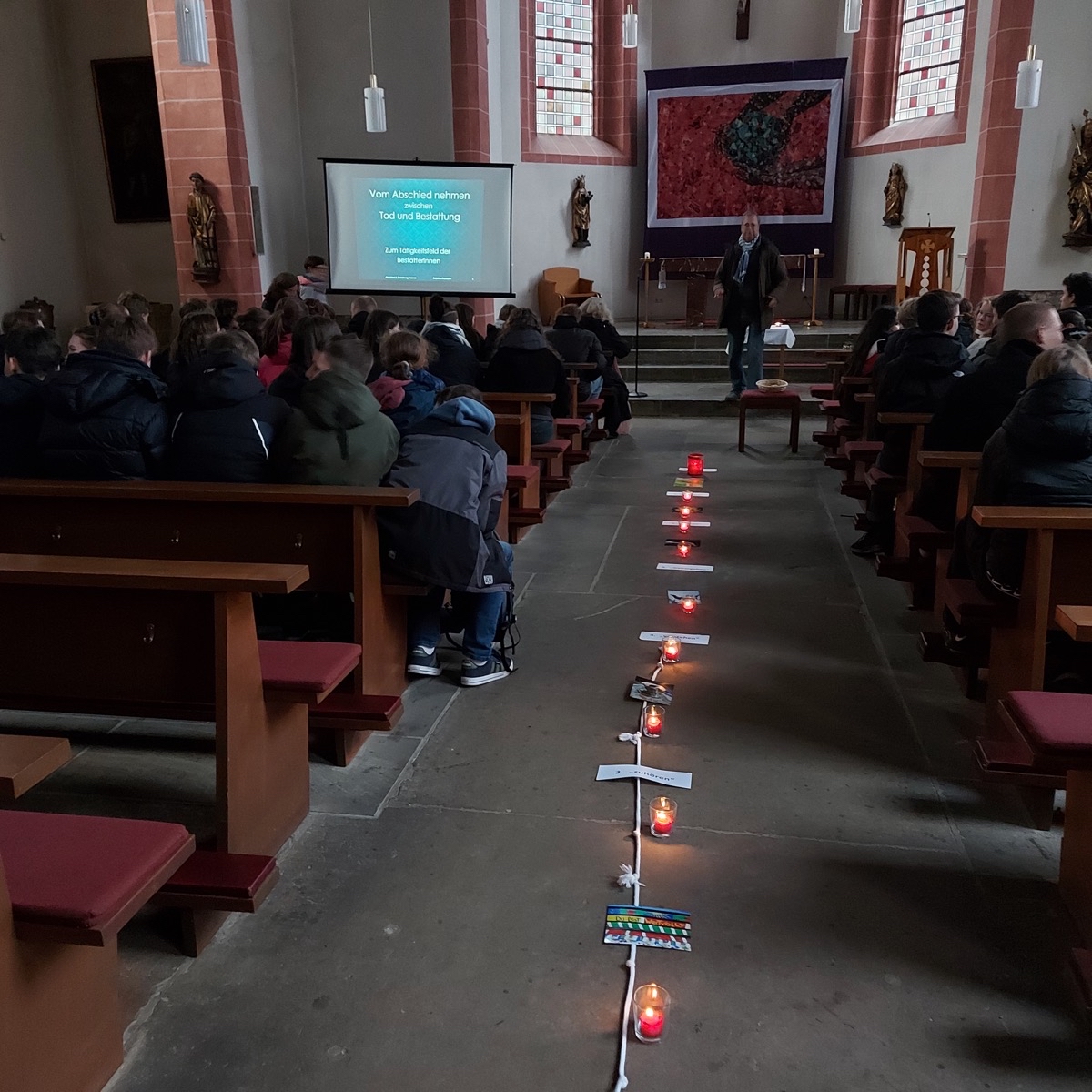 Der Tag begann mit einer Eucharistiefeier, deren zentrales Thema Sterbebegleitung war. Pater Jeremias konnte den Schüler*innen mit Hilfe der biblischen Emmausgeschichte wichtige Schritte für die Begleitung Trauernder oder Sterbender veranschaulichen, wie sie auch in der Hospizarbeit verwendet werden.