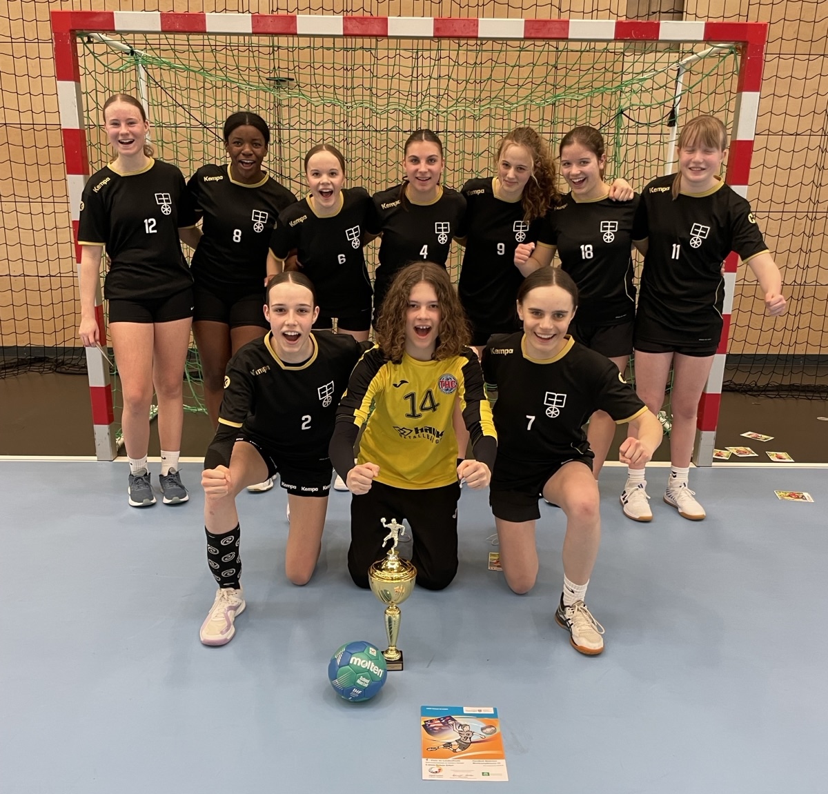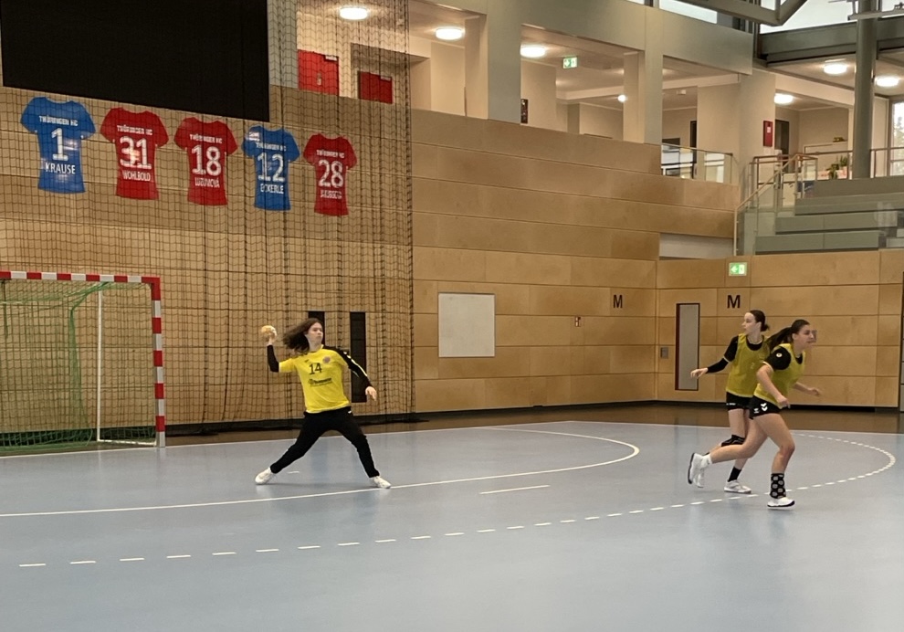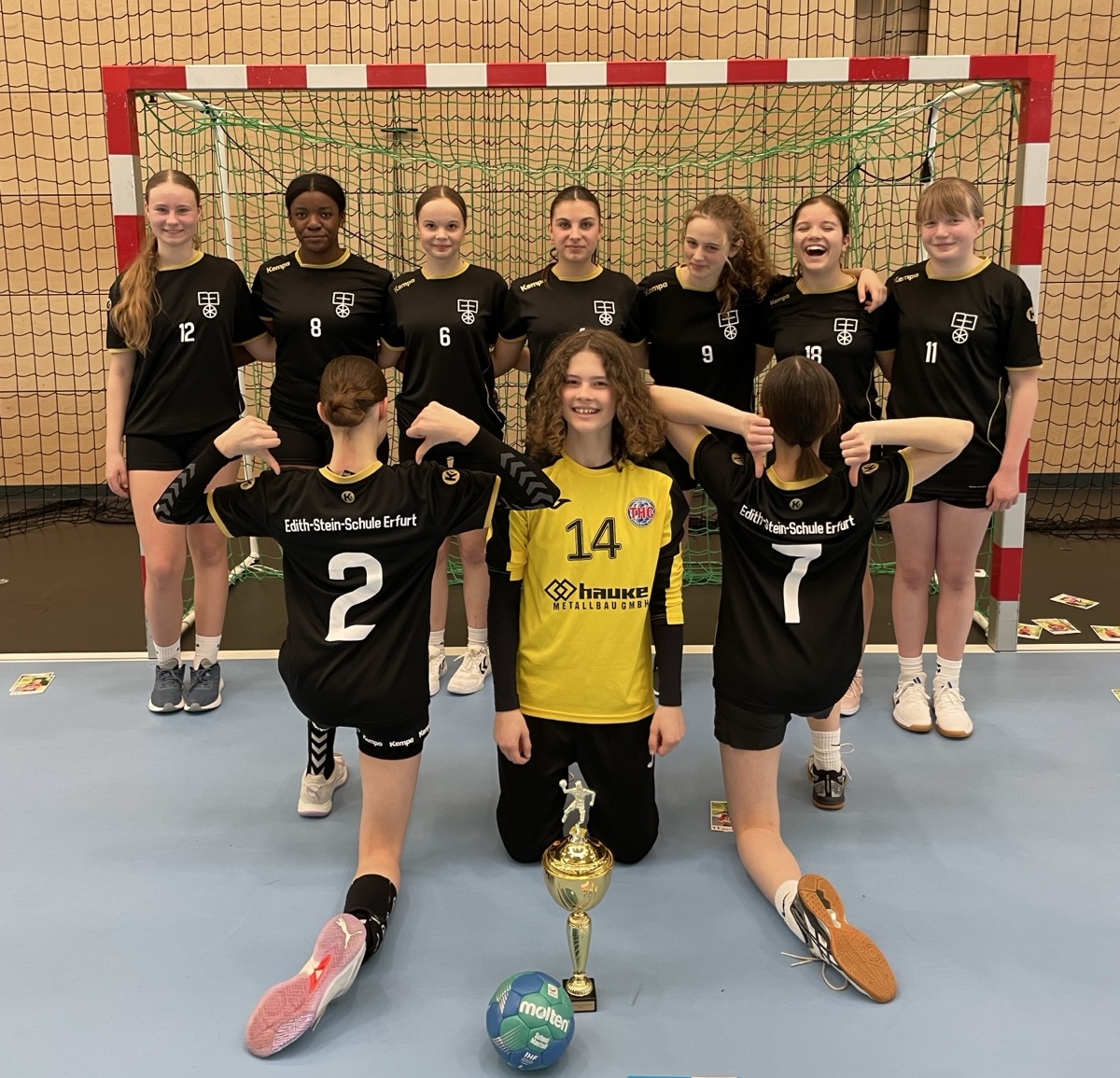 Einen wahrhaft traumhaften Tag erlebten unsere Handballerinnen der WK III beim JtfO Landesfinale in Bad Langensalza. Nach vier Spielen und vier Siegen war der erstmalige Einzug einer Handballmädchenmannschaft der Edith-Stein-Schule ins Bundesfinale perfekt. Im Auftaktspiel gegen das Holzland Gymnasium Hermsdorf, das Thüringen mit der fast identischen Mannschaft im letzten Jahr in Berlin vertreten hatte, gewannen unsere Mädchen ungefährdet mit 7:5. Im zweiten Spiel standen vom Salza Gymnasium Bad Langensalza spielerisch starke Gegnerinnen auf der Platte, die es vor allem mit ihrer Verteidigung und einer starken Torfrau dem Erfurter Team schwer machten. Durch immer wieder gut vorgetragene Angriffe auf Basis eines starken Rückhalts fanden die Würfe dennoch kontinuierlich ihr Ziel und so war das 7:3 Ergebnis am Ende recht deutlich. Auch gegen das Albert-Schweitzer-Gymnasium Ruhla gewann unsere WK III überzeugend mit mit 6:2. Damit war ihnen der Landestitel schon nicht mehr zu nehmen. Jedoch wolte man sich auch im letzten Spiel gegen die Regelschule Unterwellenborn keine Blöße geben und so wurde hier noch einmal alles in die Waagschale geworfen und mit 6:5 der vierte Sieg für die Mädchen der ESS eingefahren. Alles in allem überzeugten unsere Spielerinnen insbesondere mit einer souveränen und körperbetonten Verteidigung in Verbindung mit einer gut aufgelegten Torhüterin. Der Titel und Einzug ins Bundesfinale waren also mehr als verdient. Nachdem dem ersten Handballlandessieger der ESS 2020 die Reise nach Berlin aufgrund der Corona bedingten Absage verwehrt geblieben ist (>>>Bericht), werden die Mädchen nach mehreren Teilnahmen durch Hockey, Tennis, Basketball, Turnen und Leichtathletik im April die Edith-Stein-Schule in der nunmehr sechsten Sportart in Berlin repräsentieren. Ein gutes Abschneiden ist diesmal durchaus im Bereich des Möglichen. Wir drücken schonmal die Daumen!
