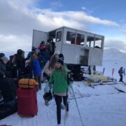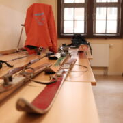 Im nächtlichen Regen wurden die Skilagerteilnehmer- und Lehrerinnen am Domplatz verabschiedet und so bangten sie auch zur Ankunft in Bramberg noch um die Schneebedingungen im Skigebiet, zeigte sich das Tal doch eher braun als weiß. Nach Gepäckausladekette und Skiausleihmarathon ging es dann endlich in die Gondel und nach oben. Die anfängliche Skepsis verflog, nachdem die 1500m Marke überquert wurde und jeder weitere Höhenmeter mehr alpine Winterlandschaft mit sich brachte. Wenn auch die 1,35m Schneehöhenangabe der Liftbetreiber leicht übertrieben waren, so fand die Erfurter Skidelegation beste Bedingungen vor, um sich in das Abenteuer Skifahren zu begeben. Das sollte auch nicht lange auf sich warten lassen, denn schon am Nachmittag stürzen sich die Erfahreneren auf die Piste und zogen ihre ersten Spuren in den Schnee. Die Nochanfänger hingegen machten sich an der Hütte mit den fahrbaren Untersätzen vertraut, damit sie genügend Sicherheit für die erste Abfahrt zum Lift sammeln konnten.