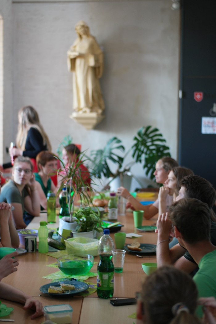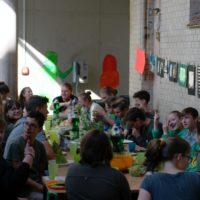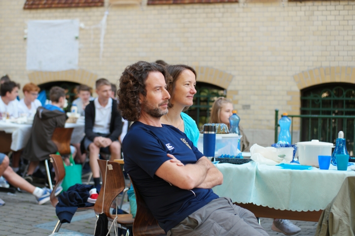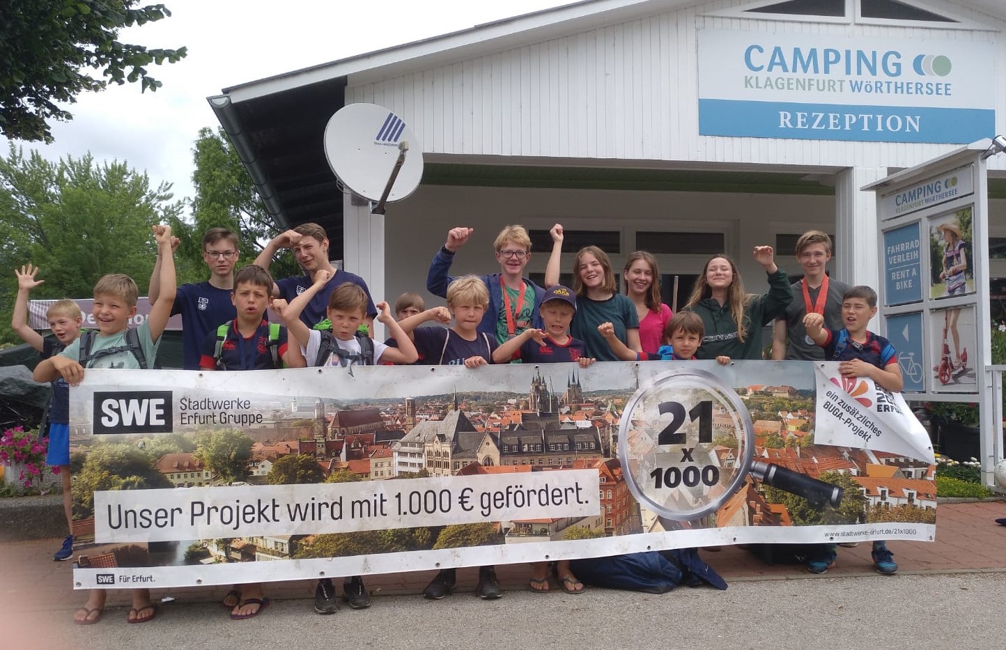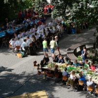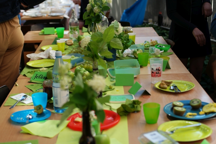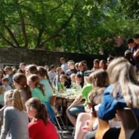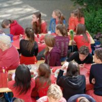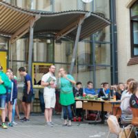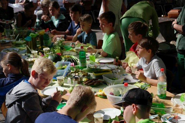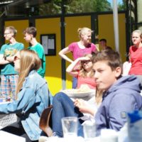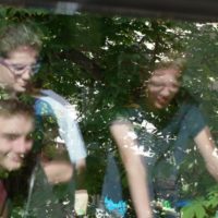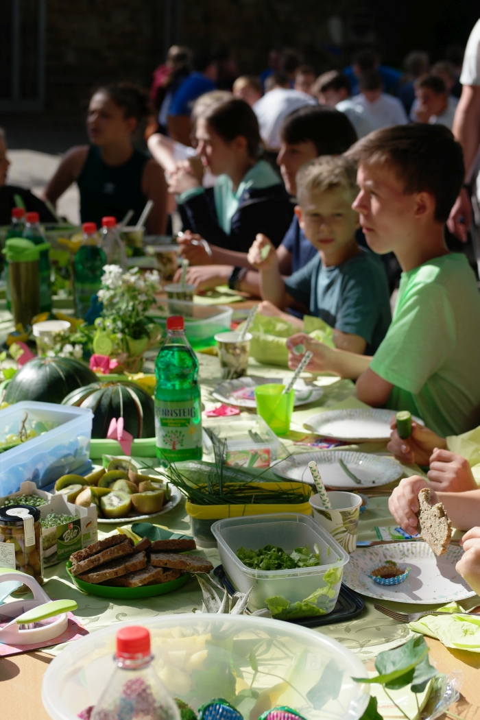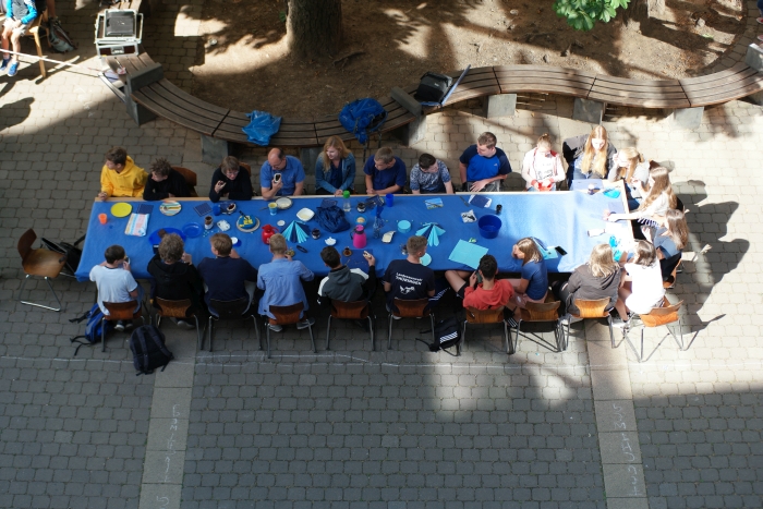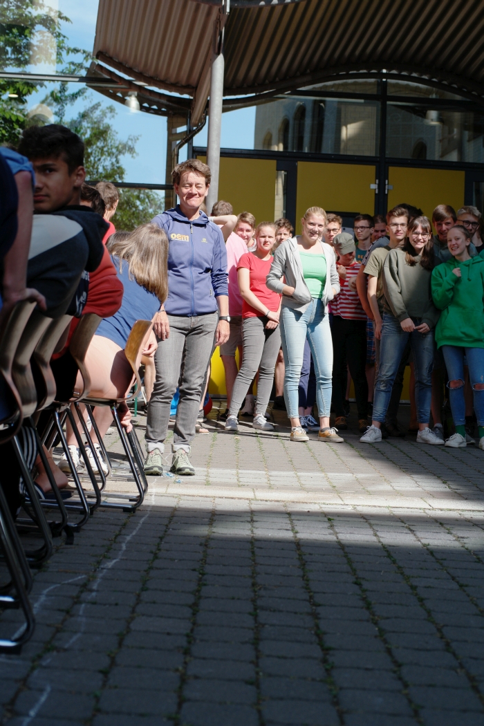 Nach einer gefühlt endlos langen heißen Fahrt in einem viel zu kleinem Waggon der DB mit weiteren sechs Klassen kamen wir endlich in Sondershausen an. Der Bus ließ lange auf sich warten, aber brachte uns dann schließlich auf den Berg und wir konnten unsere schicken Bungalows mitten im Wald auf dem Possen beziehen. Nach dem Mittag auf der Schlossterrasse ging es auch schon los: Wir trafen uns vor dem Kletterwald und nach einer kurzen Eiweisung und dem Anschnallen des Klettergeschirrs durften wir losklettern. Jakob schoss die Fotos während wir auf fünf Parcours mit unterschiedlichen Schwierigkeitsgraden die Höhen meisterten. Wir waren geschafft, als wir die Helme von unseren heißen Köpfen nehmen konnten. Ein 4 km langer schattiger Spaziergang zum Rondell mit weitem Blick zum Brocken und zum Kyffhäuserdenkmal ermöglichte das Sammeln von Brennholz und Stockbrotstöcken. Am heißen Lagerfeuer endete der erste Tag mit heißem Stockbrot und Liedern der 7b zur Gitarre.
