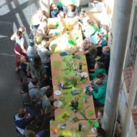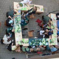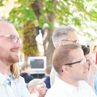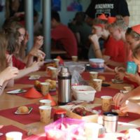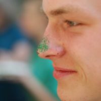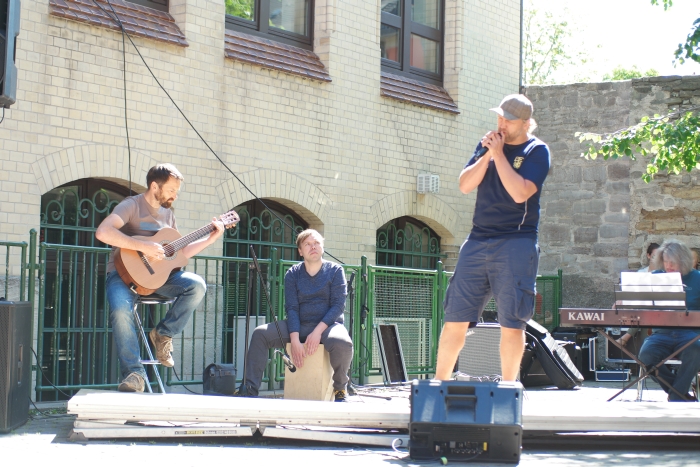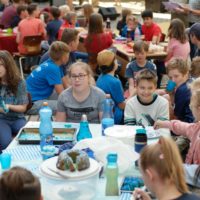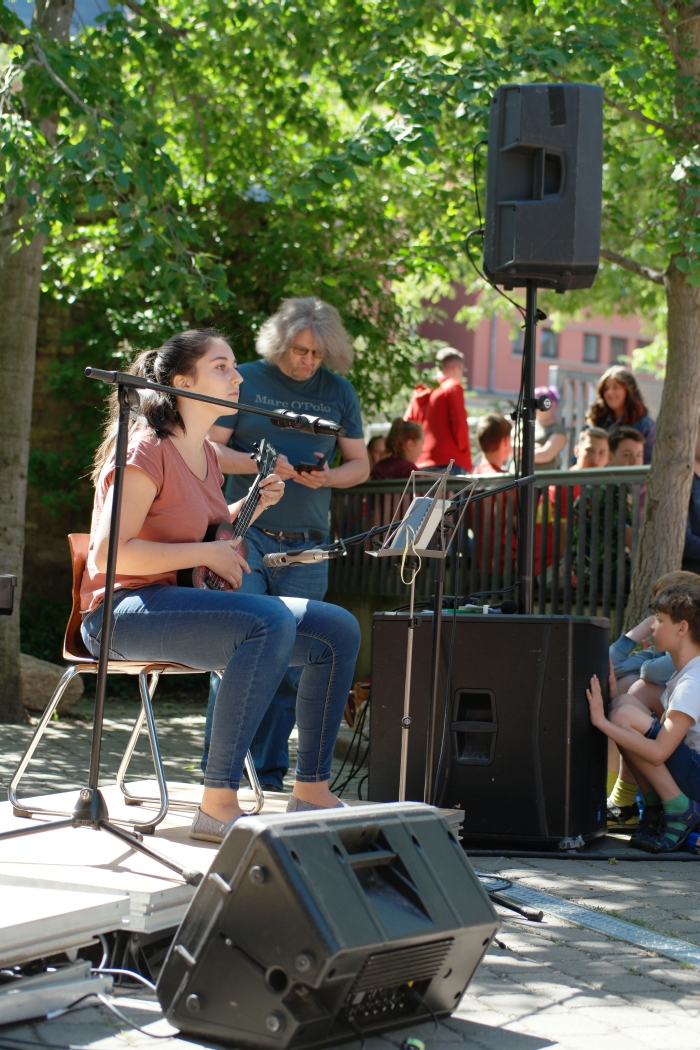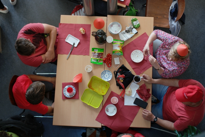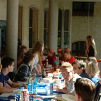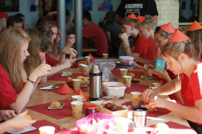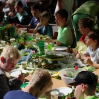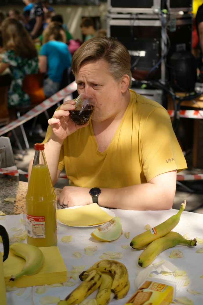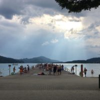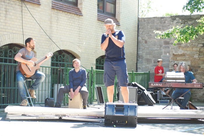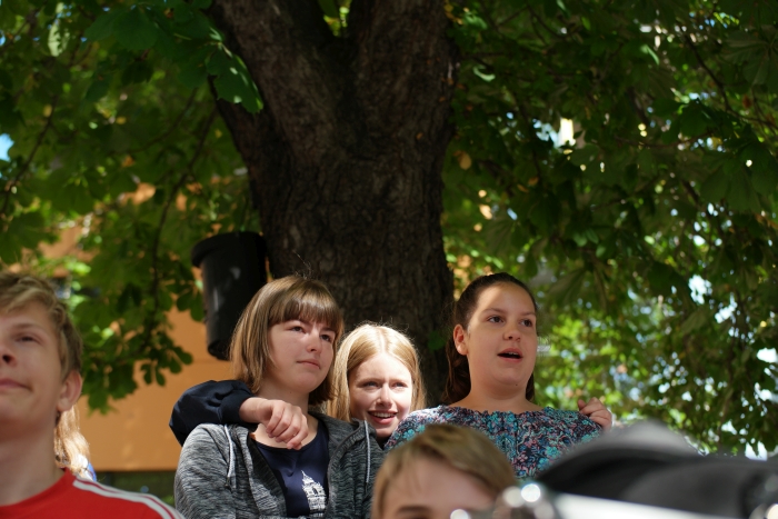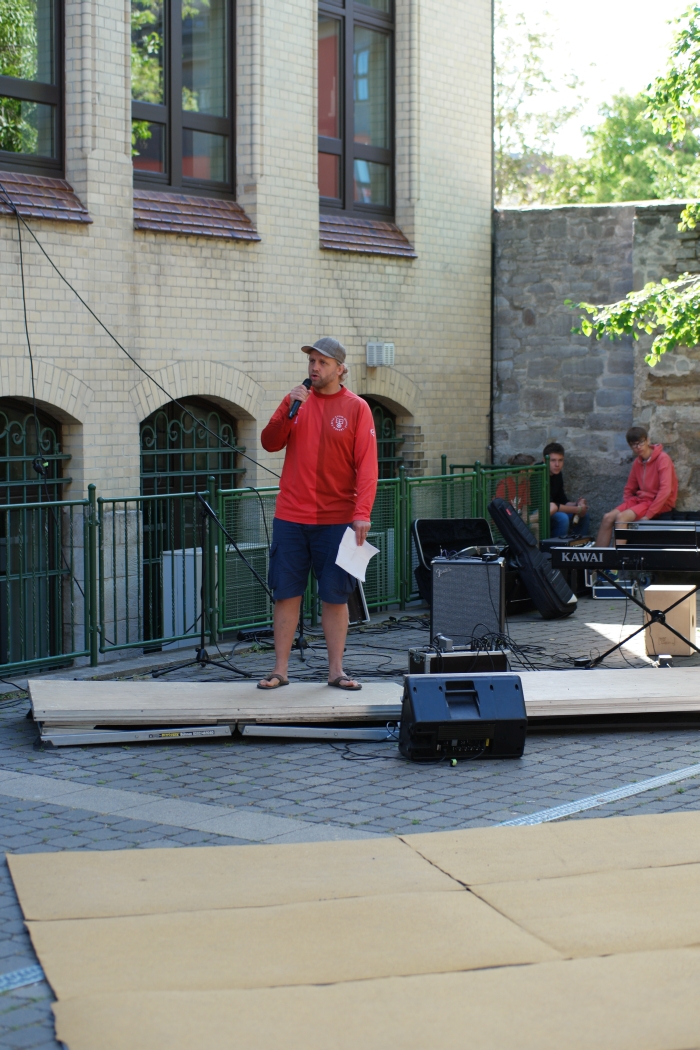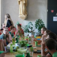 Nach einer gefühlt endlos langen heißen Fahrt in einem viel zu kleinem Waggon der DB mit weiteren sechs Klassen kamen wir endlich in Sondershausen an. Der Bus ließ lange auf sich warten, aber brachte uns dann schließlich auf den Berg und wir konnten unsere schicken Bungalows mitten im Wald auf dem Possen beziehen. Nach dem Mittag auf der Schlossterrasse ging es auch schon los: Wir trafen uns vor dem Kletterwald und nach einer kurzen Eiweisung und dem Anschnallen des Klettergeschirrs durften wir losklettern. Jakob schoss die Fotos während wir auf fünf Parcours mit unterschiedlichen Schwierigkeitsgraden die Höhen meisterten. Wir waren geschafft, als wir die Helme von unseren heißen Köpfen nehmen konnten. Ein 4 km langer schattiger Spaziergang zum Rondell mit weitem Blick zum Brocken und zum Kyffhäuserdenkmal ermöglichte das Sammeln von Brennholz und Stockbrotstöcken. Am heißen Lagerfeuer endete der erste Tag mit heißem Stockbrot und Liedern der 7b zur Gitarre.
