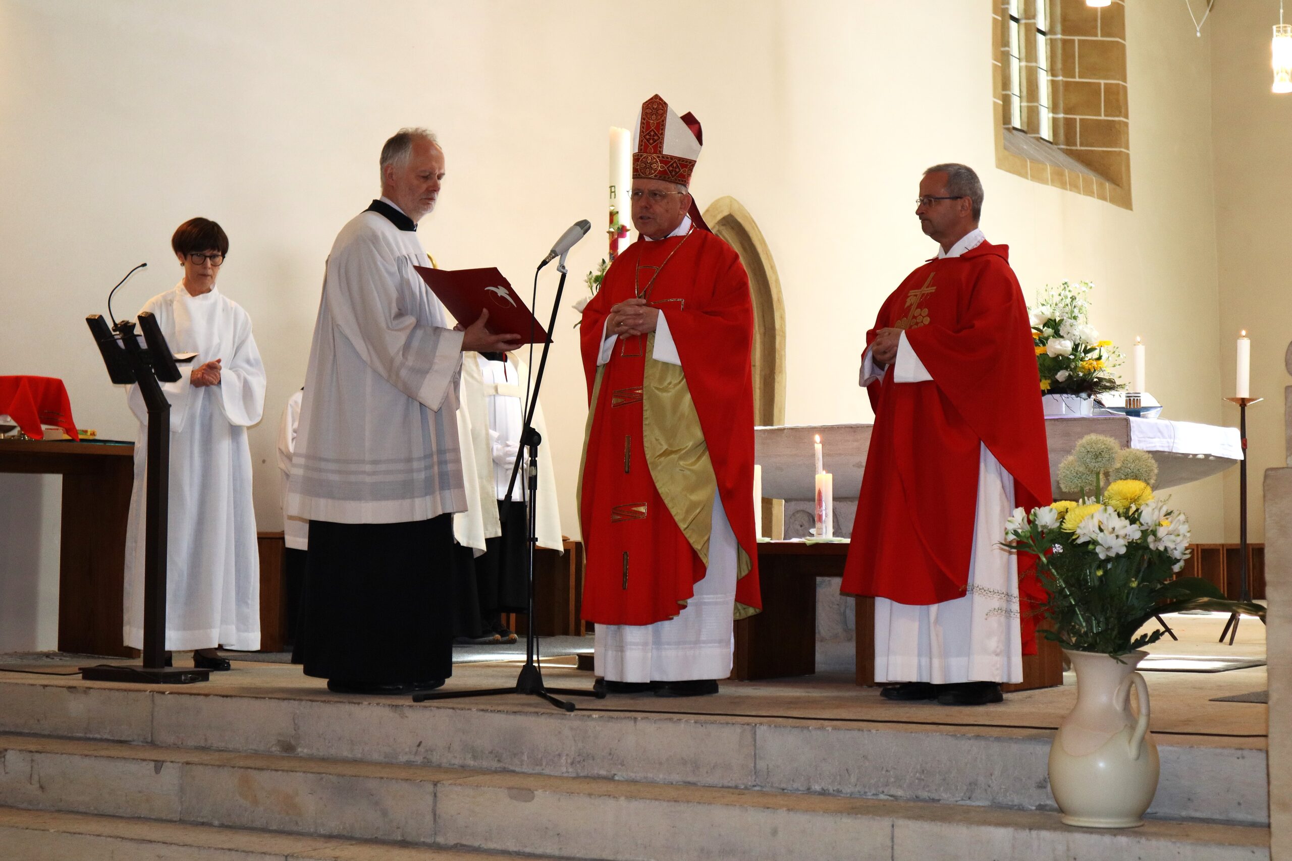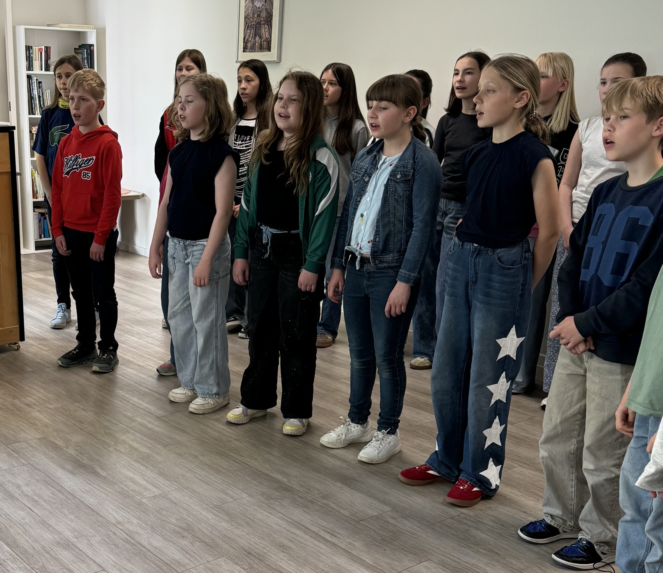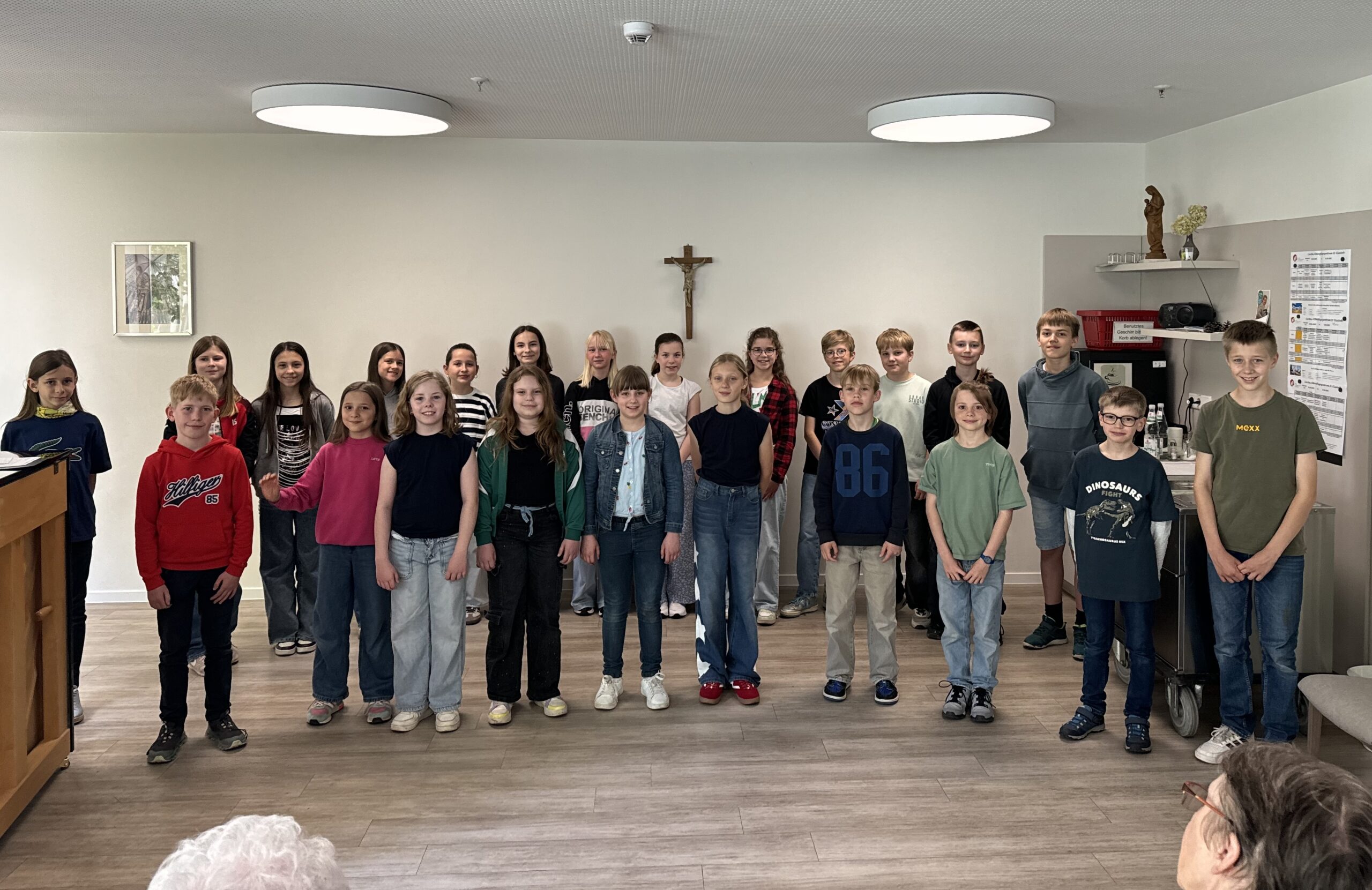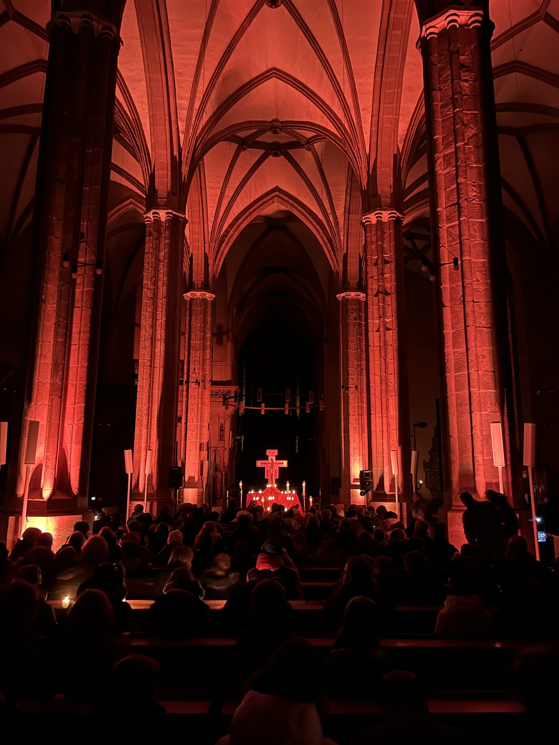 Viel Zeit zum Durchatmen blieb nicht, denn bereits warteten die Besucher*innen des zweiten Konzerts. Auch hier eröffnete das Orchester den Abend, doch das Programm, durch welches Annika, Mathilda und Lina jeweils führten, war keineswegs eine Wiederholung. Neue Stücke, zusätzliche Stimmen und weitere solistische Beiträge sorgten für frische Akzente, wie der Auftritt der Sänger*innen Musikkurse der Oberstufe, die mit großer Ausdrucksstärke und Leidenschaft überzeugten. Hervorzuheben sind dabei die Solistinnen Josephine und Sofia sowie Leonie, die von Elisabeth am Klavier begleitet wurden. Zahlreiche Besucher*innen und Ehrengäste verfolgten auch diesen zweiten Konzertteil, der mit dem abschließenden Segen des Bischofs einen feierlichen Höhepunkt fand. Beide Konzerte endeten traditionell mit einem gemeinsamen musikalischen Finale aller Beteiligten.