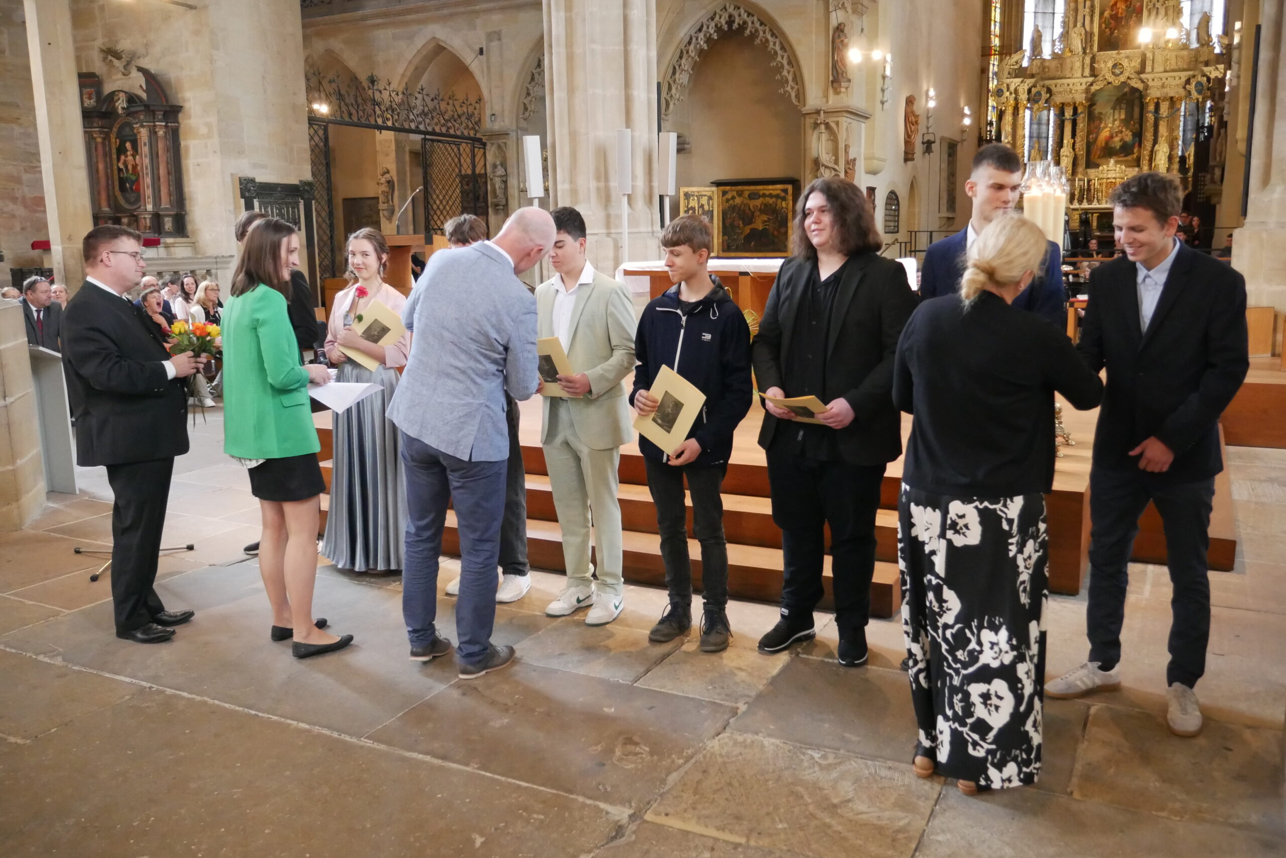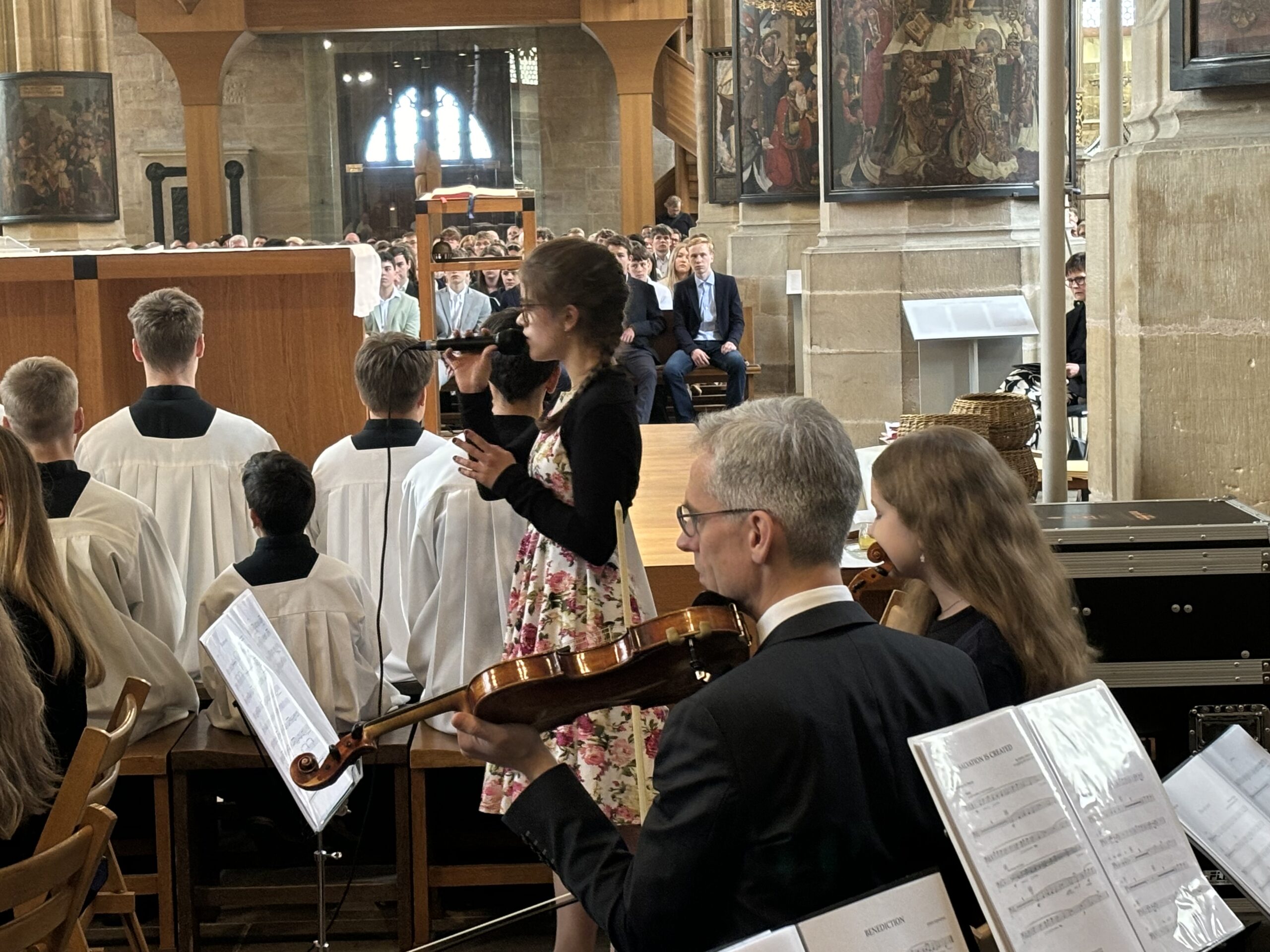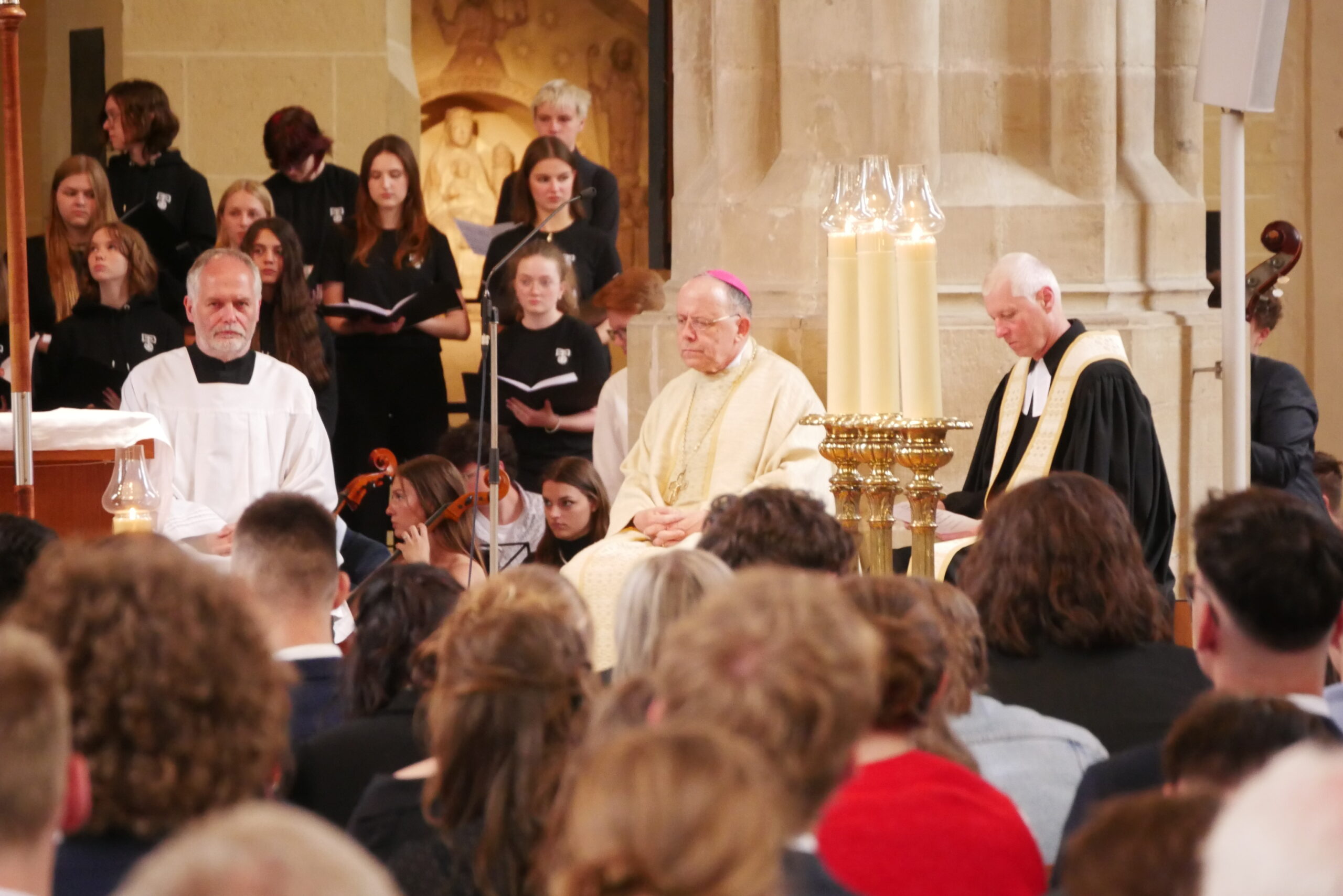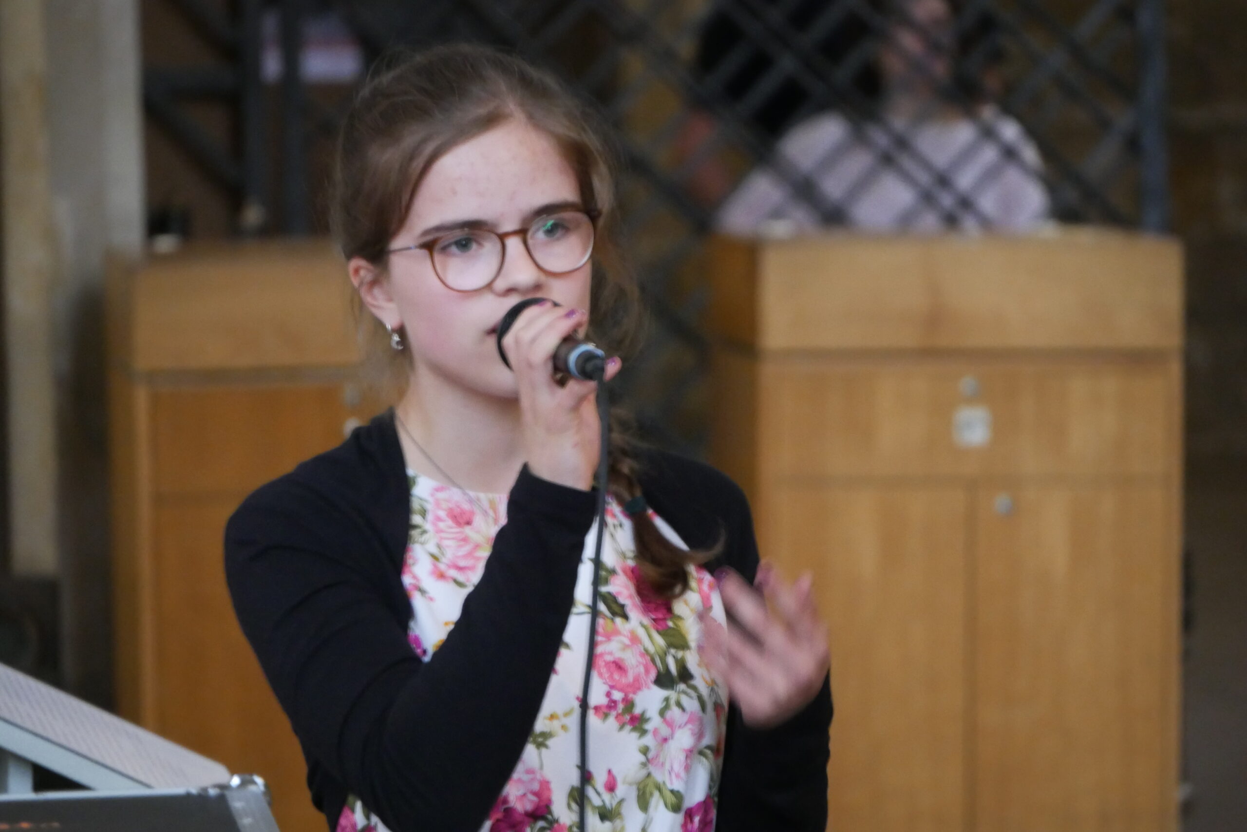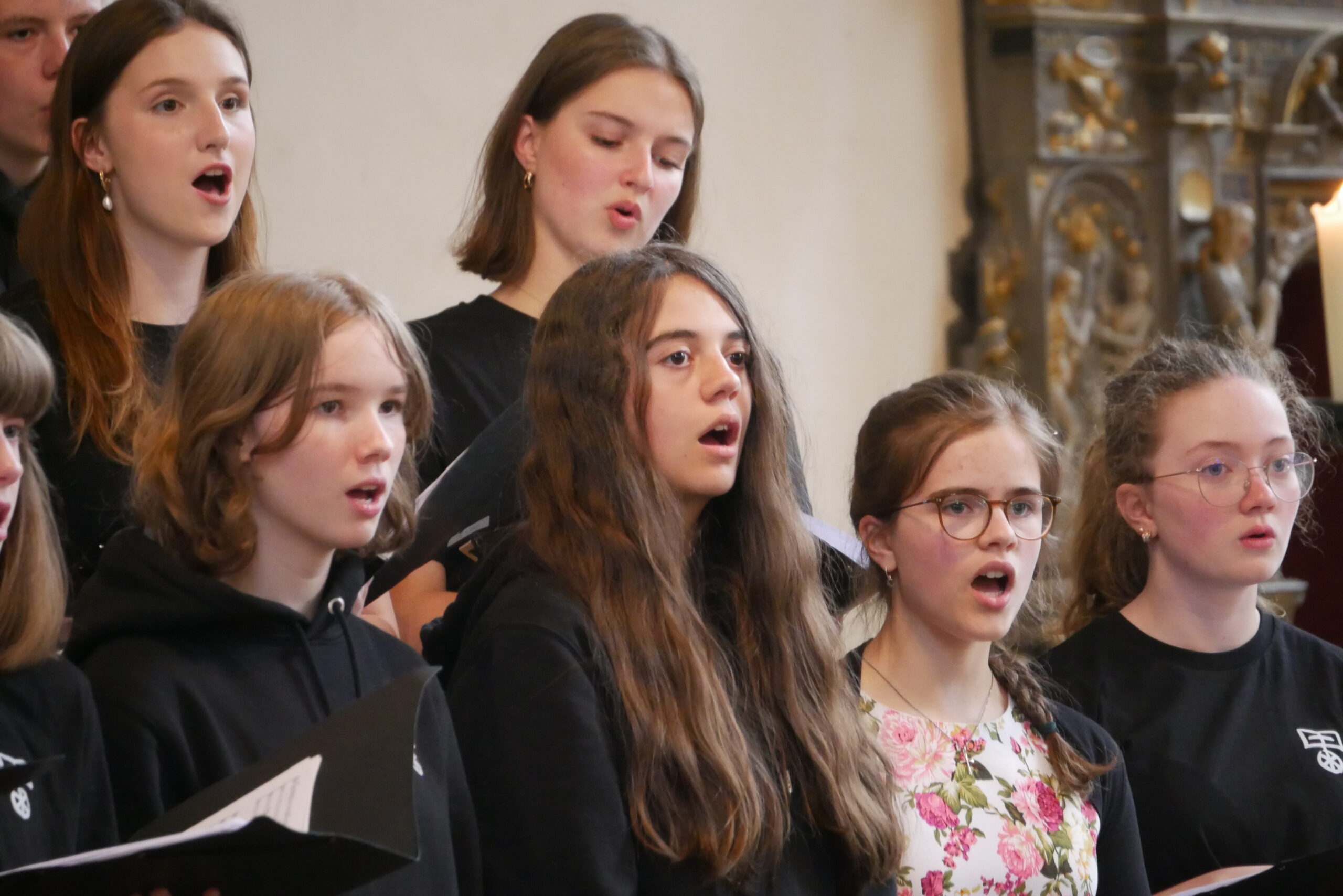 Singend zogen die Gottesdienstbesucher anschließend gegenüber ins Haus der Versöhnung zum zweiten Teil des Gottesdienstes. Sängerinnen und Sänger des VoicESS-Kammerchores der Edith-Stein-Schule Erfurt unter der Leitung von Ekkehard Fellner gestalteten den Gottesdienst musikalisch. Unter dem Leitwort „Frieden und Versöhnung“ wählten sie mehrstimmige Werke in verschiedenen Sprachen aus: „Fix You“ und „Bleib mit deiner Gnade“, dazu noch „Freunde, dass der Mandelzweig“, und „Hevenu shalom alejchem“. Magnus begleitete die Lieder am Klavier und beschloss die Andacht mit dem Chopins Prélude in Des-Dur.