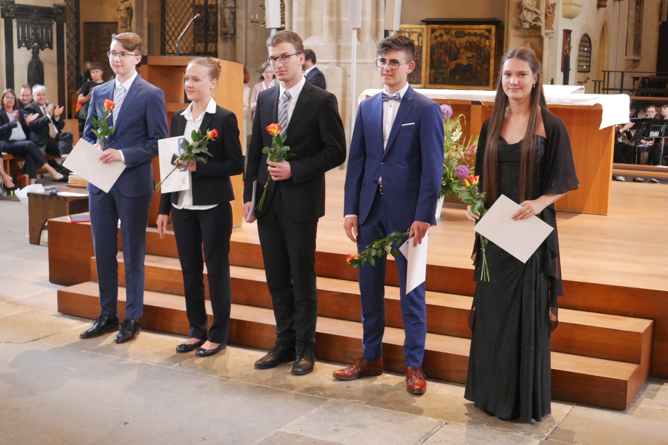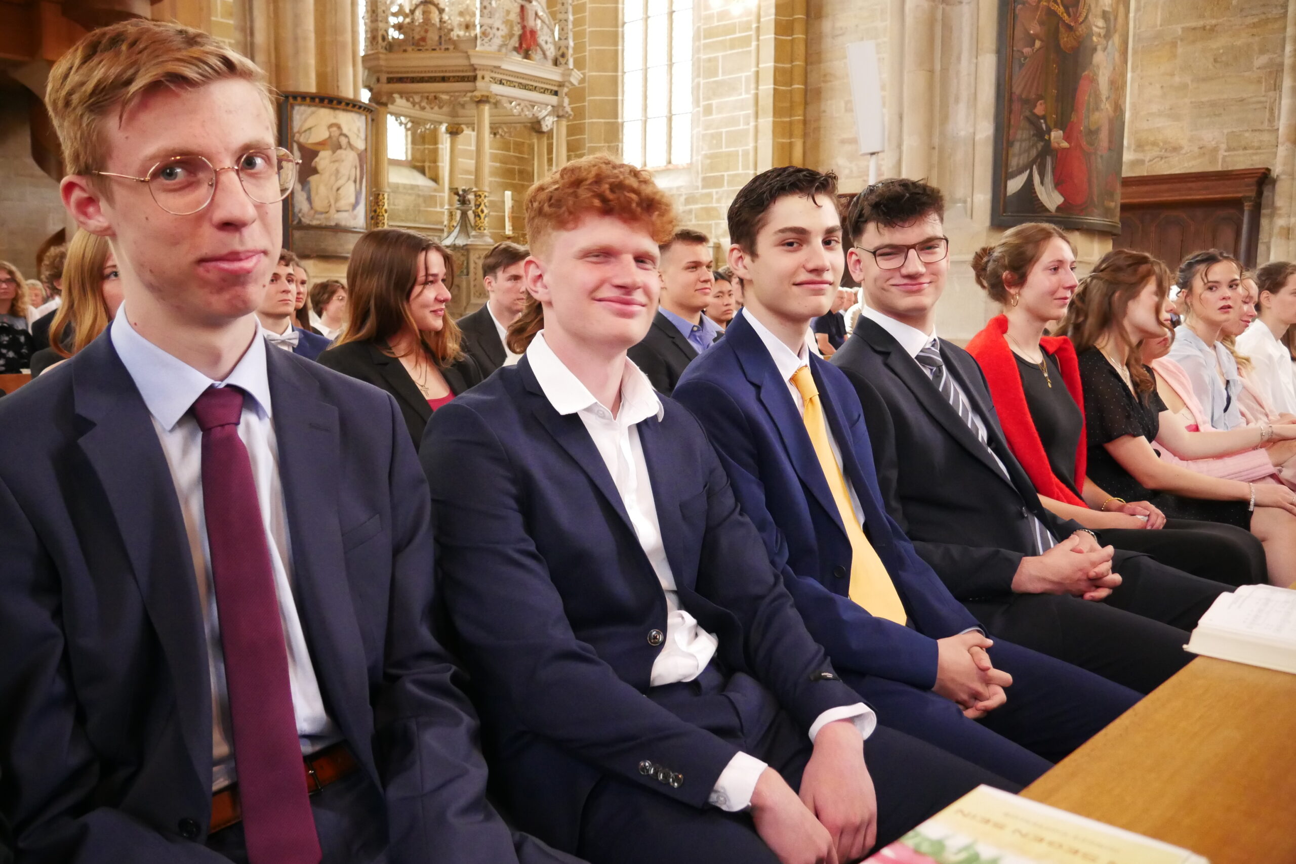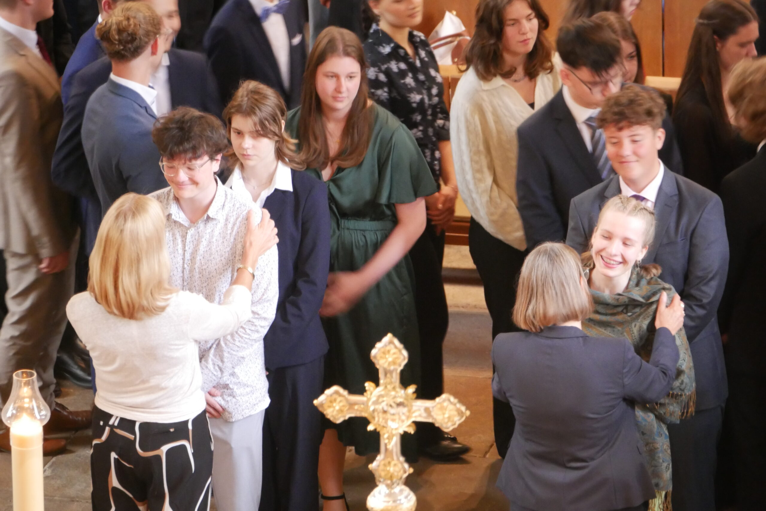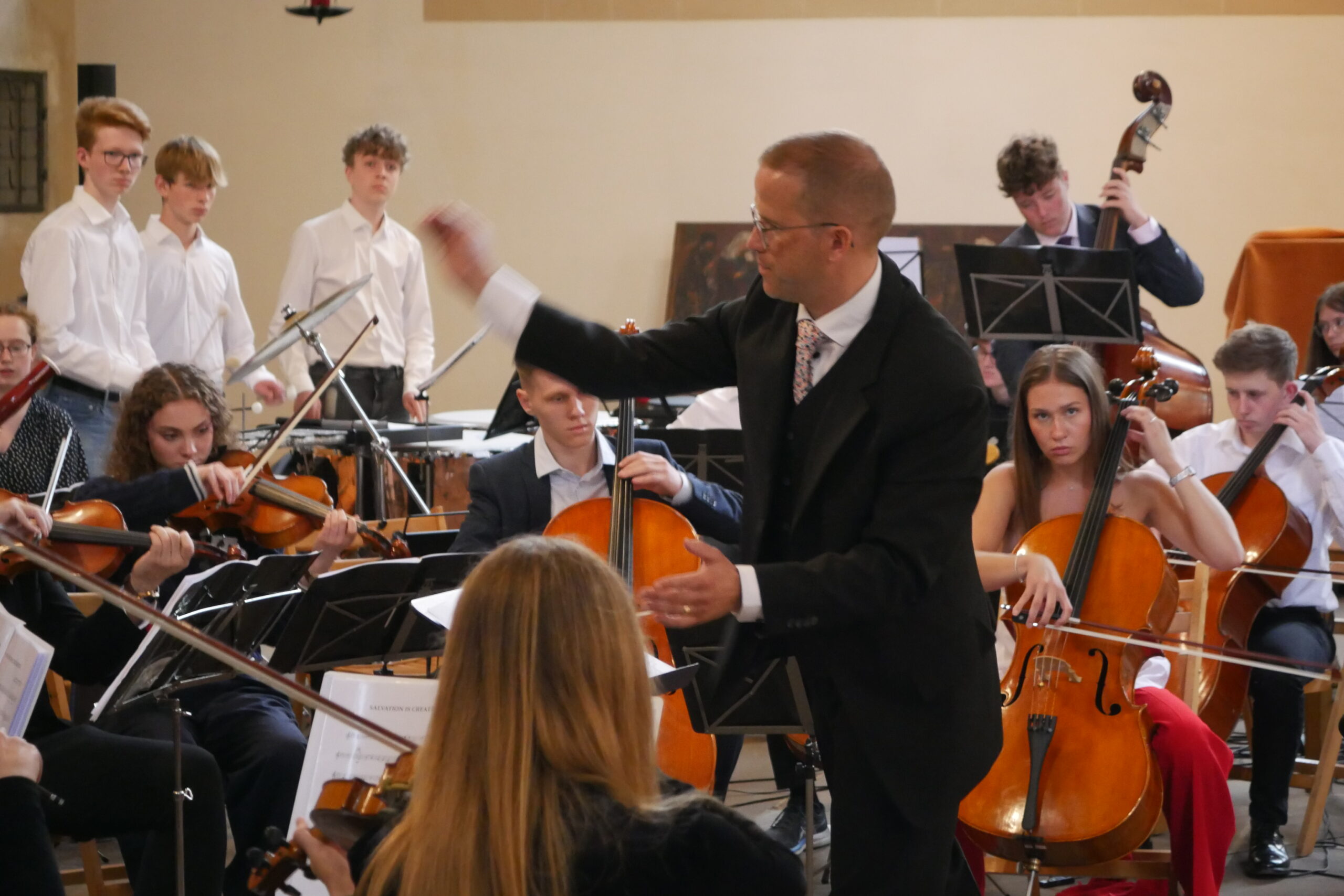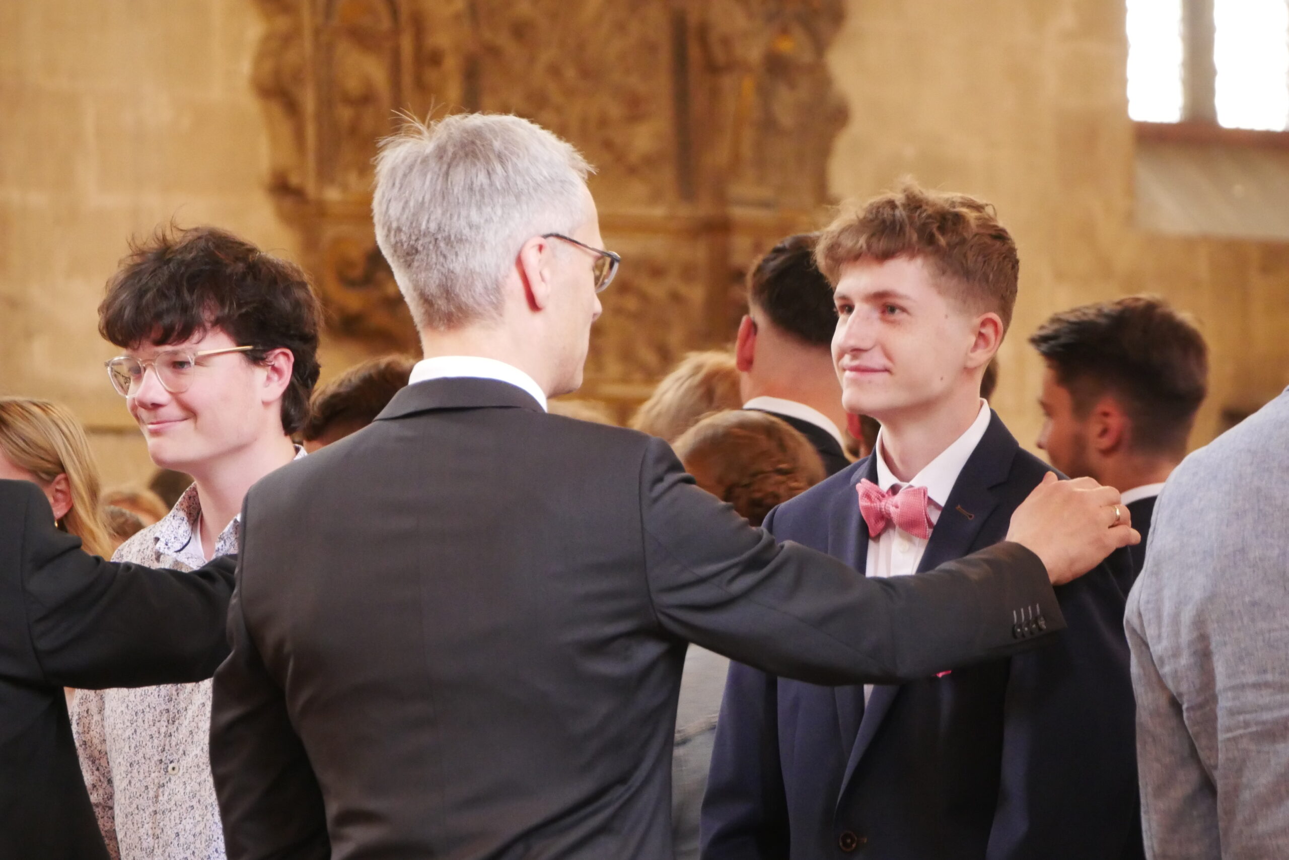Singend zogen die Gottesdienstbesucher anschließend gegenüber ins Haus der Versöhnung zum zweiten Teil des Gottesdienstes. Sängerinnen und Sänger des VoicESS-Kammerchores der Edith-Stein-Schule Erfurt unter der Leitung von Ekkehard Fellner gestalteten den Gottesdienst musikalisch. Unter dem Leitwort „Frieden und Versöhnung“ wählten sie mehrstimmige Werke in verschiedenen Sprachen aus: „Fix You“ und „Bleib mit deiner Gnade“, dazu noch „Freunde, dass der Mandelzweig“, und „Hevenu shalom alejchem“. Magnus begleitete die Lieder am Klavier und beschloss die Andacht mit dem Chopins Prélude in Des-Dur.