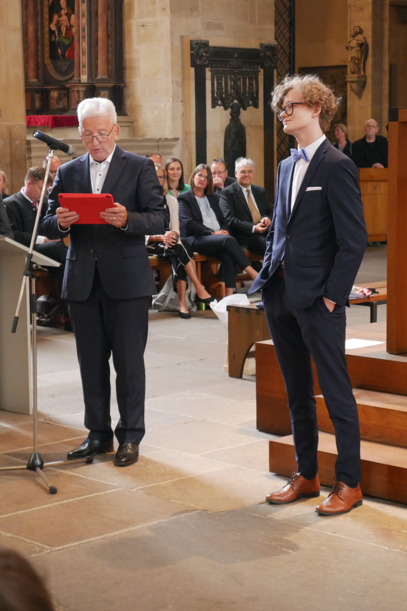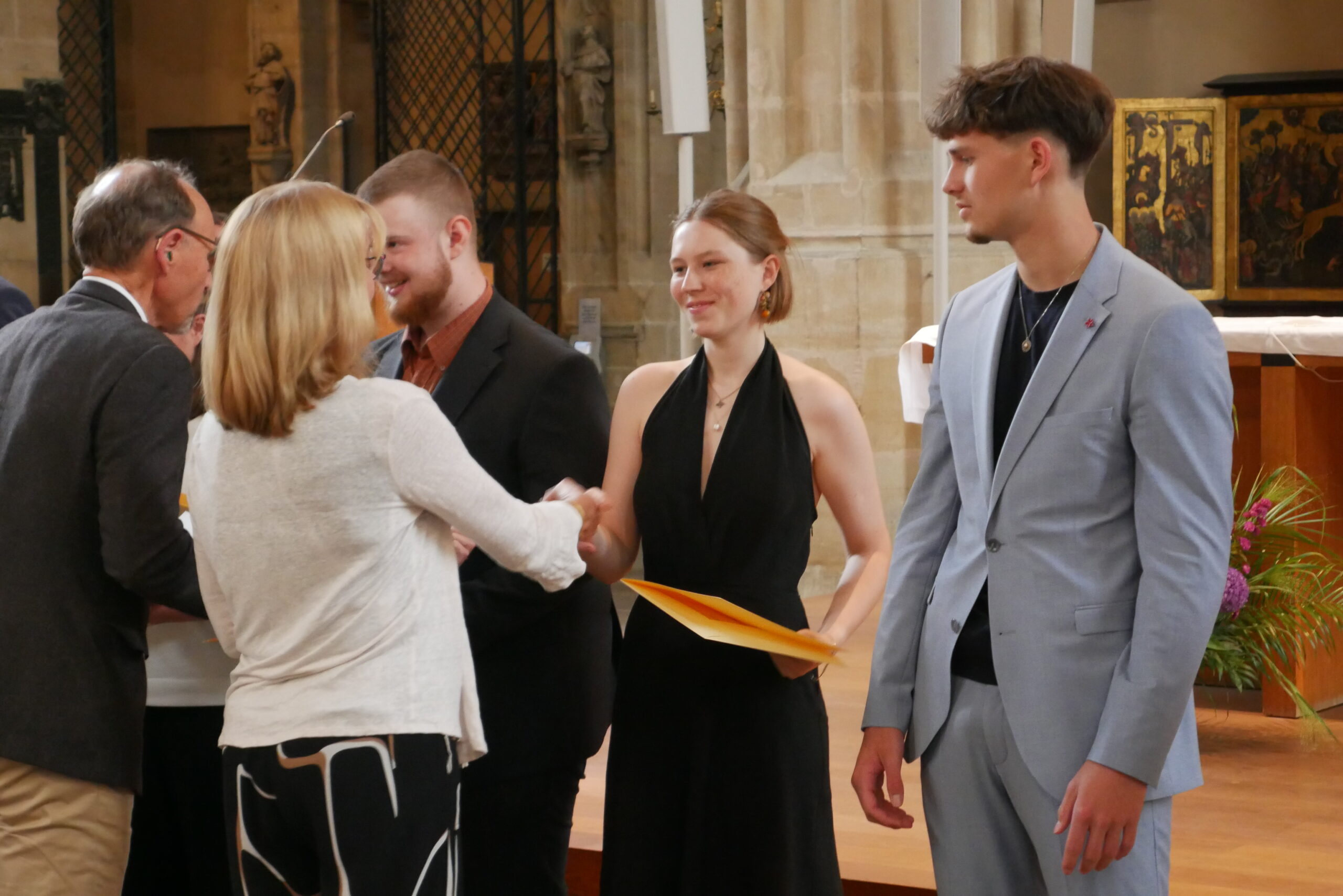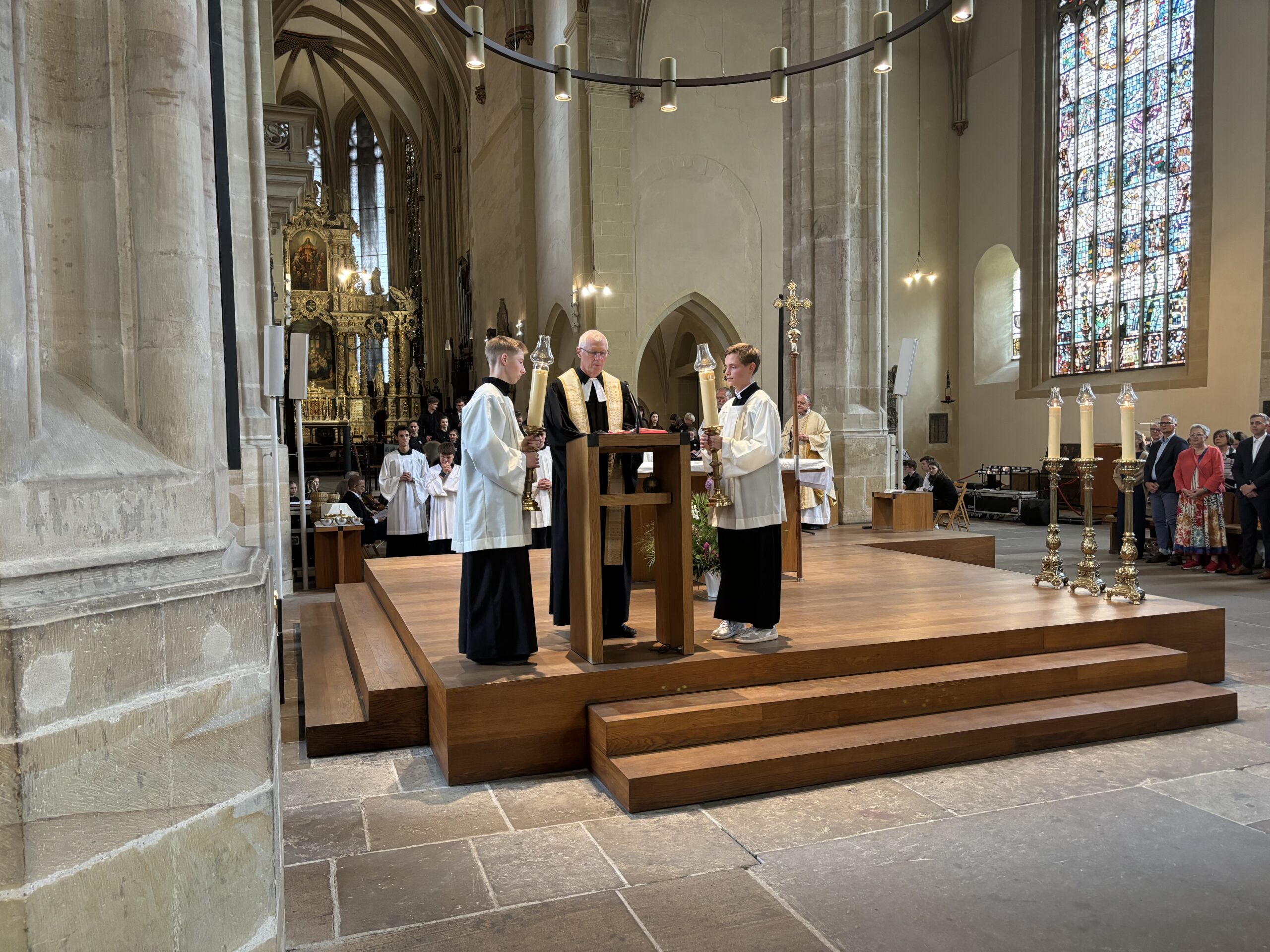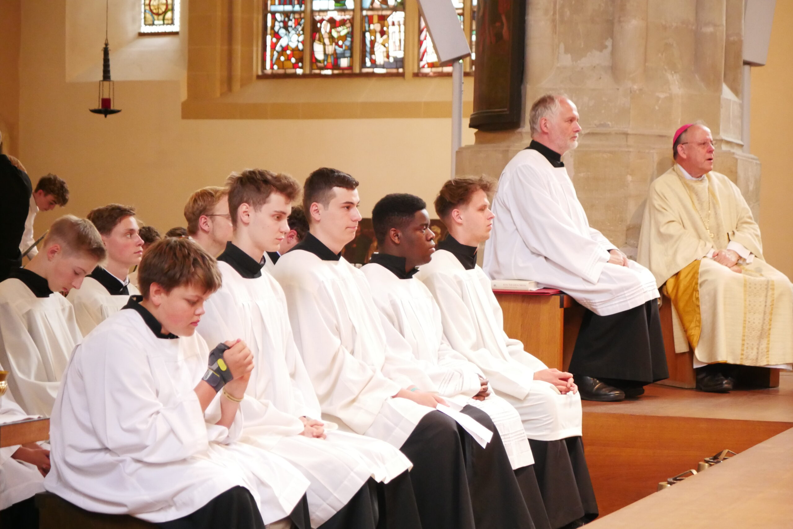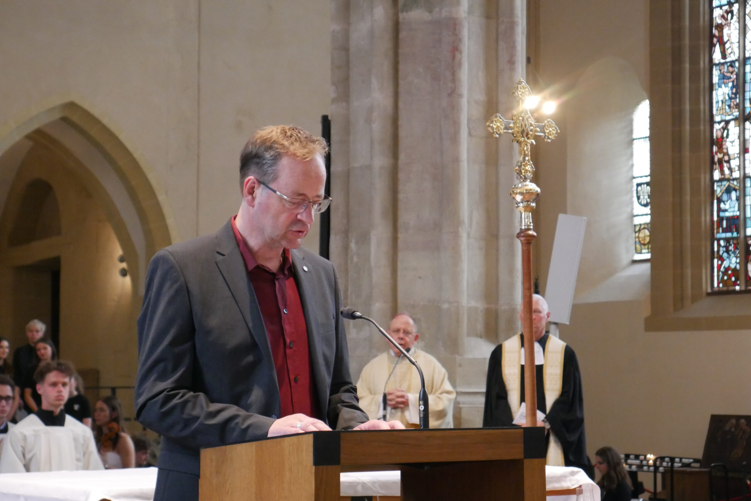 Singend zogen die Gottesdienstbesucher anschließend gegenüber ins Haus der Versöhnung zum zweiten Teil des Gottesdienstes. Sängerinnen und Sänger des VoicESS-Kammerchores der Edith-Stein-Schule Erfurt unter der Leitung von Ekkehard Fellner gestalteten den Gottesdienst musikalisch. Unter dem Leitwort „Frieden und Versöhnung“ wählten sie mehrstimmige Werke in verschiedenen Sprachen aus: „Fix You“ und „Bleib mit deiner Gnade“, dazu noch „Freunde, dass der Mandelzweig“, und „Hevenu shalom alejchem“. Magnus begleitete die Lieder am Klavier und beschloss die Andacht mit dem Chopins Prélude in Des-Dur.