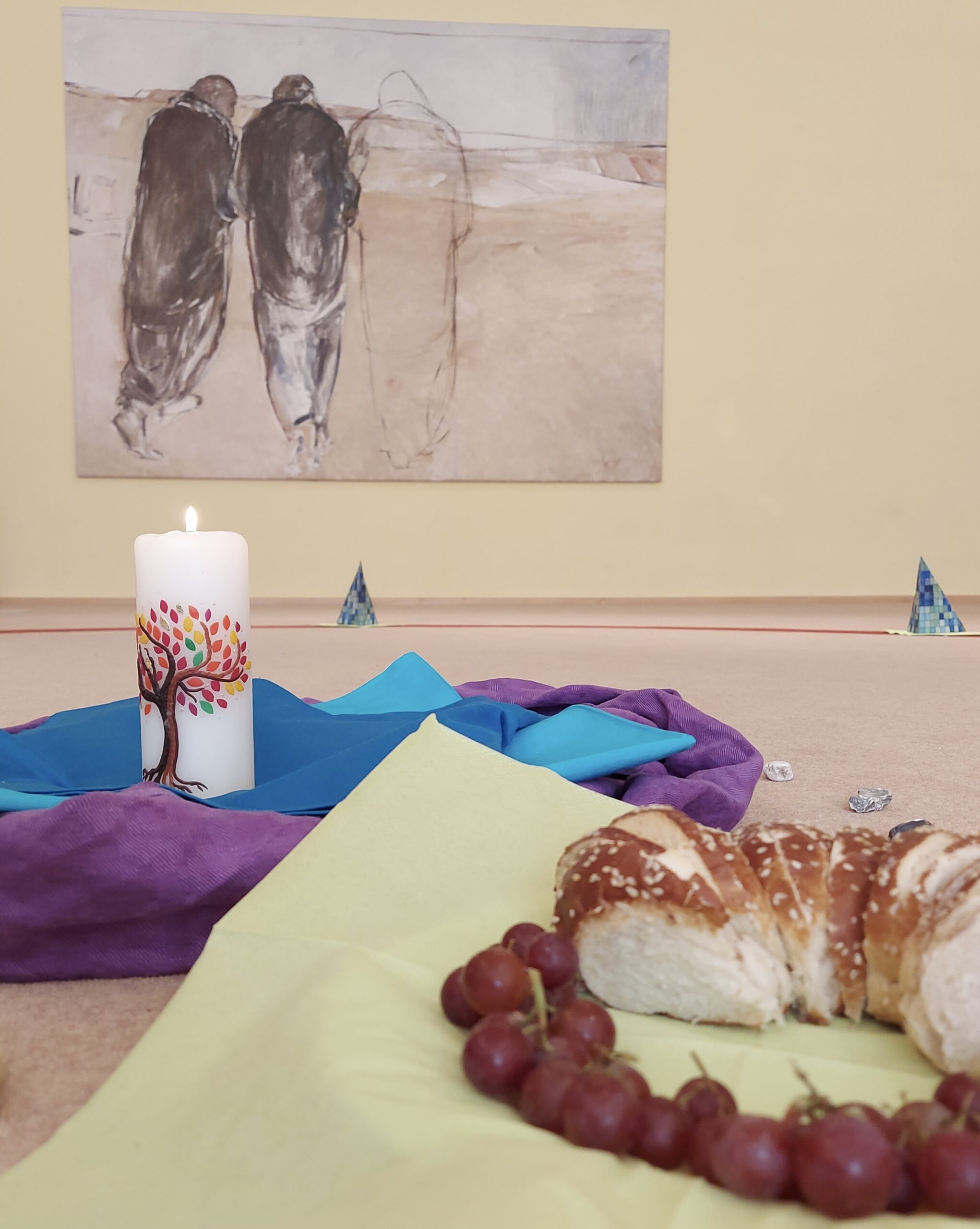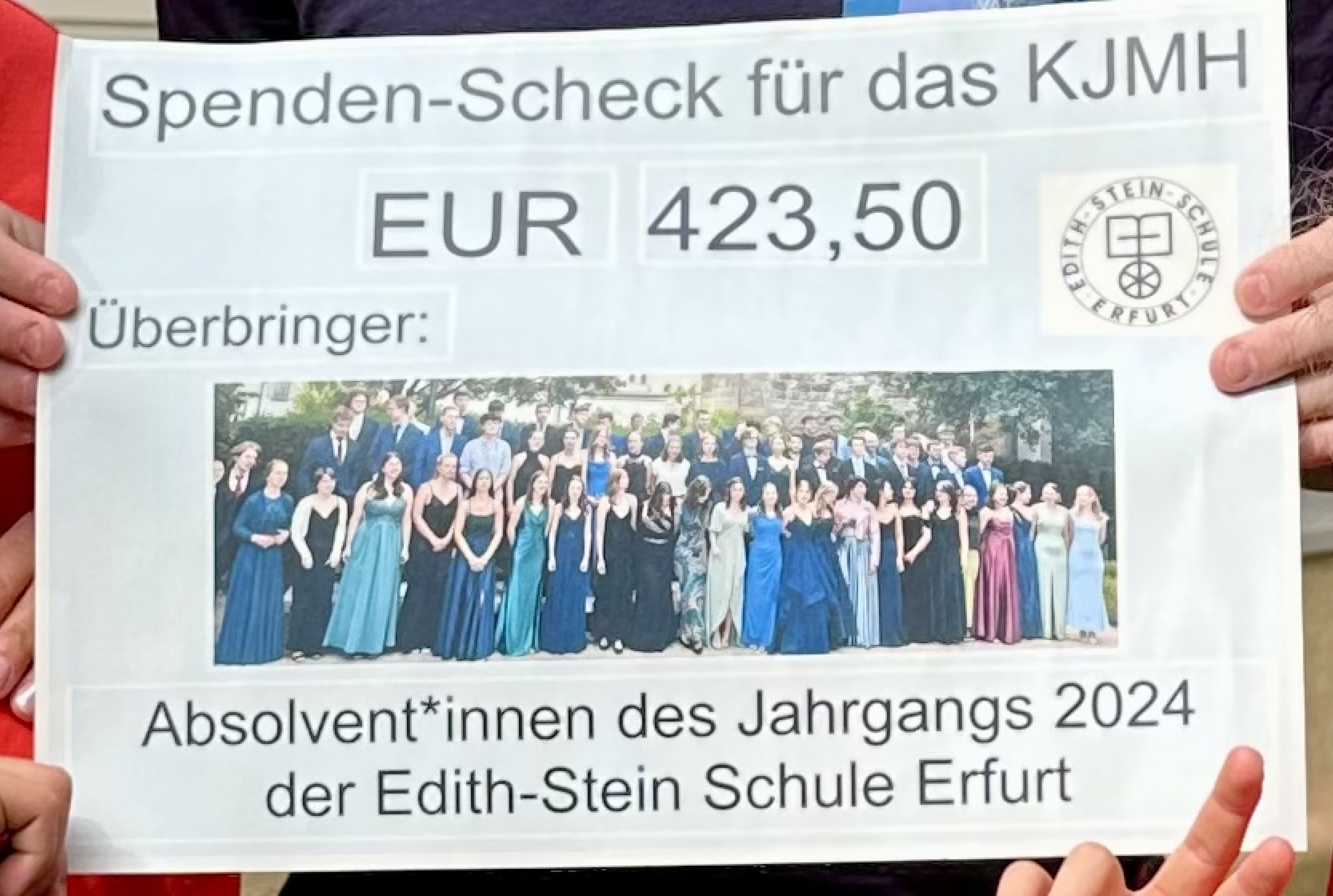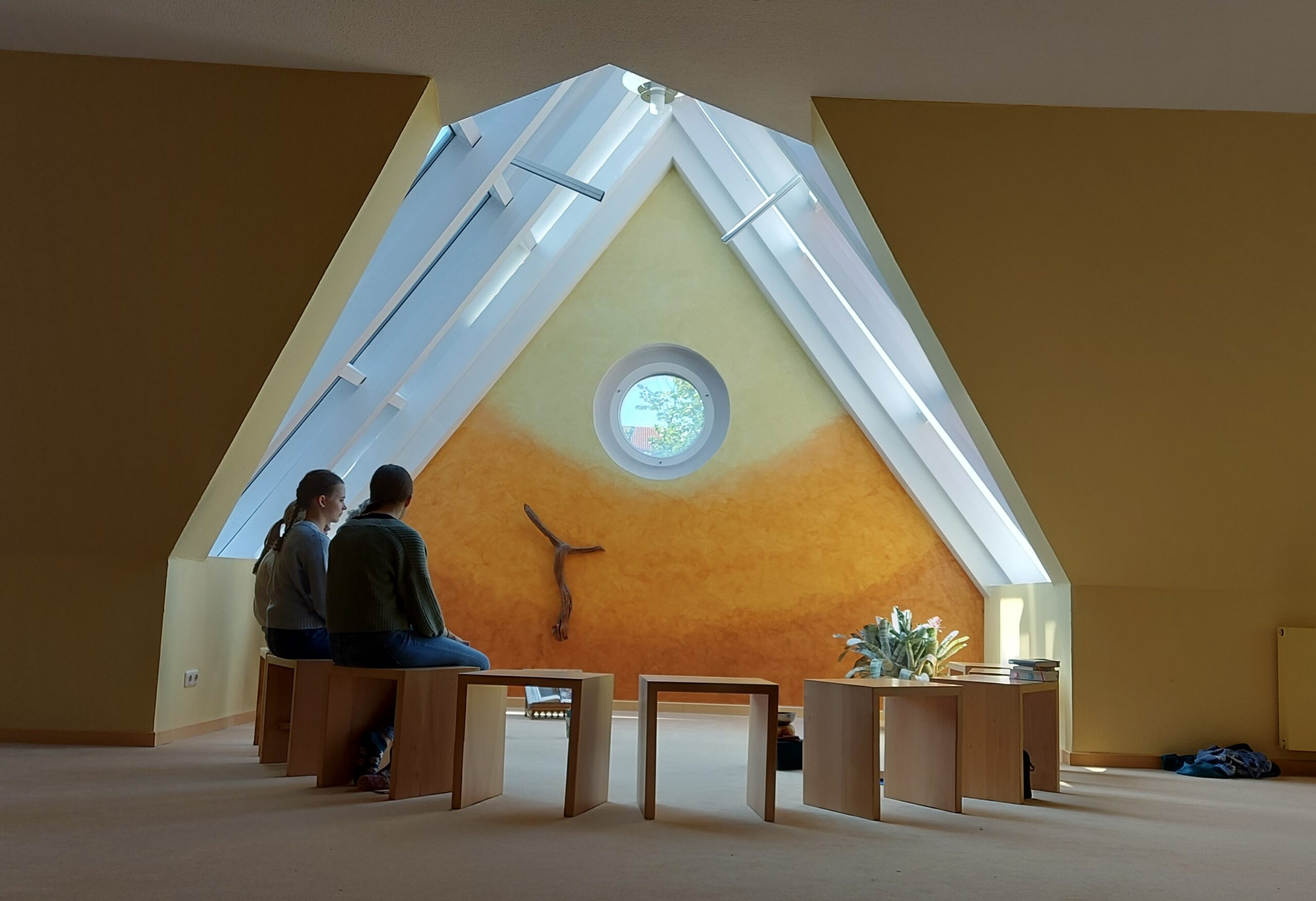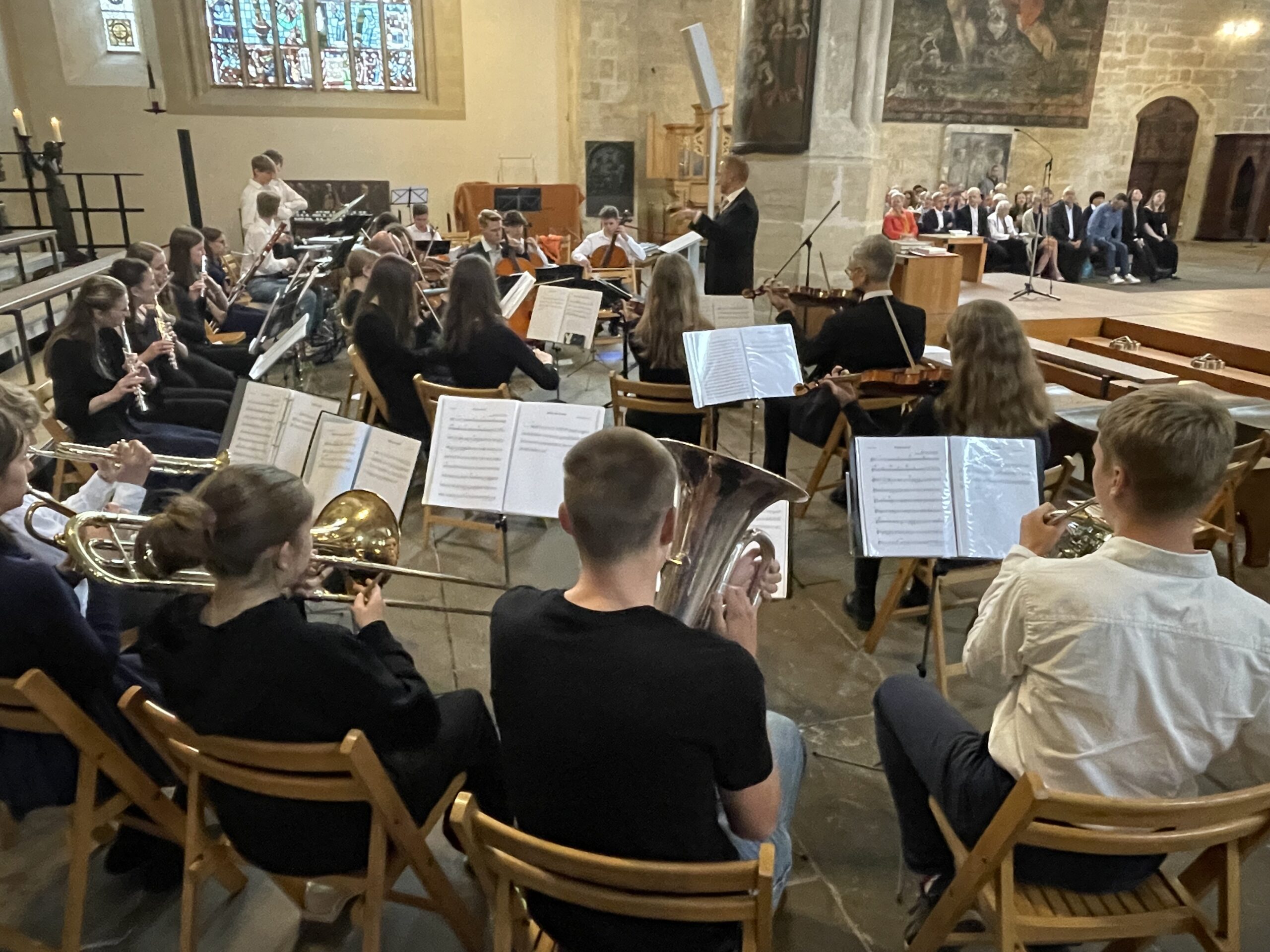 Singend zogen die Gottesdienstbesucher anschließend gegenüber ins Haus der Versöhnung zum zweiten Teil des Gottesdienstes. Sängerinnen und Sänger des VoicESS-Kammerchores der Edith-Stein-Schule Erfurt unter der Leitung von Ekkehard Fellner gestalteten den Gottesdienst musikalisch. Unter dem Leitwort „Frieden und Versöhnung“ wählten sie mehrstimmige Werke in verschiedenen Sprachen aus: „Fix You“ und „Bleib mit deiner Gnade“, dazu noch „Freunde, dass der Mandelzweig“, und „Hevenu shalom alejchem“. Magnus begleitete die Lieder am Klavier und beschloss die Andacht mit dem Chopins Prélude in Des-Dur.