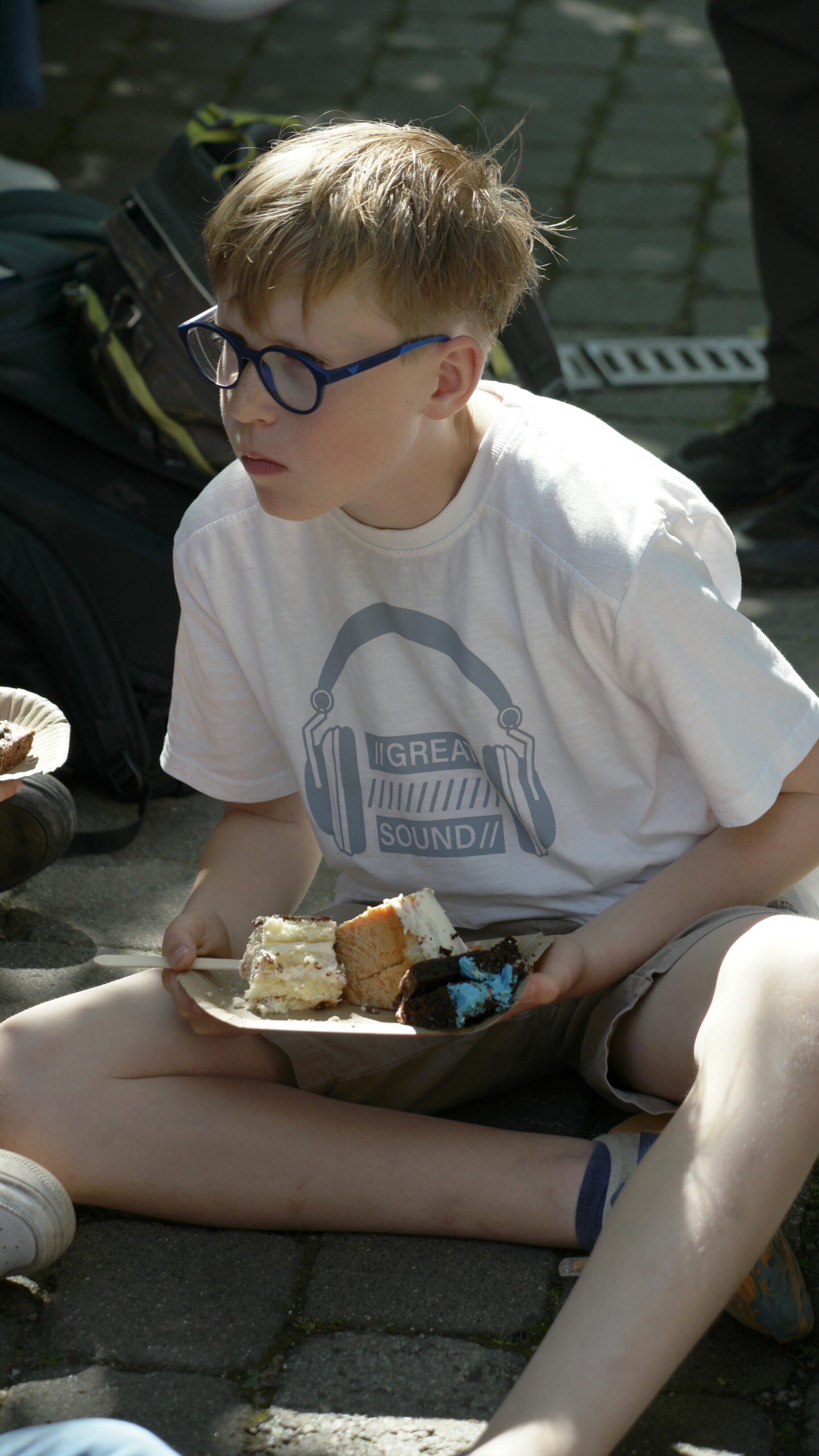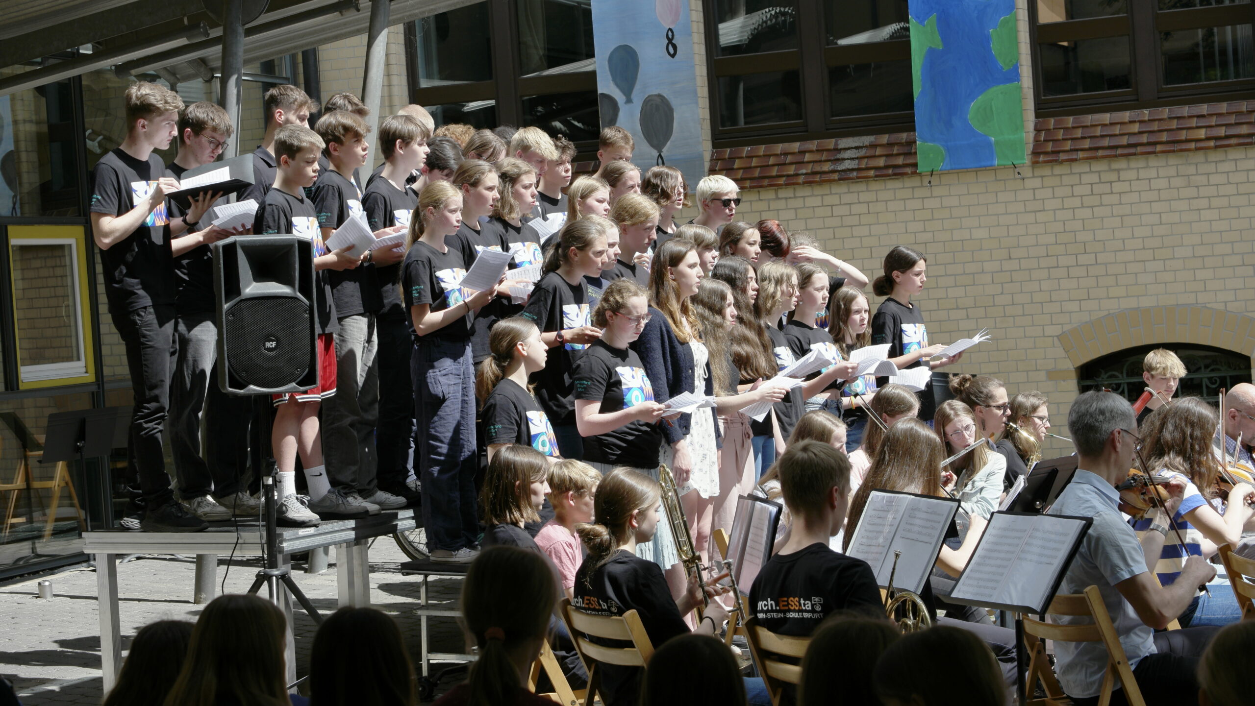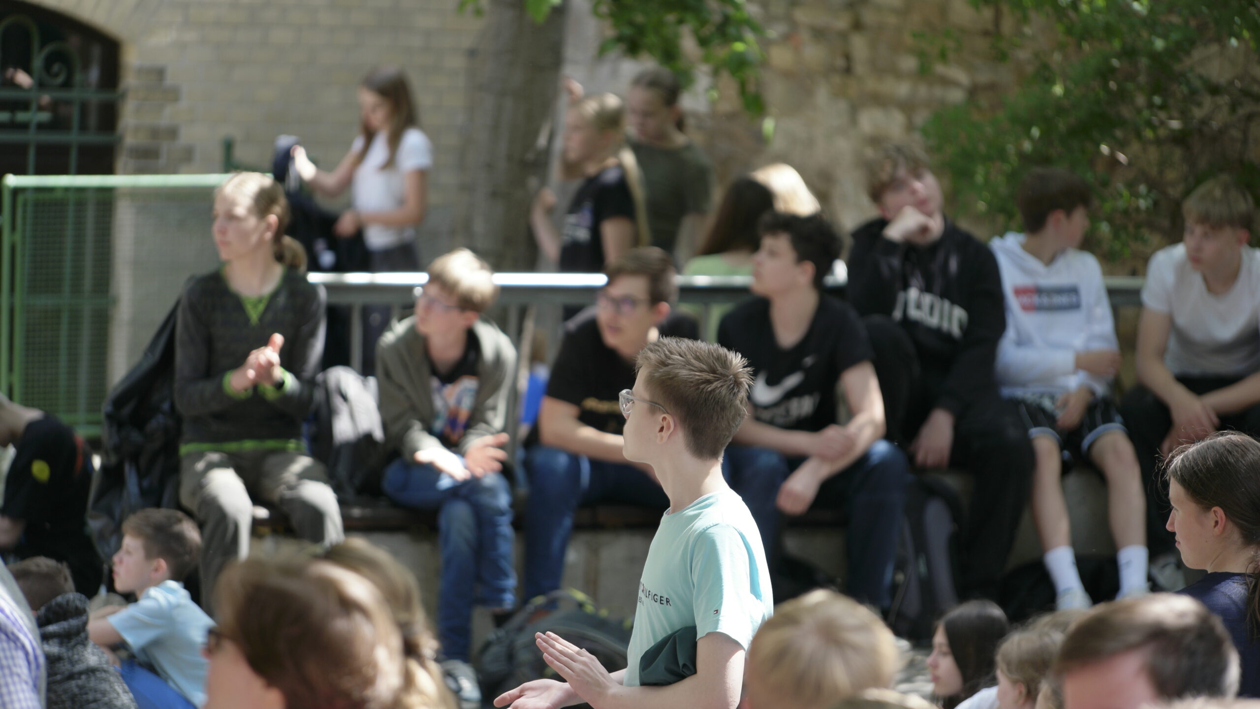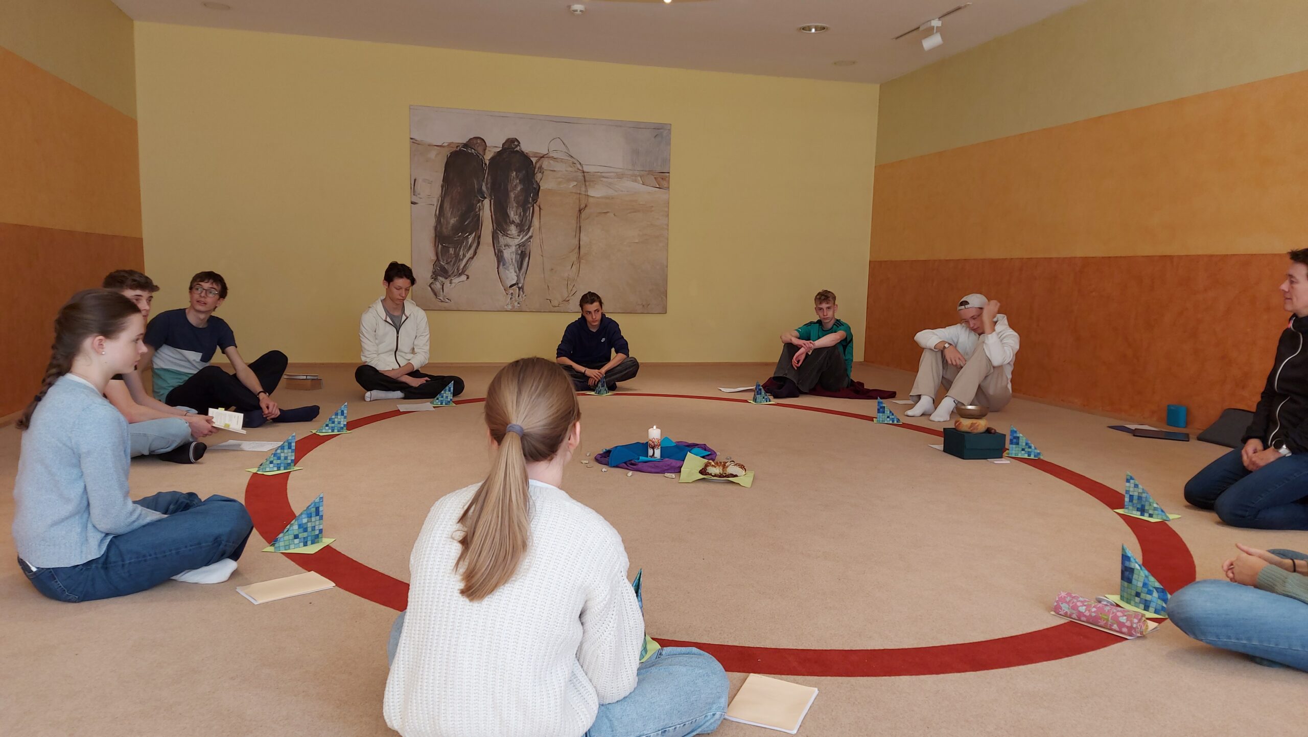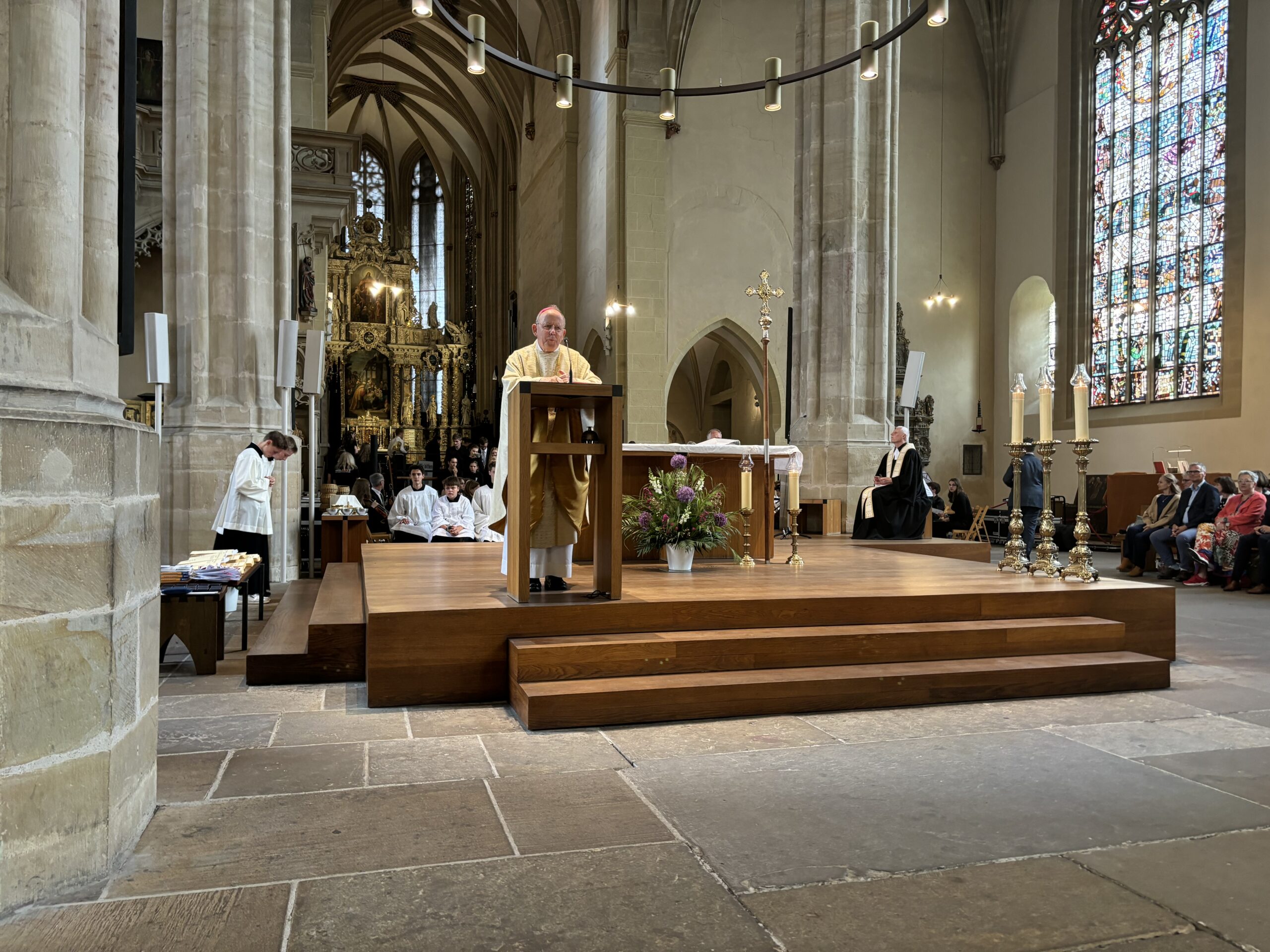 Singend zogen die Gottesdienstbesucher anschließend gegenüber ins Haus der Versöhnung zum zweiten Teil des Gottesdienstes. Sängerinnen und Sänger des VoicESS-Kammerchores der Edith-Stein-Schule Erfurt unter der Leitung von Ekkehard Fellner gestalteten den Gottesdienst musikalisch. Unter dem Leitwort „Frieden und Versöhnung“ wählten sie mehrstimmige Werke in verschiedenen Sprachen aus: „Fix You“ und „Bleib mit deiner Gnade“, dazu noch „Freunde, dass der Mandelzweig“, und „Hevenu shalom alejchem“. Magnus begleitete die Lieder am Klavier und beschloss die Andacht mit dem Chopins Prélude in Des-Dur.