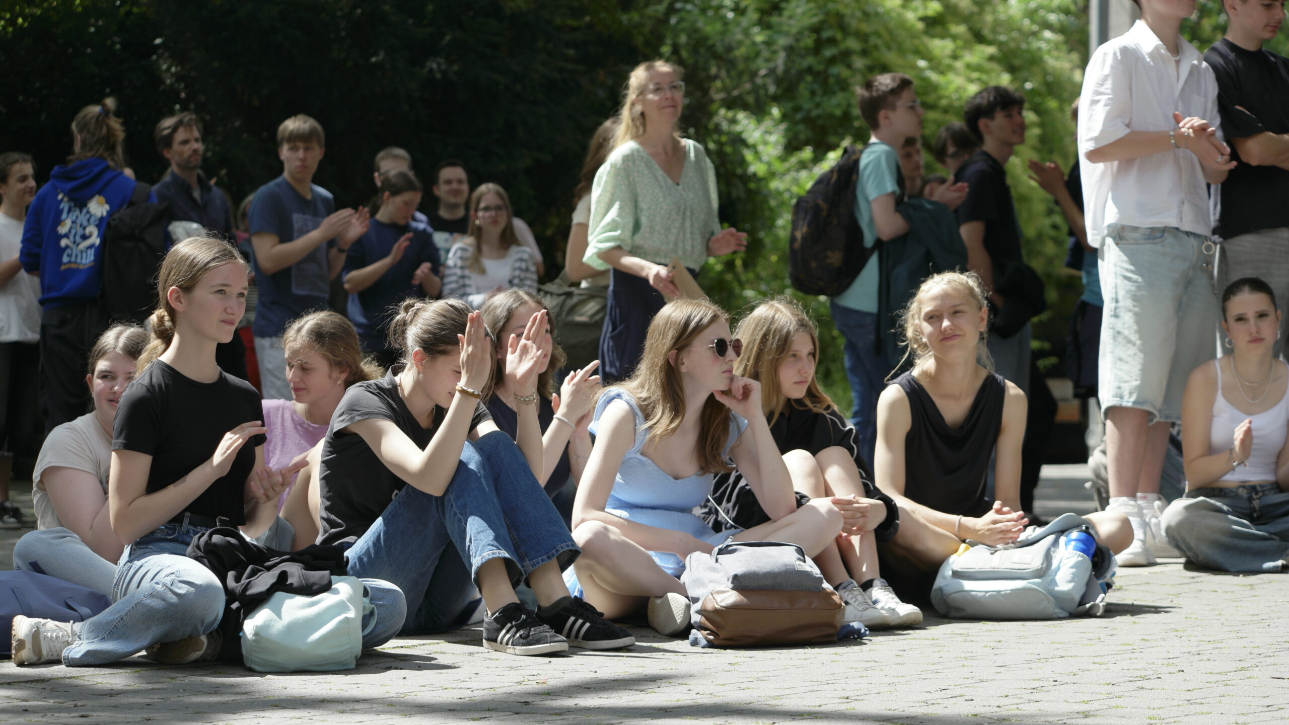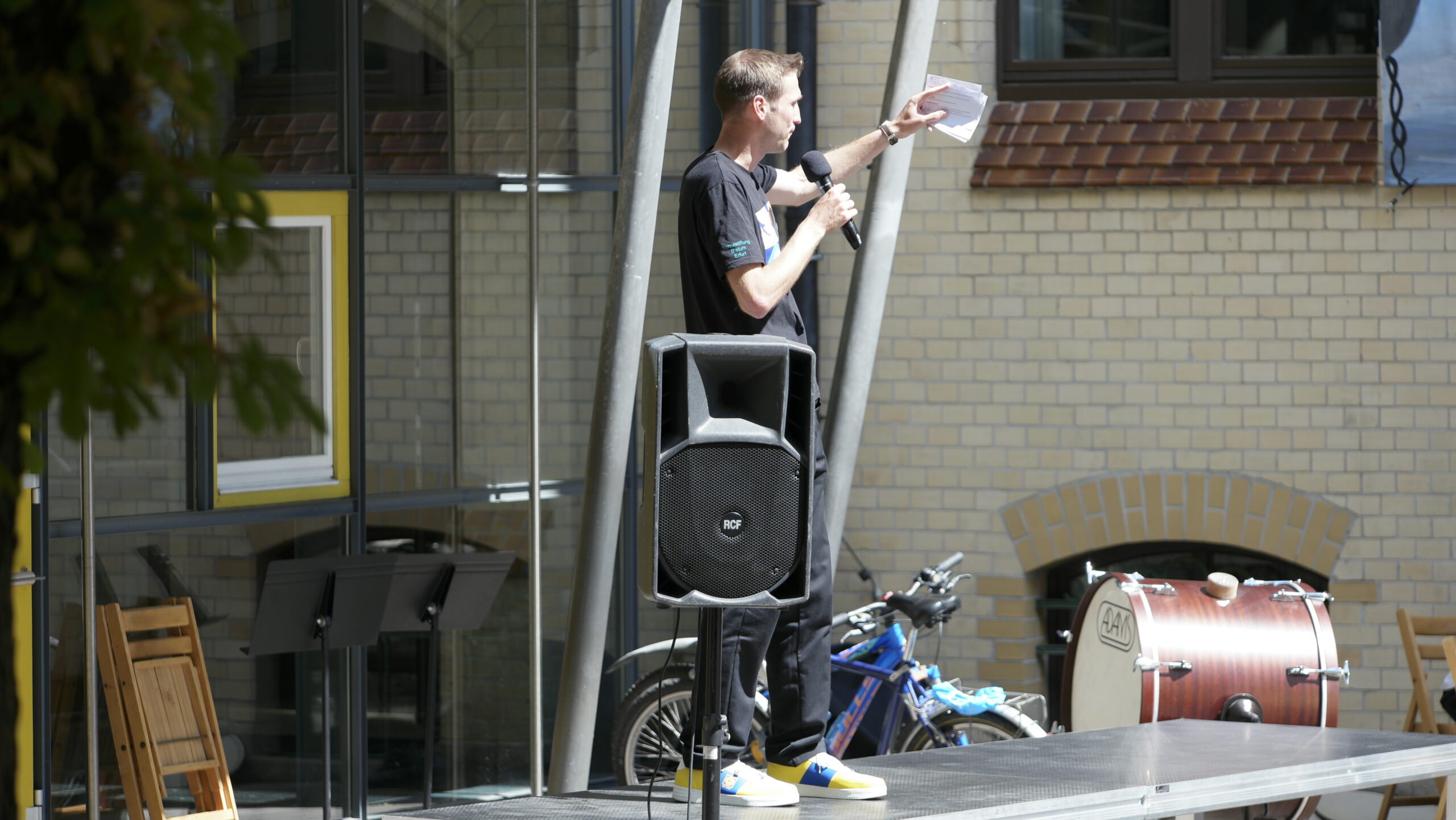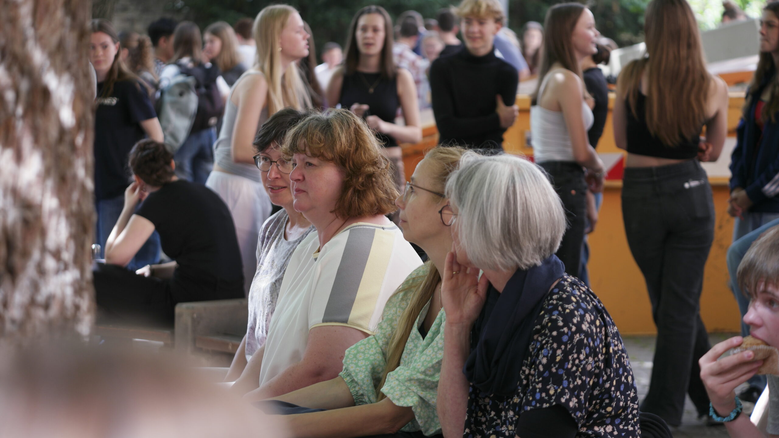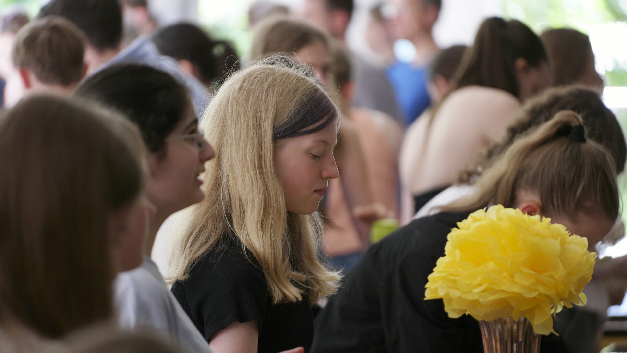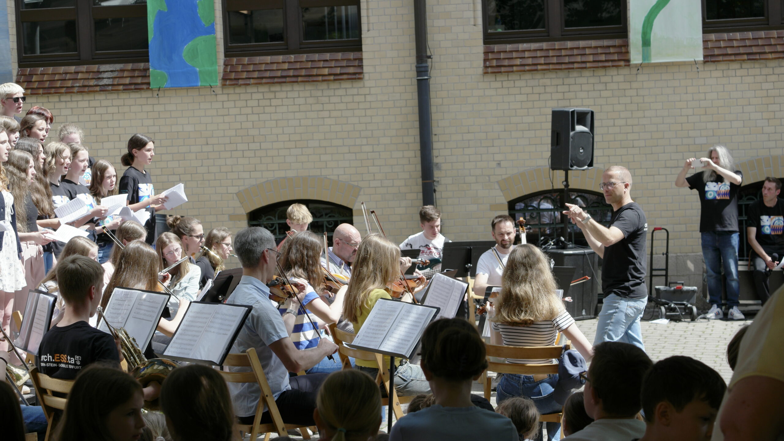 Singend zogen die Gottesdienstbesucher anschließend gegenüber ins Haus der Versöhnung zum zweiten Teil des Gottesdienstes. Sängerinnen und Sänger des VoicESS-Kammerchores der Edith-Stein-Schule Erfurt unter der Leitung von Ekkehard Fellner gestalteten den Gottesdienst musikalisch. Unter dem Leitwort „Frieden und Versöhnung“ wählten sie mehrstimmige Werke in verschiedenen Sprachen aus: „Fix You“ und „Bleib mit deiner Gnade“, dazu noch „Freunde, dass der Mandelzweig“, und „Hevenu shalom alejchem“. Magnus begleitete die Lieder am Klavier und beschloss die Andacht mit dem Chopins Prélude in Des-Dur.