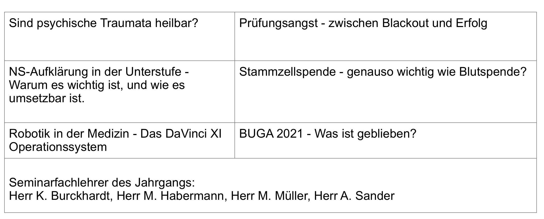 Insgesamt hatten sich die SuS für anderthalb Jahre ernsthaft, kreativ und mit hervorragenden Ergebnissen in ihren Kolloquien mit ganz verschiedenen Themen auseinandergesetzt. So wurde über Prüfungsangst geforscht, das Vermächtnis der BUGA aus dem Jahre 2021 überprüft, untersucht, ob psychische Traumata heilbar sind, evaluiert, ob Stammzellspende genauso wichtig ist wie Blutspende sowie der Einsatz von Robotik in der Medizin genauer betrachtet und erwägt, ob und wie NS-Aufklärung in der Unterstufe möglich ist. Gemeinsam mit ihren innerschulischen und außerschulischen Betreuern, den Seminarfachlehrern und mit der Unterstützung ihrer Familien hatten alle SuS viel Kraft, Zeit und Arbeit investiert und das letztlich mit herausragenden Präsentationen im Kolloquium Ende Januar.