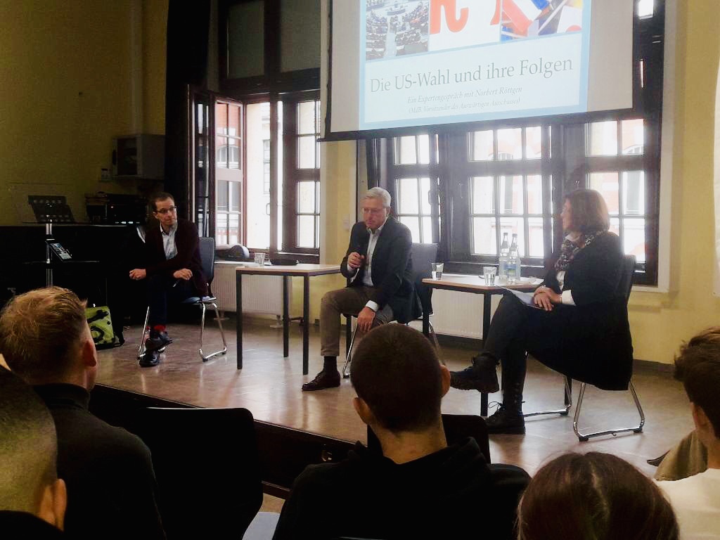 In diesem Jahr steht wieder eine US-Präsidentschaftswahl an. Und wieder wird der Wahlkampf stark polarisierend und für europäische Beobachter befremdlich geführt. Im Rahmen des Sozialkundeunterrichts der 11. und 12. Klasse gelang es nun dieses Expertengespräch mit Norbert Röttgen durchzuführen. Als Vorsitzender des Auswärtigen Ausschusses im Bundestag konnte er den Schülern eine Stunde als Experte Rede und Antwort stehen. So drehten sich viele Fragen um Einschätzungen zum Wahlausgang. Herr Röttgen antwortete ehrlich und manchmal auch persönlich, wenn er seine Meinung über den US-Wahlkampfstil deutlich machte.
