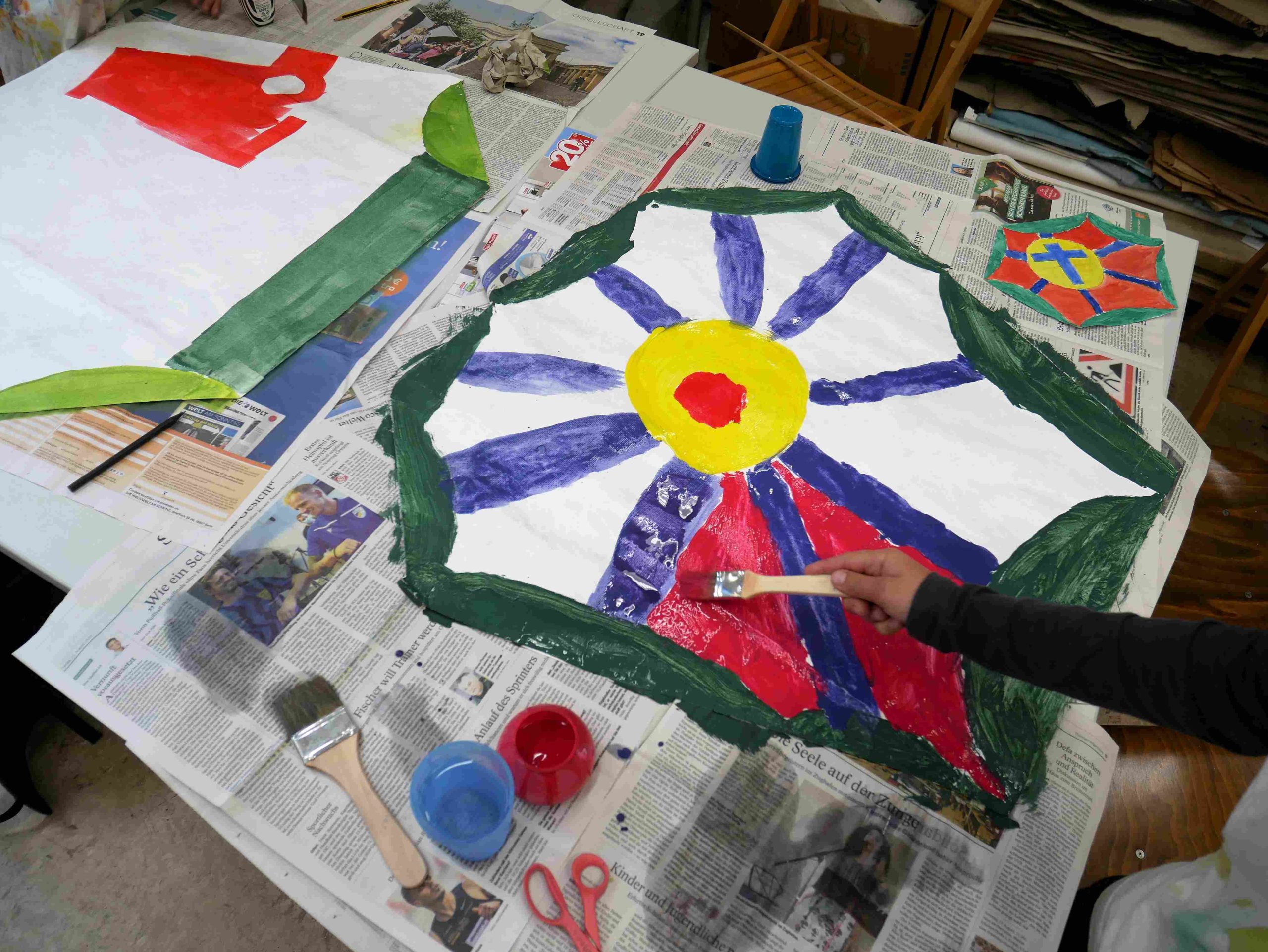 Es ist sicher ungewöhnlich, wenn in der Ursulinenkirche plötzlich Drachen auftauchen. Nicht so, wenn die Schüler der 5. Klassen ihren Drachenprojekttag beenden. Aber alles der Reihe nach. Drachen müssen ja zunächst konstruiert werden, um in der Luft fliegen zu können. So standen die erste Stunden der Klasse 5 ganz im Zeichen der Mathematik mit ihren Winkeln und Ecken. Nachdem diese Hürde geschafft war, ging es in die Kunsträume, um schließlich kreativ an den Drachen zu arbeiten. Jeder hatte sein Lieblingsmotiv vorgezeichnet und konnte nun unter einer riesigen Farbauswahl den Ideen freien Lauf lassen. Nur gut, dass alle Schüler Schutzkleidung getragen haben. Die zunächst einseitig fertig gestellten Drachen gingen nun in den Trockner. Am Ende wurde es wie immer hektisch, alles musste aufgeräumt und gesichert werden. Vor allem die 5b hatte es aufgrund ihres anschließenden Gottesdienstes eilig. Als der Klassenlehrer der mit den Worten: „Ihr dürft heute auch dreckig und bunt in die Kirche gehen!“ aufrief, waren einige Jungs sehr erfreut, ein paar Mädchen doch etwas irritiert und schnell entschwunden, um doch noch eine korrekte Kleiderordnung für den Gottesdienst herzurichten.