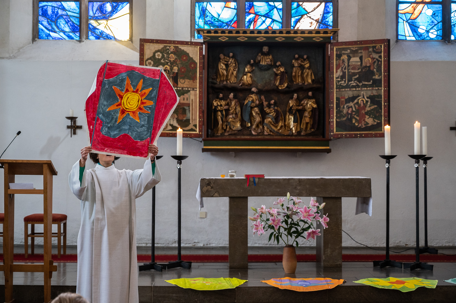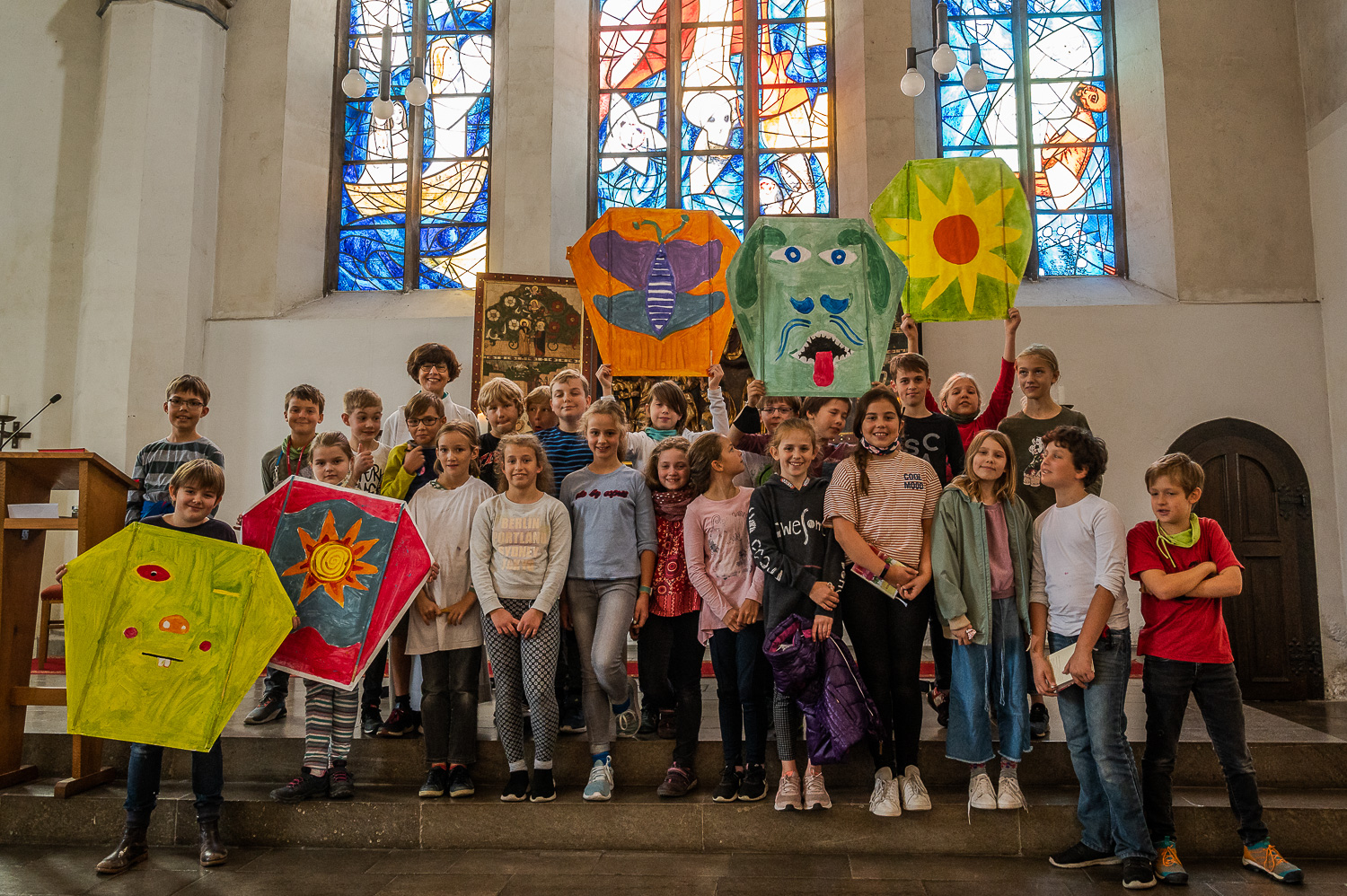 So freute sich unsere Schulseelsorgerin Frau Henning-Schönemann auf die bunte 5b, schließlich feiert die Kirche in diesen Tagen das ebenso bunte Erntedankfest, die Drachen lieferten hierzu einen passenden, bunten Rahmen.