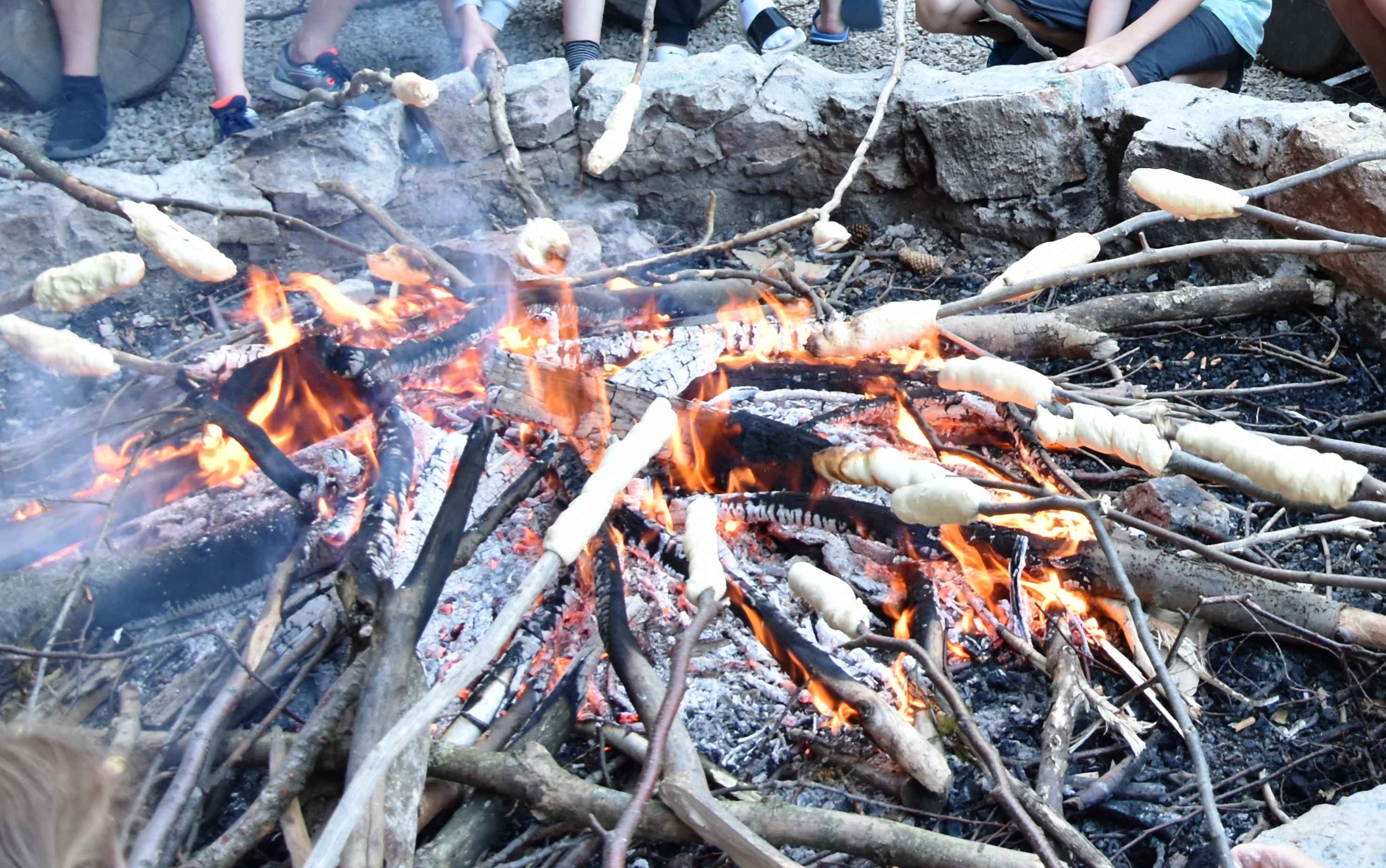 Nach einer gefühlt endlos langen heißen Fahrt in einem viel zu kleinem Waggon der DB mit weiteren sechs Klassen kamen wir endlich in Sondershausen an. Der Bus ließ lange auf sich warten, aber brachte uns dann schließlich auf den Berg und wir konnten unsere schicken Bungalows mitten im Wald auf dem Possen beziehen. Nach dem Mittag auf der Schlossterrasse ging es auch schon los: Wir trafen uns vor dem Kletterwald und nach einer kurzen Eiweisung und dem Anschnallen des Klettergeschirrs durften wir losklettern. Jakob schoss die Fotos während wir auf fünf Parcours mit unterschiedlichen Schwierigkeitsgraden die Höhen meisterten. Wir waren geschafft, als wir die Helme von unseren heißen Köpfen nehmen konnten. Ein 4 km langer schattiger Spaziergang zum Rondell mit weitem Blick zum Brocken und zum Kyffhäuserdenkmal ermöglichte das Sammeln von Brennholz und Stockbrotstöcken. Am heißen Lagerfeuer endete der erste Tag mit heißem Stockbrot und Liedern der 7b zur Gitarre.