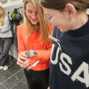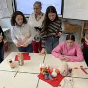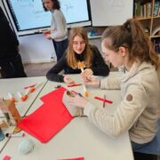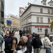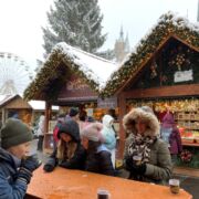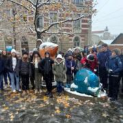 Und nun waren die Austauschschüler bei uns. Pünktlich zur Eröffnung des Weihnachtsmarktes am 28. November 2023 waren dicke Flocken gefallen und Erfurt hatte sich in eine winterliche Stadtlandschaft verwandelt. Dieser Anblick hatte die neugierigen Gäste bereits bei ihrer Anreise am Montagabend ganz verzaubert. Am Dienstag startete der Tag mit einem Begrüßungsprogramm der Klasse 6d für unsere französischen Gäste. Die Schulrallye lag in der Verantwortung der Klassen 7 und 11 (eA) und die Stadtführung durch die verschneiten Gassen übernahmen die Klassen 9 und 11 (3. Fremdsprache). Damit war es sehr vielen Französischlernenden möglich, mit unseren Gästen ins Gespräch zu kommen und ihren Beitrag zum Gelingen des Austauschs zu leisten. Die Besichtigung des Carillons im Barthalomäusturm war sicherlich nicht nur für die Franzosen eines der Highlights des Tages. Wir danken Frau Bourvé, dass sie für uns das riesige Glockenspiel von Erfurt zum Klingen gebracht hat.