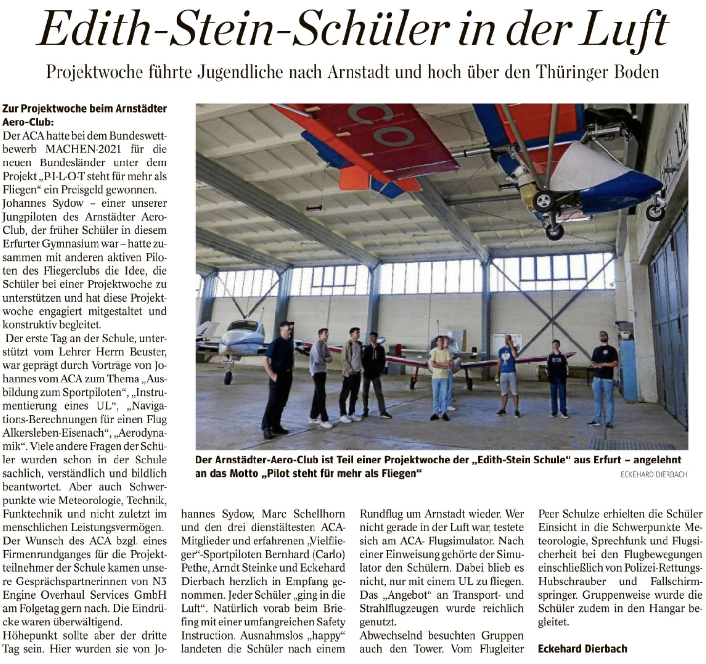 .. so titelte die TA am 14.07.2023 auf ihrer lokalen Leserseite. Ein Projekt rund ums Fliegen, das war das Angebot für 12 Schüler der siebten bis elften Klasse im Rahmen der diesjährigen Projekttage in Zusammenarbeit mit dem Aeroclub Arnstadt und Unterstützung durch unseren FöV. Von der Theorie über das Spielen am Simulator bis hin zum „echten“ Flug war alles dabei. Ein kurzes Video und ein Bericht der Schüler lassen die Eindrücke aufleben. Mehr…