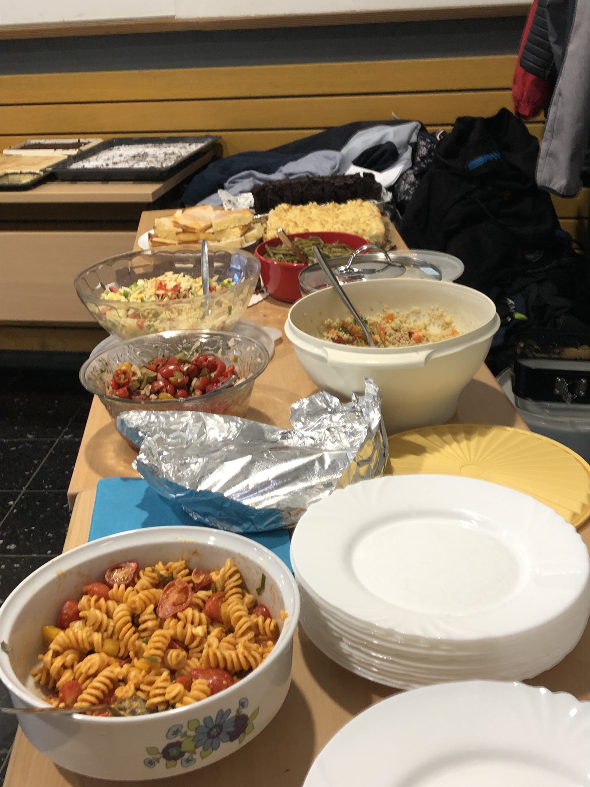 Viele der Präsentierenden nutzen natürlich auch das Ehemaligentreffen am nächsten Tag für einen weiteren Austausch untereinander. Aus unterschiedlichsten Jahrgängen kamen Absolventen der ESS im Foyer und auf den Hof zusammen, teilweise auch mit dem jüngsten Nachwuchs, um in Erinnerungen zu schwelgen und den anwesenden Lehrkräften über den eigenen Werdegang zu berichten. Die 11er und 12er hatten für den entsprechenden Rahmen ein tolles Kuchen- und Salatbuffet vorbereitet, Herr Lehmann hielt den Grill über Stunden am Laufen und sorgte für Nachschub und weitere Lehrerinnen schenkten Getränke aus. Danke an alle fleißigen Helfer, die Anwesenden wussten das kulinarische Angebot auf jeden Fall zu schätzen.